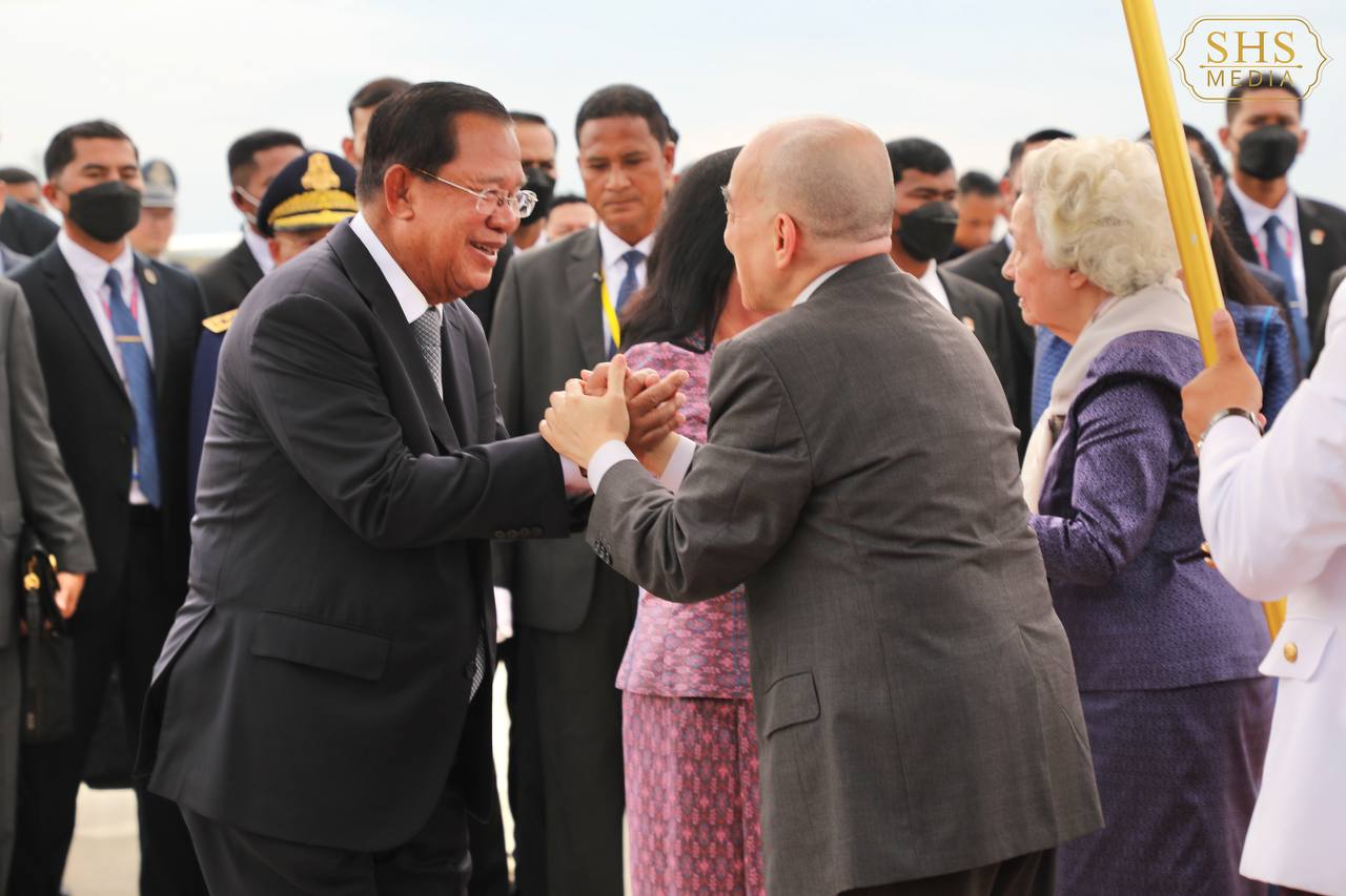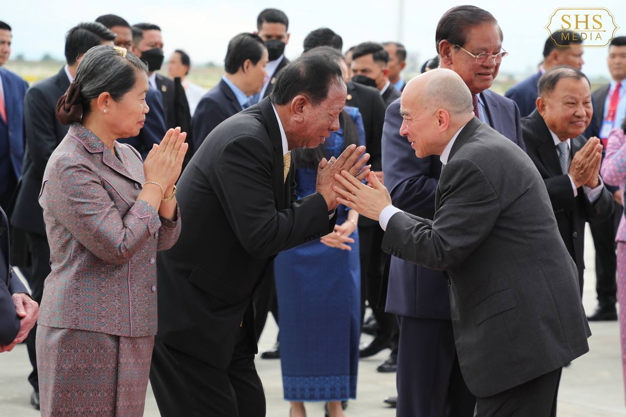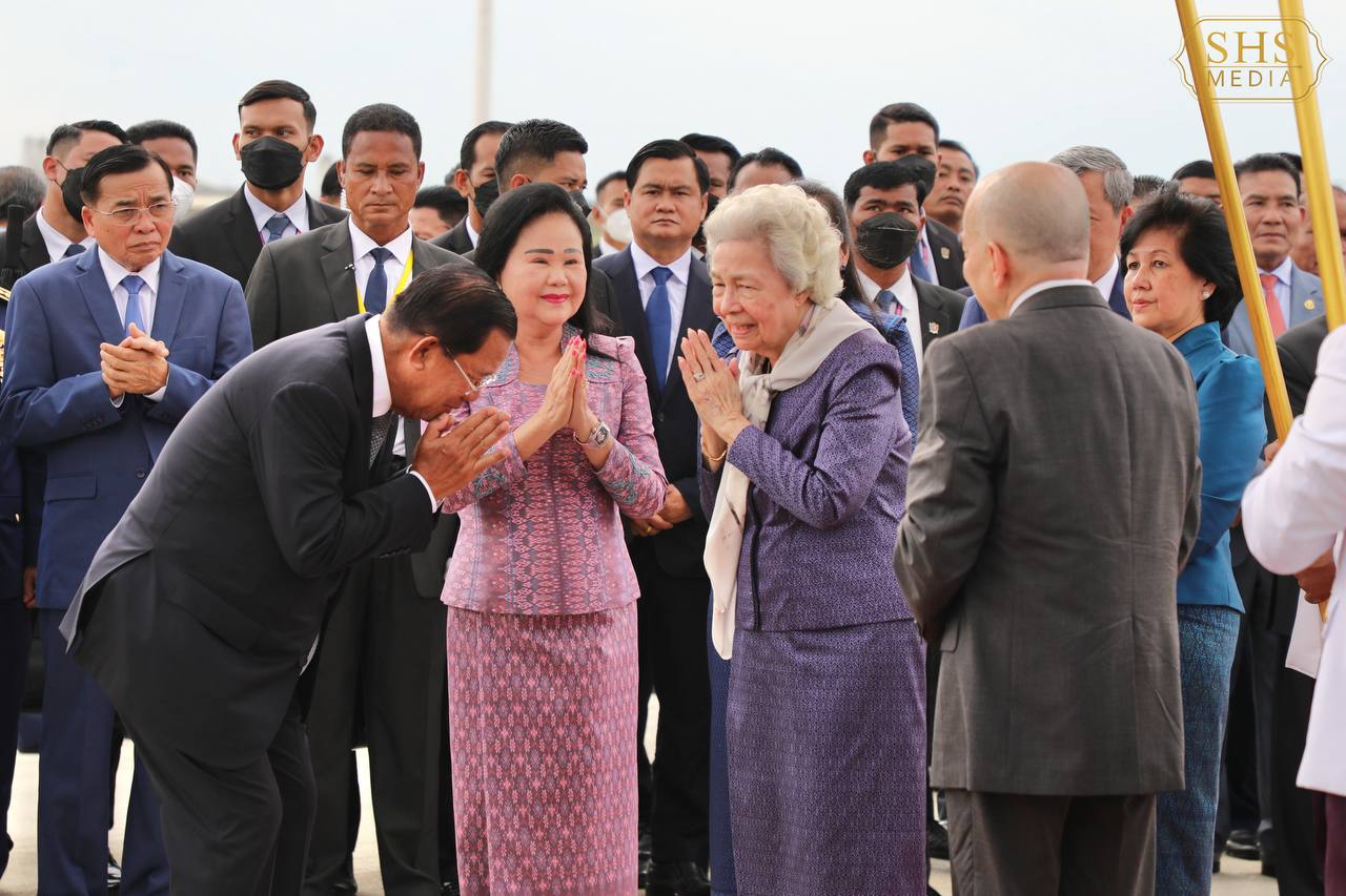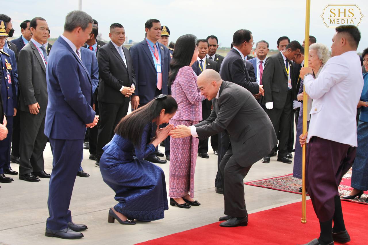 យាង និងអញ្ជើញថ្វាយព្រះរាជដំណើរយាងមកដល់របស់ព្រះអង្គទាំងទ្វេ នៅឯព្រលានយន្តហោះអន្តរជាតិតេជោ មានវត្តមានសម្ដេចអគ្គមហាសេនាបតីតេជោ ហ៊ុន សែន ប្រធានក្រុមឧត្ដមប្រឹក្សាផ្ទាល់ព្រះមហាក្សត្រ និងជាប្រធានព្រឹទ្ធសភានៃព្រះរាជាណាចក្រកម្ពុជា និងសម្ដេចកិត្តិព្រឹទ្ធបណ្ឌិត ប៊ុន រ៉ានី ហ៊ុនសែន សម្ដេចអគ្គមហាពញាចក្រី ហេង សំរិន ប្រធានកិត្តយសនៃឧត្ដមប្រឹក្សាផ្ទាល់ព្រះមហាក្សត្រ សម្តេចមហាបវរធិបតី ហ៊ុន ម៉ាណែត នាយករដ្ឋមន្ត្រីនៃព្រះរាជាណាចក្រកម្ពុជា និងលោកជំទាវបណ្ឌិត ពេជ ចន្ទមុន្នី ហ៊ុនម៉ាណែត ព្រមទាំង សម្ដេចឯកឧត្ដម លោកជំទាវ ជាសមាជិកសមាជិកា ឧត្ដមប្រឹក្សាផ្ទាល់ព្រះមហាក្សត្រ និងមន្ត្រីអ្នកមុខអ្នការជាច្រើនរូបទៀត ។