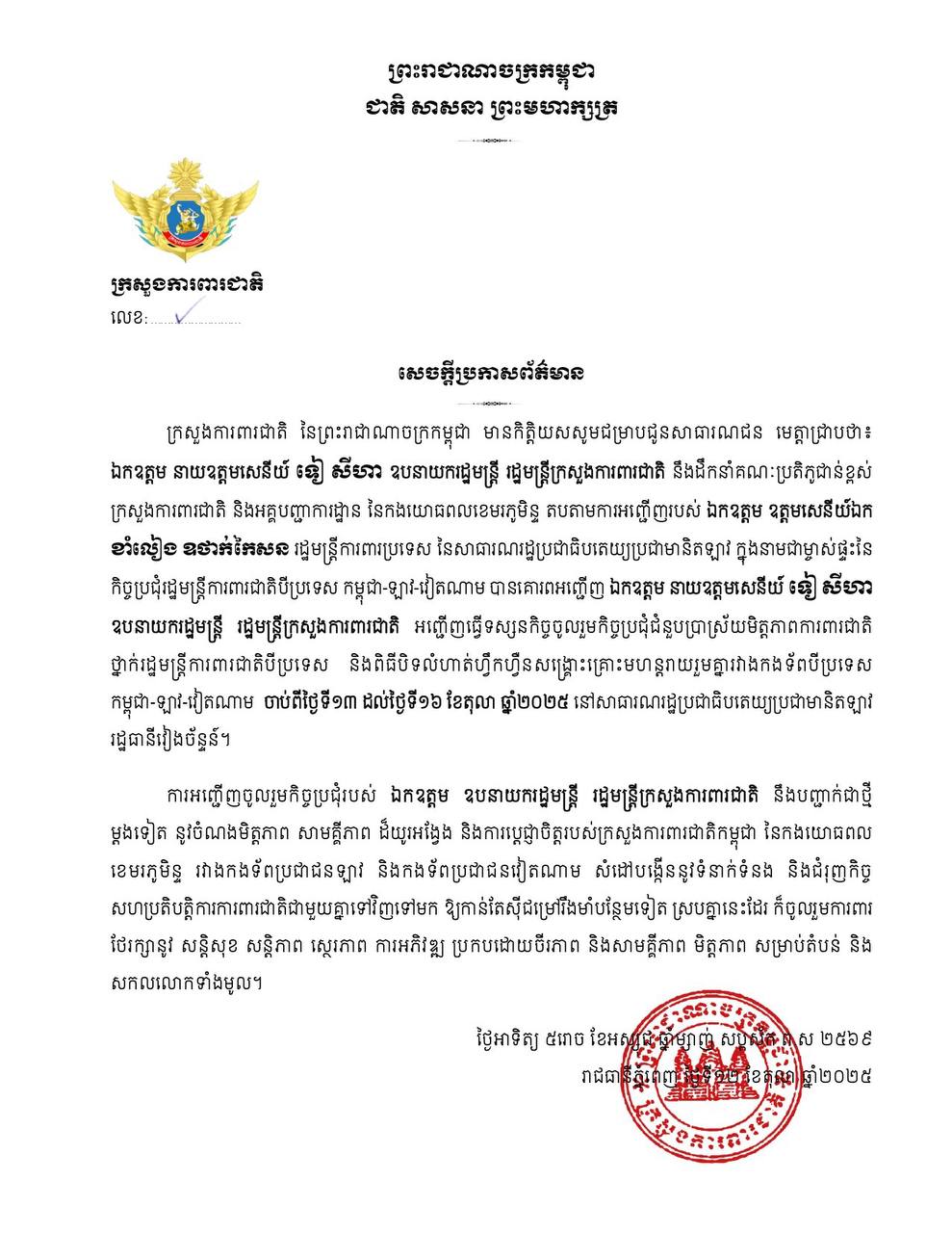 នៅក្នងនោះដែរ ក្រសួងការពារជាតិ បានប្រកាសនៅលើផេកផ្លូវការថា ៖ ឯកឧត្តម នាយឧត្តមសេនីយ៍ ទៀ សីហា ឧបនាយករដ្ឋមន្ត្រី រដ្ឋមន្ត្រីក្រសួងការពារជាតិ នឹងអញ្ជើញចូលរួមកិច្ចប្រជុំជំនួបប្រាស្រ័យមិត្តភាពការពារជាតិ ថ្នាក់រដ្ឋមន្ត្រីការពារជាតិបីប្រទេស និងពិធីបិទលំហាត់ហ្វឹកហ្វឺន សង្គ្រោះគ្រោះមហន្តរាយរួមគ្នា រវាងកងទ័ពបីប្រទេស កម្ពុជា-ឡាវ-វៀតណាម ចាប់ពីថ្ងៃទី១៣ ដល់ថ្ងៃទី១៦ ខែតុលា ឆ្នាំ២០២៥ នៅរដ្ឋធានីវៀងច័ន្ទន៍ សាធារណរដ្ឋប្រជាធិបតេយ្យប្រជាមានិតឡាវ ។