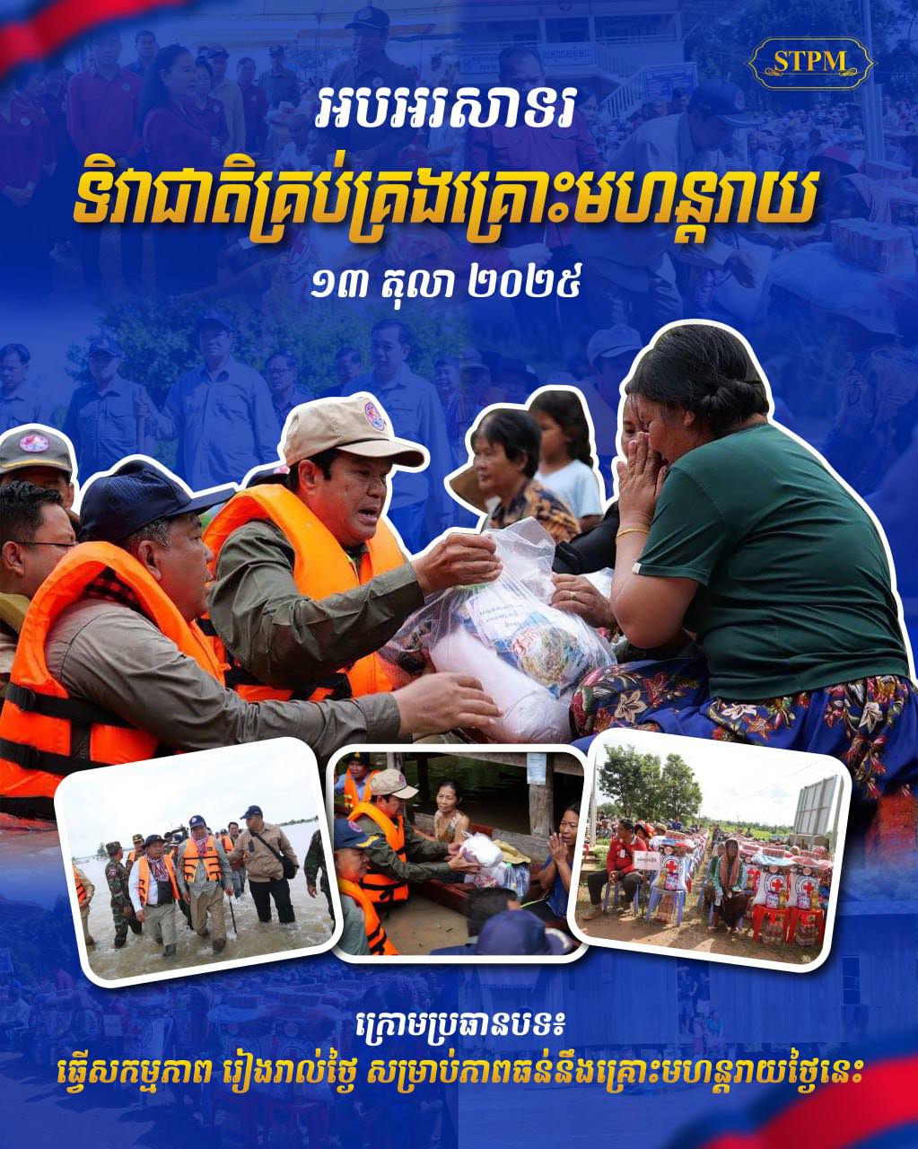 រាជធានីភ្នំពេញ ៖ សម្តេចមហាបវរធិបតី ហ៊ុន ម៉ាណែត នាយករដ្ឋមន្ត្រីកម្ពុជាបានប្រកាសនៅលើផេកផ្លូវការរបស់សម្តេចនាព្រឹកថ្ងៃទី១៣ ខែតុលា ឆ្នាំ២០២៥នេះថា ៖ ប្រធានបទដែលត្រូវបានលើកយកមកប្រារព្ធទិវាជាតិគ្រប់គ្រងគ្រោះមហន្តរាយ នាឱកាសនេះ ស្របជាមួយទិវាអាស៊ានគ្រប់គ្រងគ្រោះមហន្តរាយ និងទិវាអន្តរជាតិ សម្រាប់ការកាត់បន្ថយគ្រោះមហន្តរាយ ដែលជាការផ្សារភ្ជាប់ កិច្ចខិតខំប្រឹងប្រែងថ្នាក់ជាតិ រួមជាមួយថ្នាក់តំបន់ និងអន្តរជាតិ អំពីសារៈសំខាន់នៃការកាត់បន្ថយហានិភ័យ គ្រោះមហន្តរាយ និងការបង្ហាញអំពីជំហរ ការប្តេជ្ញាចិត្ត និងសាមគ្គីភាពរបស់ប្រជាជាតិអាស៊ាន ។