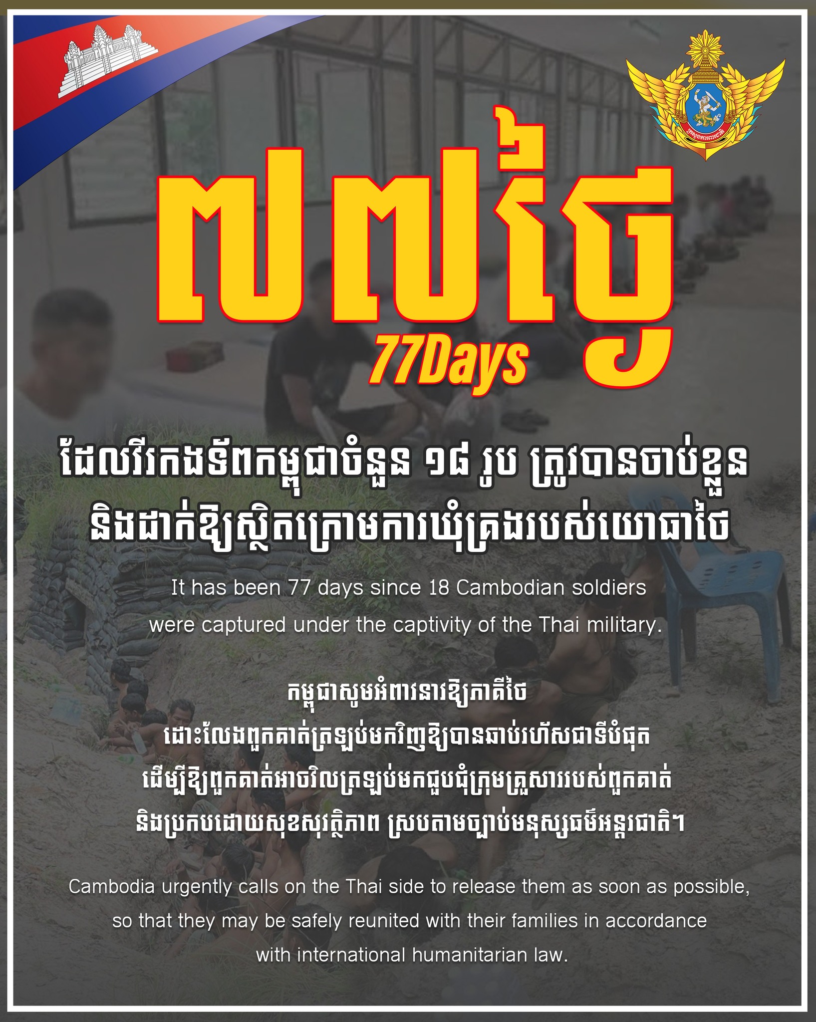 រាជធានីភ្នំពេញ ៖ ក្រសួងការពារជាតិនៃព្រះរាជាណាចក្រកម្ពុជា បានប្រកាសនៅលើផេកផ្លូវការនាព្រឹកថ្ងៃទី១៤ ខែតុលា ឆ្នាំ២០២៥ បានឱ្យដឹងថា ៖ ថ្ងៃនេះជាថ្ងៃទី៧៧ហើយ ដែលវីរកងទ័ពកម្ពុជាចំនួន ១៨រូប ត្រូវបានចាប់ខ្លួន និងដាក់ឱ្យស្ថិតក្រោមការឃុំគ្រងរបស់យោធាថៃ ។