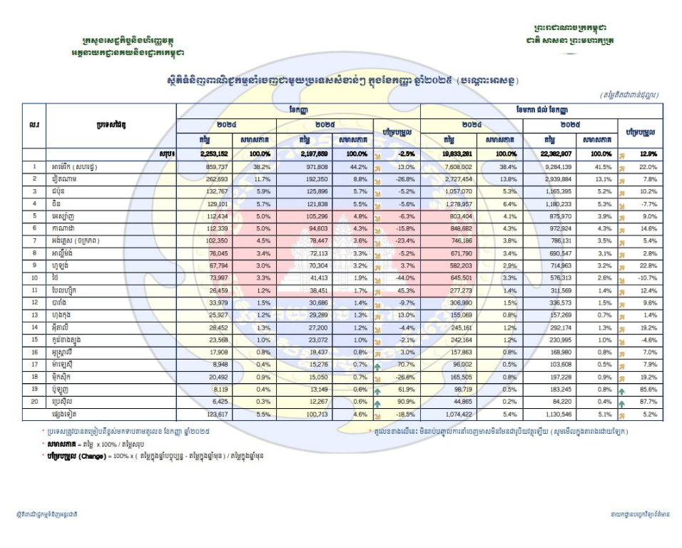 ប្រភពដដែលបានបន្តថា សម្រាប់រយៈពេល៩ខែនៃឆ្នាំ២០២៥នេះវិញការនាំចូលទំនិញពីថៃ គឺមានទំហំសរុប២,៣ពាន់លានដុល្លារ ធ្លាក់ចុះ៧,៦ភាគរយ ។