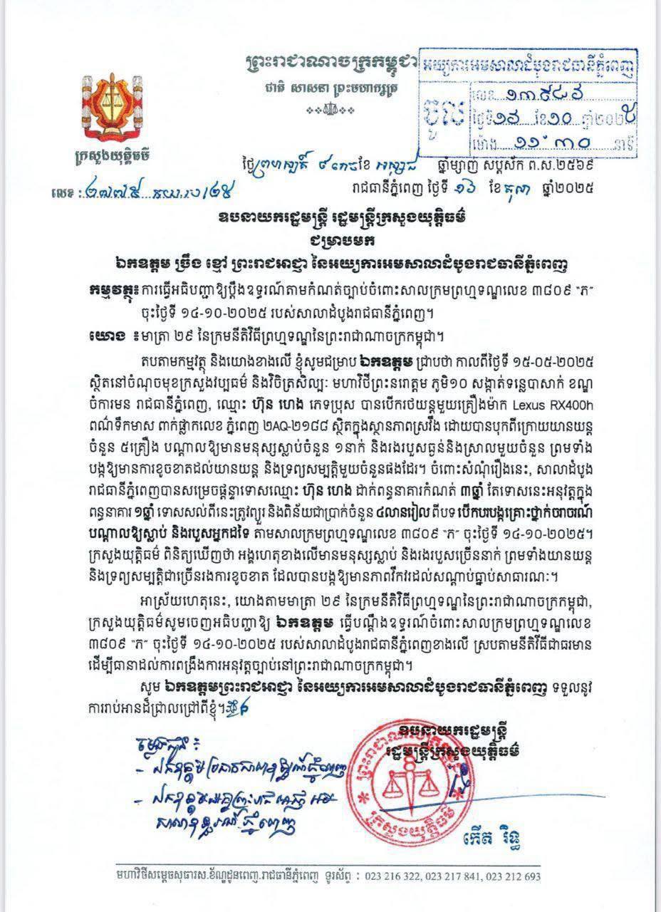 រាជធានីភ្នំពេញ ៖ ឯកឧត្តម កើត រិទ្ធ ឧបនាយករដ្ឋមន្ត្រី រដ្ឋមន្ត្រីក្រសួងយុត្តិធម៌ បានធ្វើអធិបញ្ជាឱ្យព្រះរាជអាជ្ញា ប្តឹងឧទ្ធរណ៍ ចំពោះសាលក្រមសាលាដំបូងរាជធានីភ្នំពេញ ដែលសម្រេចផ្តន្ទាទោសលើជនជាប់ចោទឈ្មោះ ហ៊ុន ហេង ភេទប្រុស អាយុ៦១ឆ្នាំ ដាក់ពន្ធនាគារ កំណត់រយៈពេល០៣(បី)ឆ្នាំ ដោយទោសនេះ ត្រូវអនុវត្តទោសក្នុងពន្ធនាគាររយៈពេល ១ឆ្នាំ ទោសសល់ពីនេះត្រូវព្យួរ និងពិន័យជាប្រាក់ចំនួន ៤,០០០,០០០(បួនលាន)រៀល ពីបទ.បើកបរបង្កគ្រោះថ្នាក់ចរាចរណ៍ បណ្តាលឱ្យស្លាប់ និងរបួសអ្នកដទៃ ប្រព្រឹត្តនៅចំណុចមុខក្រសួងវប្បធម៌ និងវិចិត្រសិល្បៈ មហាវិថីព្រះនរោត្តម ភូមិ១០ សង្កាត់ទន្លេបាសាក់ ខណ្ឌចំការមន រាជធានីភ្នំពេញ កាលពីថ្ងៃទី១៥ ខែឧសភា ឆ្នាំ២០២៥ ។