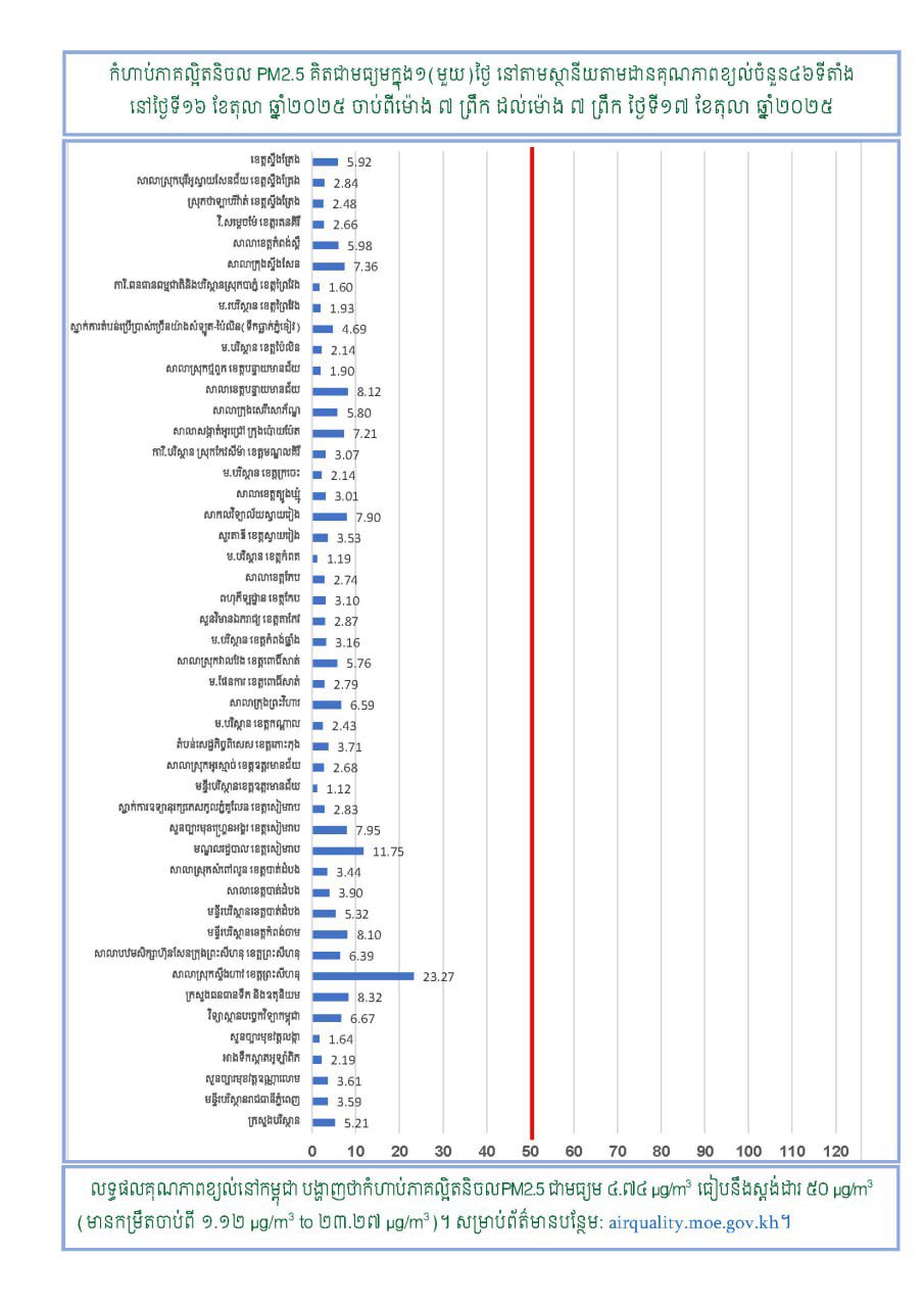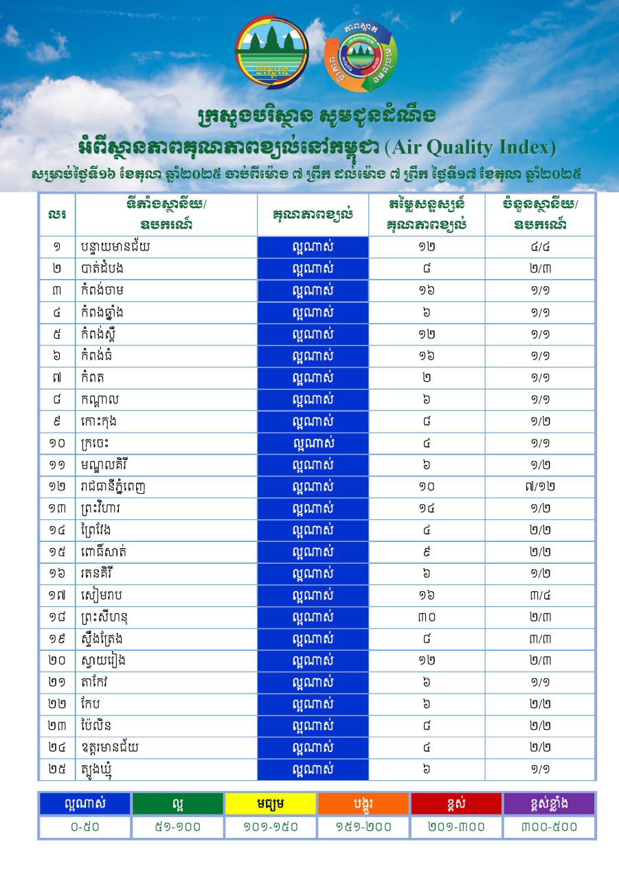 រាជធានីភ្នំពេញ ៖ យោងតាមការជូនដំណឹងរបស់ក្រសួងបរិស្ថានបានឱ្យដឹងថា ស្ថានភាពគុណភាពខ្យល់នៅក្នុងព្រះរាជាណាចក្រកម្ពុជា សម្រាប់ថ្ងៃទី១៦ ខែតុលា ឆ្នាំ២០២៥ ចាប់ពីម៉ោង៧ព្រឹក ដល់ម៉ោង៧ព្រឹកថ្ងៃទី១៧ ខែតុលា ឆ្នាំ២០២៥ ដែលមានកំហាប់ភាគល្អិតនិចលគិតជាមធ្យមស្មើនឹង ៤.៧៤ µg/m3 ធៀបនឹងស្តង់ដារ ៥០ ug/m3 និងគិតជាសន្ទស្សន៍គុណភាពខ្យល់ (Air Quality Index) គឺ «ល្អណាស់»។