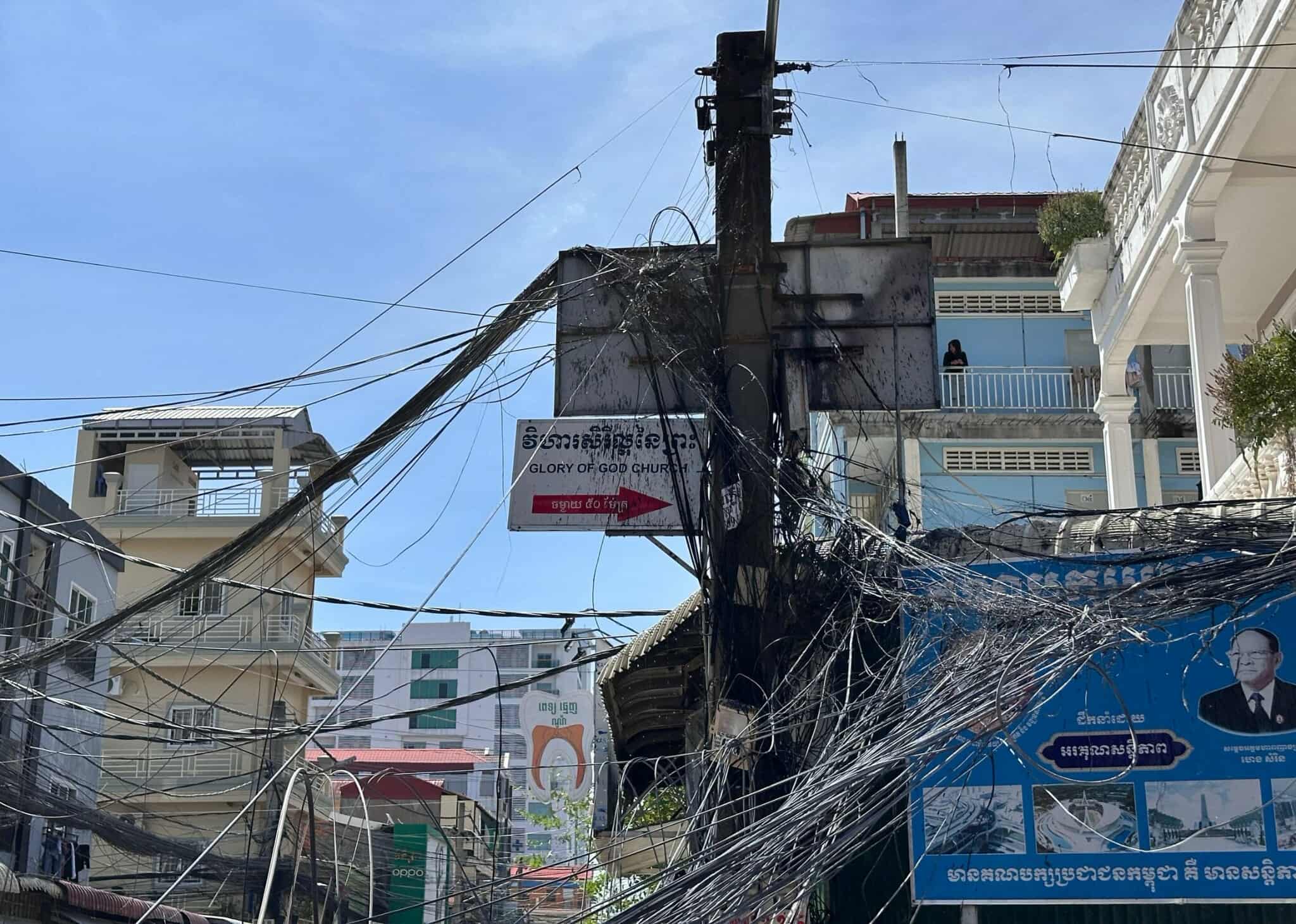 បង្គោលភ្លើងដែលអគ្គិភ័យឆាបឆេះលេខ ប.ត១៥២_២១៥ ដែលបំពាក់ទៅដោយខ្សែភ្លើងខ្វាតខ្វែងនិងរញ៉េរញ៉ៃ។
