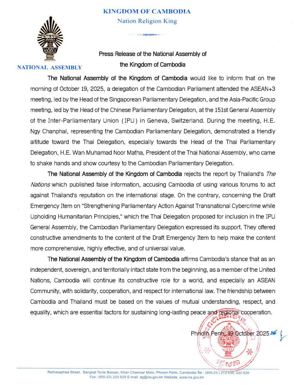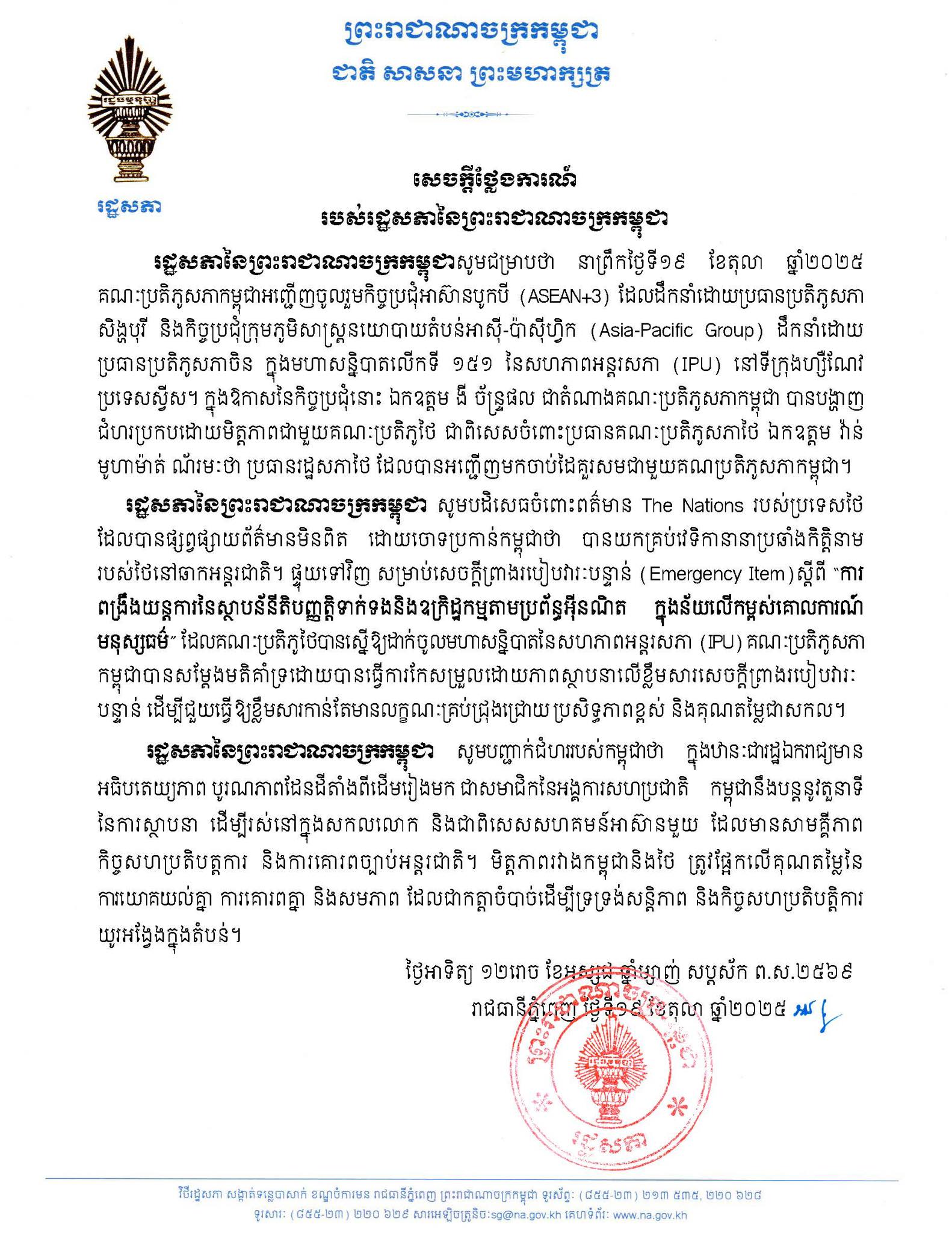រដ្ឋសភាកម្ពុជា បដិសេធចំពោះព័ត៌មាន The Nations របស់ប្រទេសថៃ ដែលបានផ្សព្វផ្សាយព័ត៌មានមិនពិត ដោយចោទប្រកាន់កម្ពុជាថា បានយកគ្រប់វេទិកានានាប្រឆាំងកិត្តិនាមរបស់ថៃនៅឆាកអន្តរជាតិ