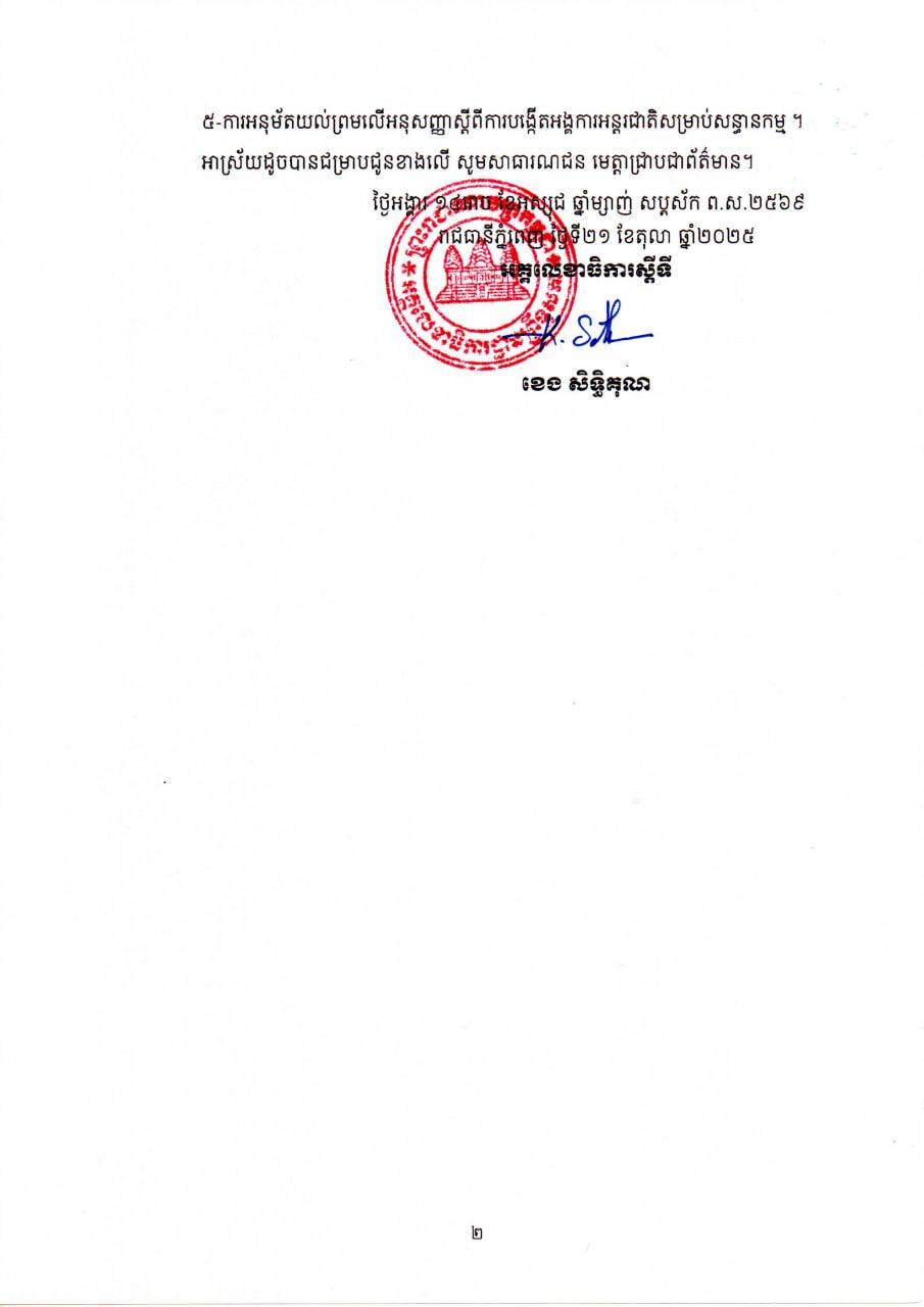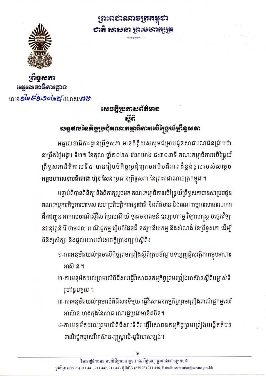អគ្គលេខាធិការដ្ឋានព្រឹទ្ធសភា សូមជម្រាបសាធារណជនជ្រាបថា នាព្រឹកថ្ងៃទី២១ ខែតុលា ឆ្នាំ២០២៥ វេលាម៉ោង៨និង៣០នាទី គណៈកម្មាធិការអចិន្ត្រៃយ៍ព្រឹទ្ធសភានីតិកាលទី៥ បានរៀបចំកិច្ចប្រជុំក្រោមអធិបតីភាព ដ៏ខ្ពង់ខ្ពស់របស់សម្តេចអគ្គមហាសេនាបតីតេជោ ហ៊ុន សែនប្រធានព្រឹទ្ធសភា នៃព្រះរាជាណាចក្រកម្ពុជា ។