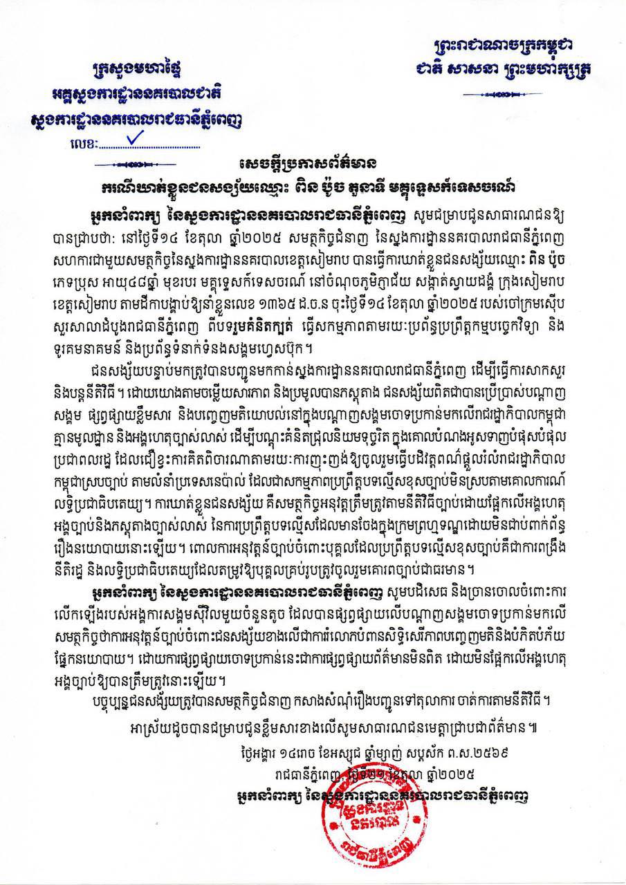 អ្នកនាំពាក្យ ជម្រាបជូនថា នៅថ្ងៃទី១៤ ខែតុលា ឆ្នាំ២០២៥ សមត្ថកិច្ចជំនាញ នៃស្នងការដ្ឋាននគរបាលរាជធានីភ្នំពេញ សហការជាមួយសមត្ថកិច្ច នៃស្នងការដ្ឋាននគរបាលខេត្តសៀមរាប បានធ្វើការឃាត់ខ្លួនជនសង្ស័យឈ្មោះ ពិន ប៉ូច ភេទប្រុស អាយុ៤៨ឆ្នាំ មុខរបរ មគ្គុទ្ទេសក៍ទេសចរណ៍ នៅចំណុចភូមិភ្ញាជ័យ សង្កាត់ស្វាយដង្គំ ក្រុងសៀមរាប ខេត្តសៀមរាប តាមដីកាបង្គាប់ឱ្យនាំខ្លួនលេខ១៣៦៥ ដ.ច.ន ចុះថ្ងៃទី១៤ ខែតុលា ឆ្នាំ២០២៥ របស់ចៅក្រមស៊ើបសួរសាលាដំបូងរាជធានីភ្នំពេញ ពីបទរួមគំនិតក្បត់ ធ្វើសកម្មភាពតាមរយៈប្រព័ន្ធប្រព្រឹត្តកម្មបច្ចេកវិទ្យា និងទូរគមនាគមន៍ និងប្រព័ន្ធទំនាក់ទំនងសង្គមហ្វេសប៊ុក ។