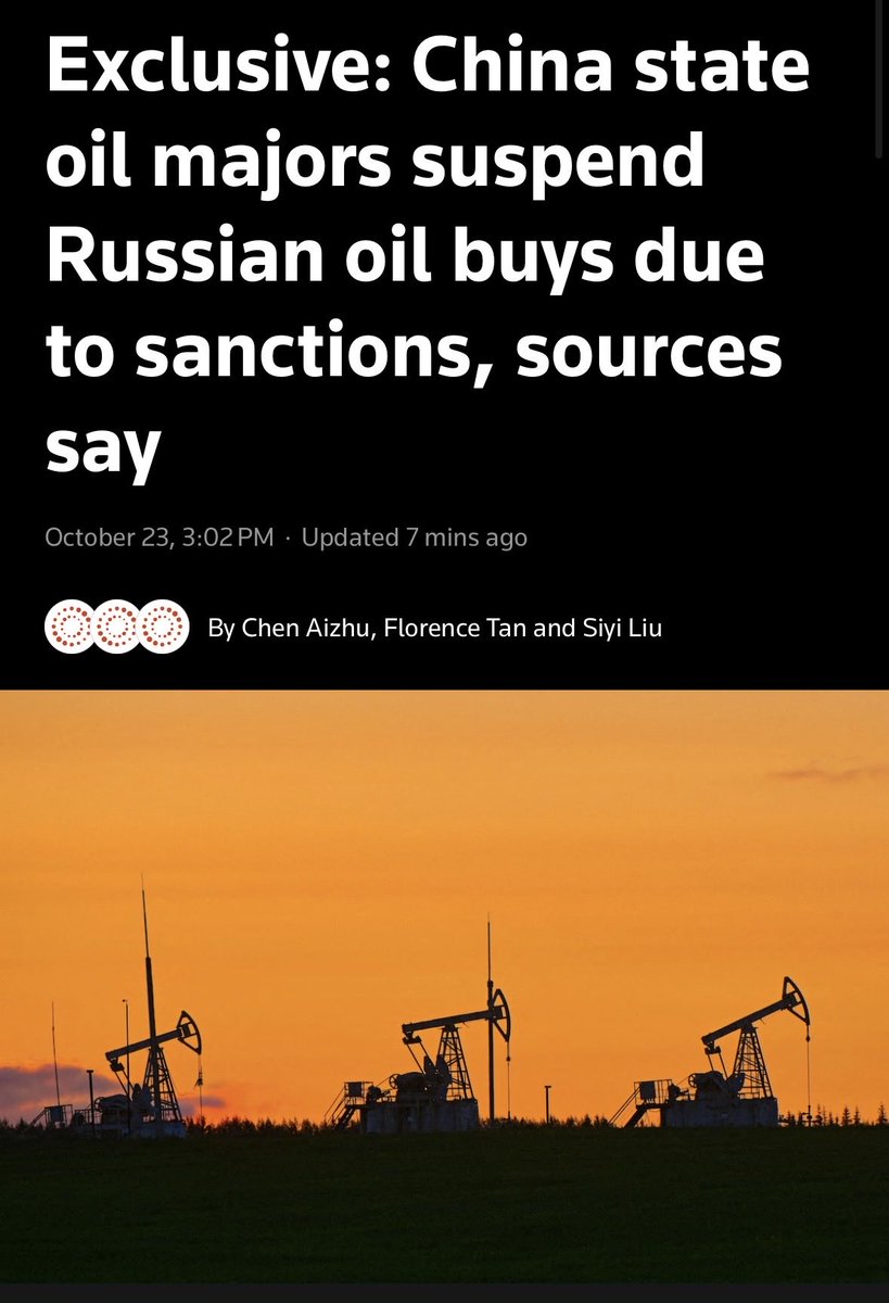 ពាណិជ្ជករប្រេងបានអះអាងថា ក្រុមហ៊ុនប្រេង Rosneft និង Lukoil បានលក់ប្រេងភាគច្រើនទៅឱ្យប្រទេសចិនតាមរយៈអន្តរការី ជំនួសឱ្យការលក់ដោយផ្ទាល់។ ពាណិជ្ជករជាច្រើនក៏បានលើកឡើងថា ទន្ទឹមនឹងនោះ បណ្តាក្រុមហ៊ុនប្រេងឯករាជ្យចិន ទំនងជានឹងផ្អាកការទិញ ដើម្បីវាយតម្លៃពីផលប៉ះពាល់នៃទណ្ឌកម្ម ប៉ុន្តែពួកគេនឹងនៅតែបន្តការទិញប្រេងពីរុស្ស៊ីដដែលនៅពេលក្រោយ។