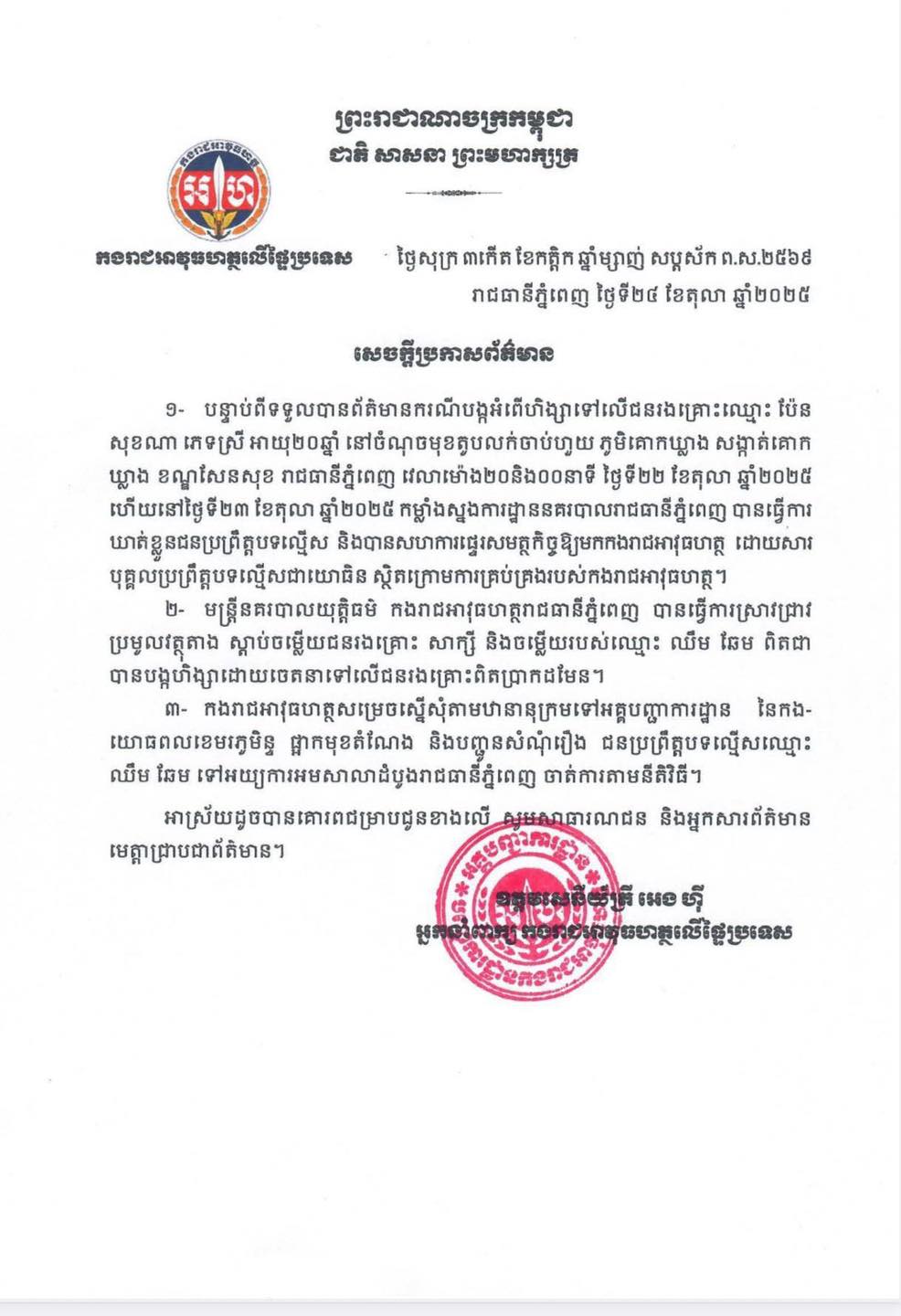 ក្នុងសេចក្ដីប្រកាសព័ត៌មាន នៅថ្ងៃទី២៤ ខែតុលា ឆ្នាំ២០២៥ លោកឧត្តមសេនីយ៍ត្រី អេង ហ៊ី បានបញ្ជាក់ថា បន្ទាប់ពីទទួលបានព័ត៌មានករណីបង្កអំពើហិង្សាទៅលើជនរងគ្រោះឈ្មោះ ប៉ែន សុខណា ភេទស្រី អាយុ២០ឆ្នាំ នៅមុខតូបលក់ចាប់ហួយ ភូមិគោកឃ្លាង សង្កាត់គោកឃ្លាង ខណ្ឌសែនសុខ រាជធានីភ្នំពេញ វេលាម៉ោង៨យប់ថ្ងៃទី២២ ខែតុលា ឆ្នាំ២០២៥នោះ នៅថ្ងៃទី២៣ ខែតុលា ឆ្នាំ២០២៥ កម្លាំងស្នងការដ្ឋាននគរបាលរាជធានីភ្នំពេញ បានឃាត់ខ្លួនជនប្រព្រឹត្តបទល្មើស និងបានសហការផ្ទេរសមត្ថកិច្ចឱ្យមកកងរាជអាវុធហត្ថ ដោយសារបុគ្គលប្រព្រឹត្តបទល្មើសជាយោធិន ស្ថិតក្រោមការគ្រប់គ្រងរបស់កងរាជអាវុធហត្ថ ។