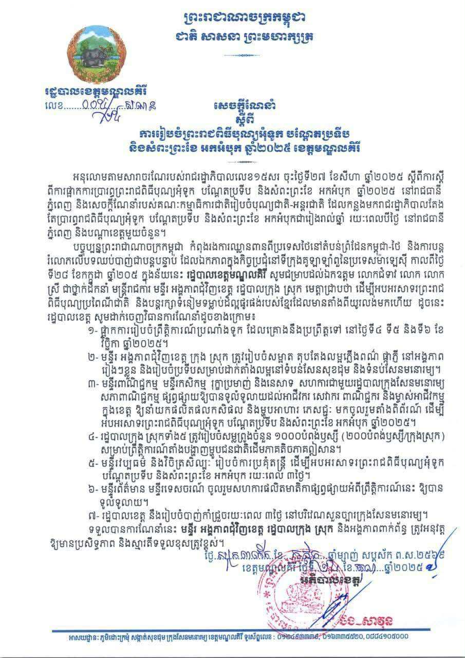 បច្ចុប្បន្ន ព្រះរាជាណាចក្រកម្ពុជា កំពុងរងការឈ្លានពានពីប្រទេសថៃ នៅតំបន់ព្រំដែនកម្ពុជា-ថៃ និងការបន្តរំលោភលើបទឈប់បាញ់ជាបន្តបន្ទាប់ ដែលឯកភាពក្នុងកិច្ចប្រជុំនៅទីក្រុងគូឡាឡាំពួនៃប្រទេសម៉ាឡេស៊ី កាលពីថ្ងៃទី២៨ ខែកក្កដា ឆ្នាំ២០៥ ក្នុងន័យនេះ រដ្ឋបាលខេត្តមណ្ឌលគិរី សូមជម្រាបដល់មហាជន មេត្តាជ្រាបថា ដើម្បីអបអរសាទរព្រះរាជ ពិធីបុណ្យប្រពៃណីជាតិ និងបន្តរក្សាទំនៀមទម្លាប់ដ៏ល្អផូរផង់របស់ខ្មែរ ដែលមានតាំងពីយូរលង់មកហើយ ដូចនេះ រដ្ឋបាលខេត្ត សូមដាក់ចេញវិធានការណែនាំដូចជា ផ្អាកការរៀបចំព្រឹត្តិការណ៍ប្រណាំងទូក ដែលគ្រោងនឹងប្រព្រឹត្តទៅ នៅថ្ងៃទី៤ ទី៥ និងទី៦ ខែវិច្ឆិកា ឆ្នាំ២០២៥។