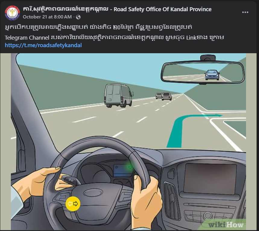 ខេត្តកណ្តាល ៖ អ្នកបើកបរត្រូវអោយភ្លើងសញ្ញាបត់ យ៉ាងតិច២០ម៉ែត្រពីផ្លូវប្រសព្វដែលត្រូវបត់ ។ នេះបើយោងតាមផេក ការិ.សុវត្ថិភាពចរាចរណ៍ខេត្តកណ្តាល បានប្រកាសនាថ្ងៃទី២១ ខែតុលា ឆ្នាំ២០២៥ ។