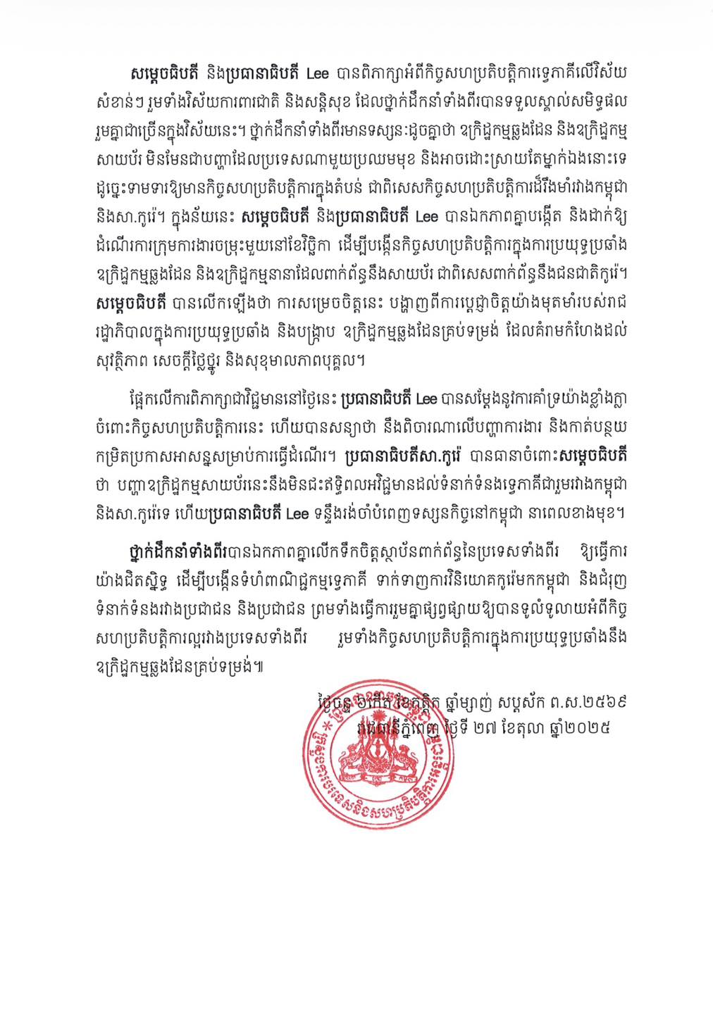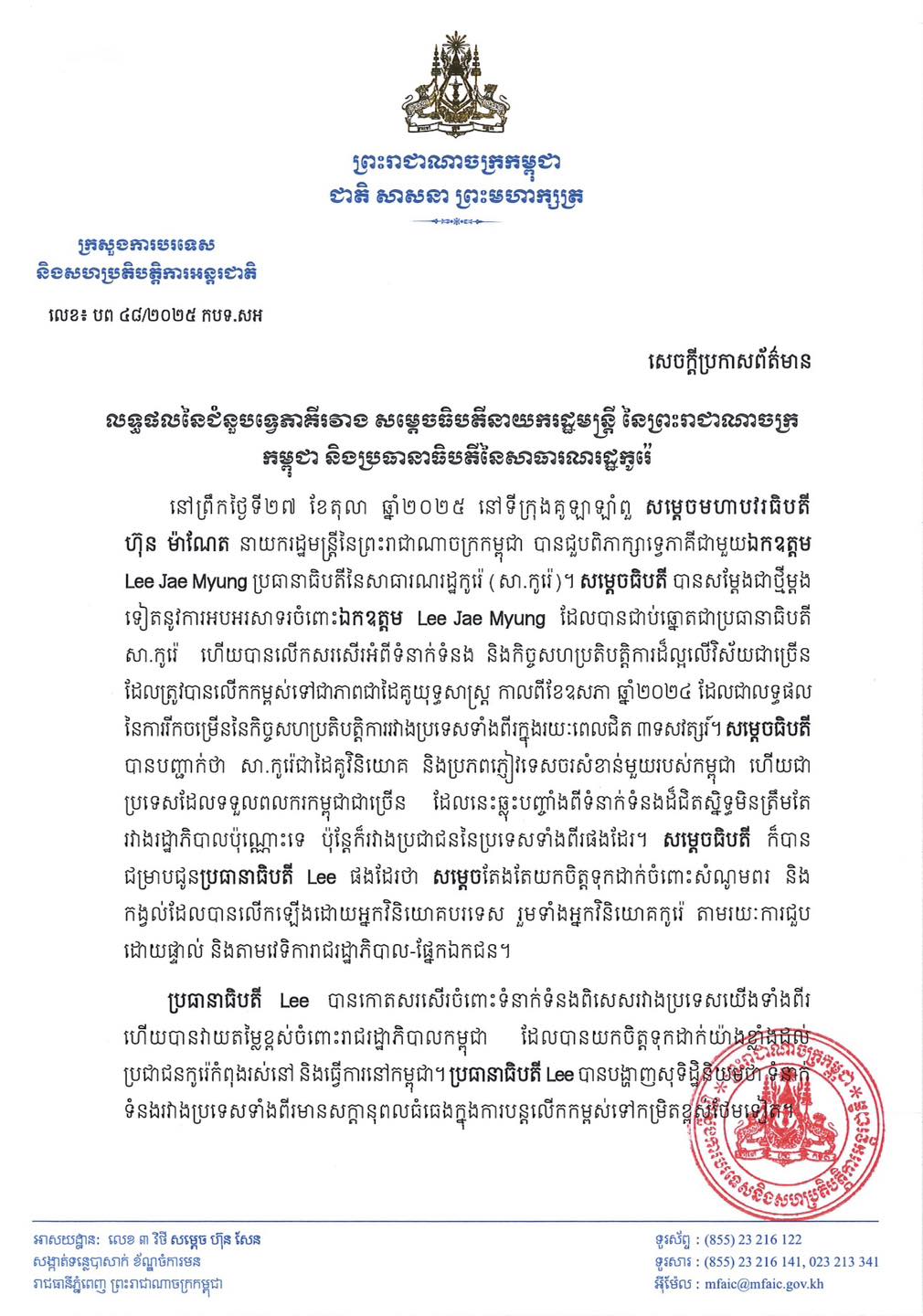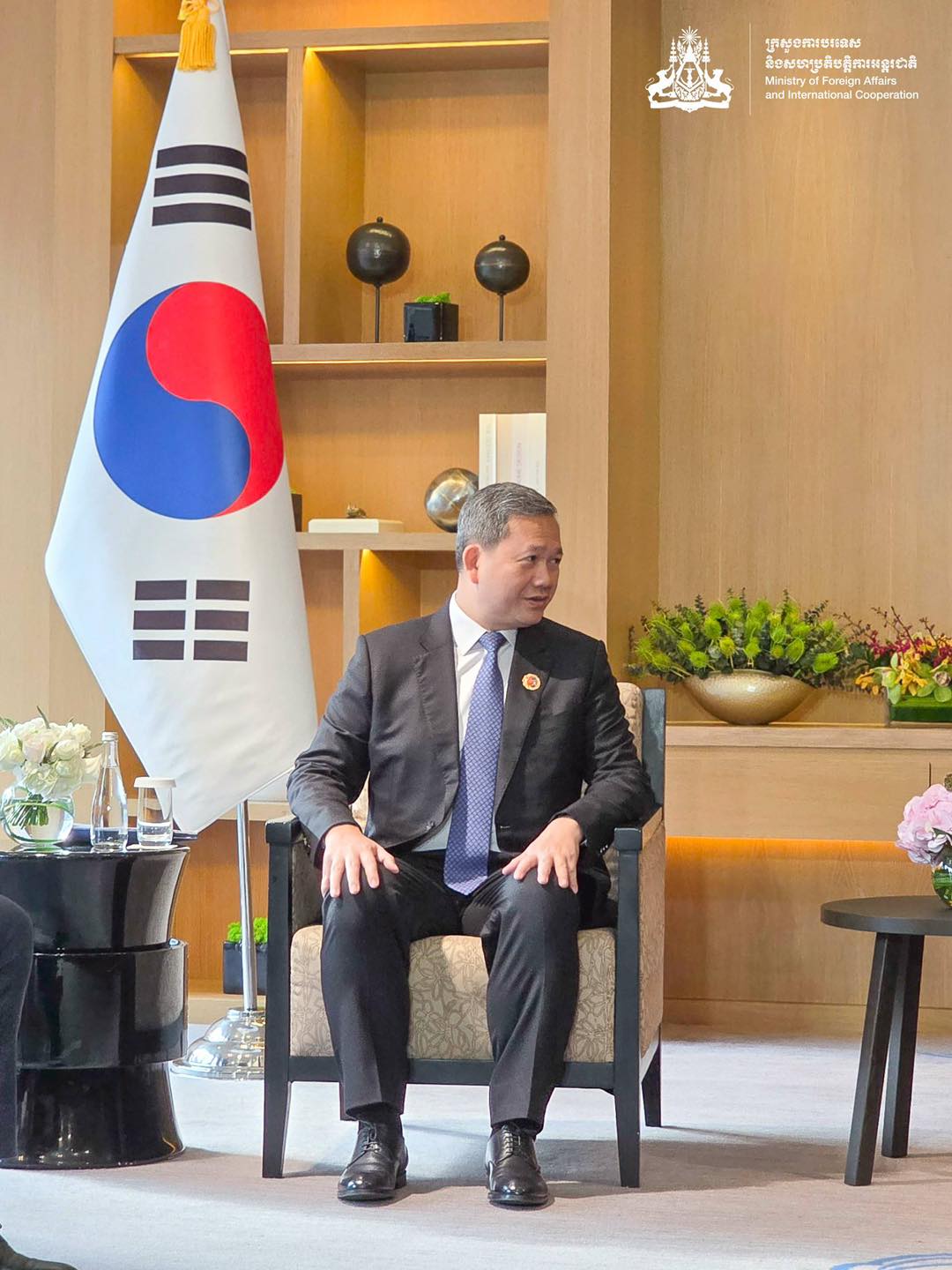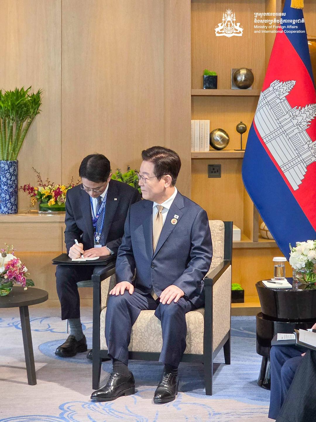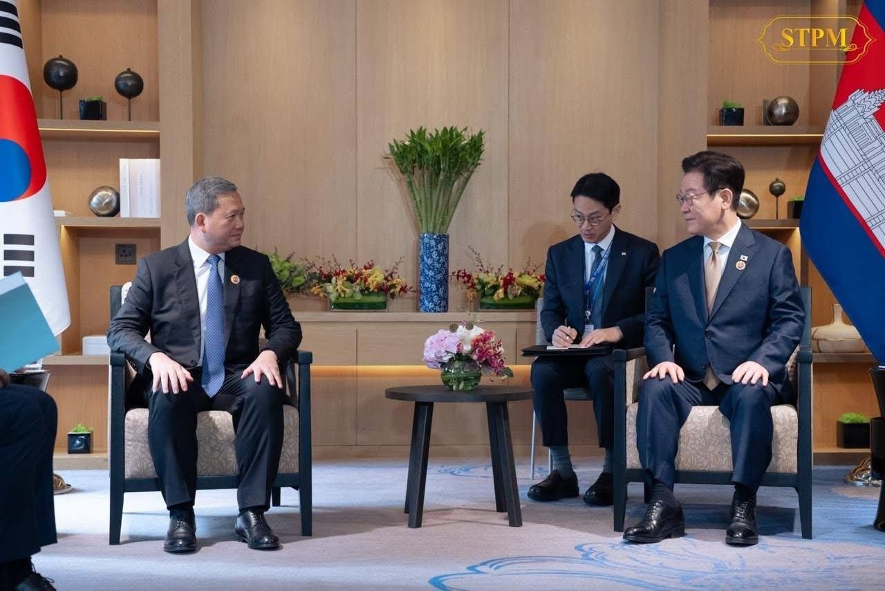 ក្នុងឱកាសនៃជំនួប សម្ដេចបវរធិបតីបានអបអរសាទរចំពោះឯកឧត្តម Lee Jae-Myung ដែលបាន ក្លាយជាប្រធានាធិបតីនៃសាធារណរដ្ឋកូរ៉េ។ សម្តេចបវរធិបតី បានវាយតម្លៃខ្ពស់ ចំពោះទំនាក់ទំនងកម្ពុជា-សាធារណរដ្ឋកូរ៉េ ដែលត្រូវបានភ្ជាប់ឡើងវិញ នៅឆ្នាំ១៩៩៧ និងត្រូវបានដំឡើងកម្រិតដល់ភាពជាដៃគូយុទ្ធសាស្ត្រ នៅឆ្នាំ២០២៤ ដែលបានធ្វើឱ្យទំនាក់ទំនងទ្វេភាគីកាន់តែមានភាពរឹងមាំ និងស៊ីជម្រៅ ហើយកិច្ចសហប្រតិបត្តិការក៏កាន់តែរីកចម្រើនគួរឱ្យកត់សម្គាល់ ស្ទើរគ្រប់វិស័យ ។