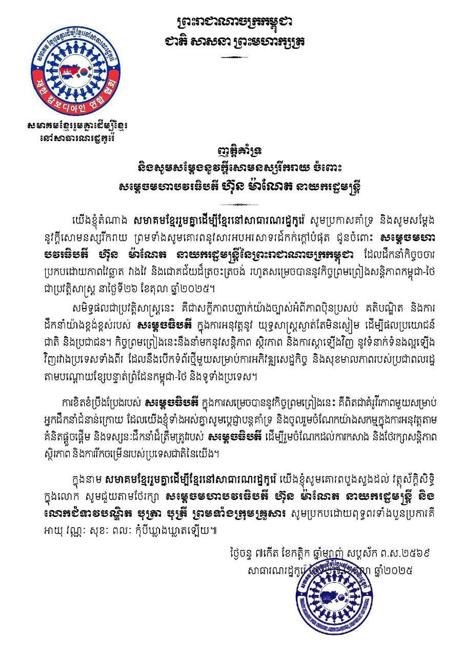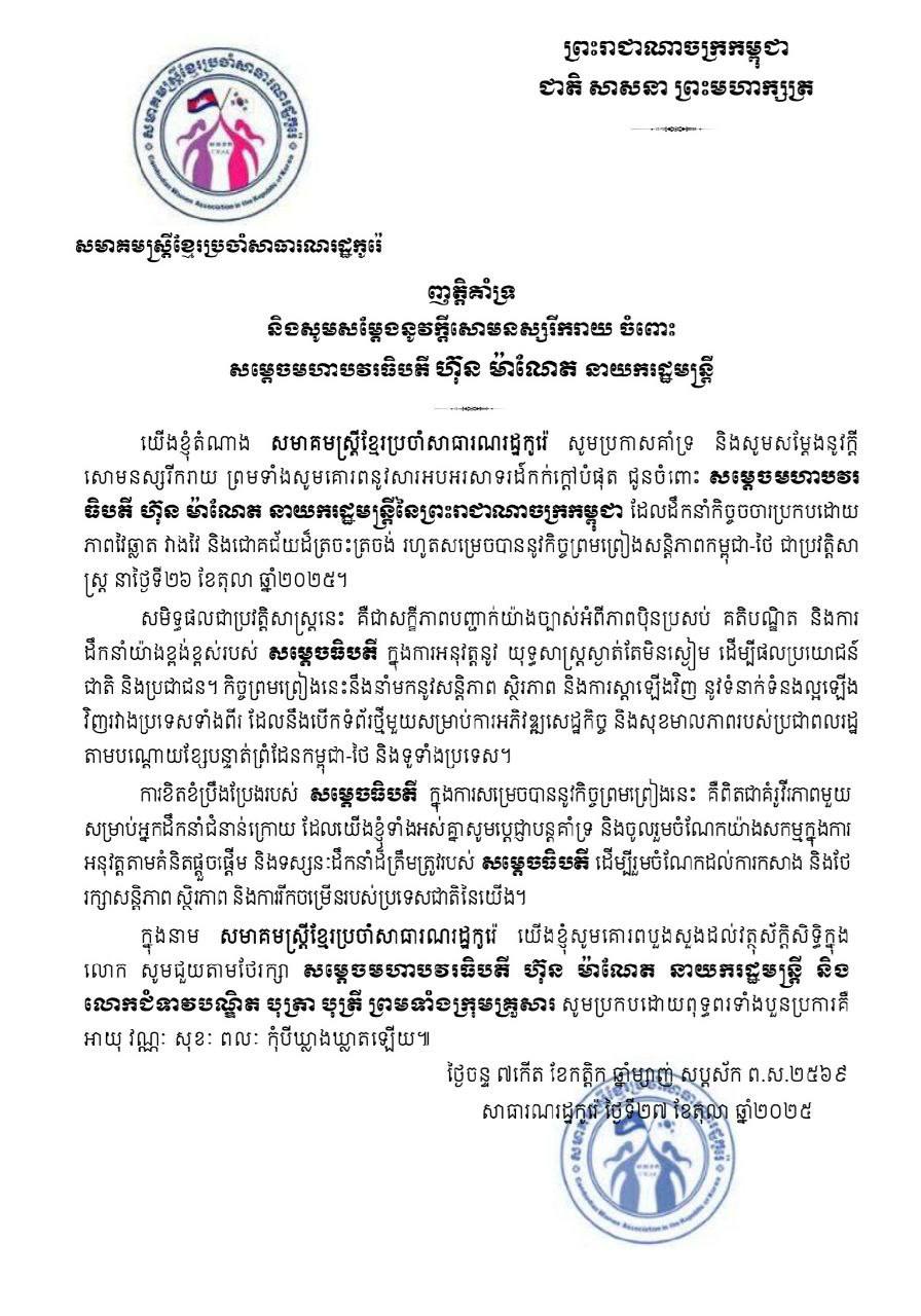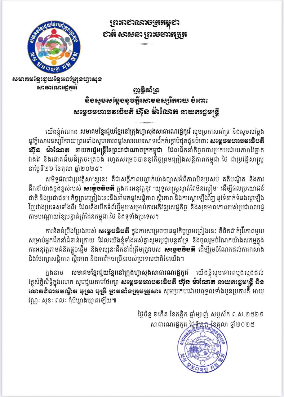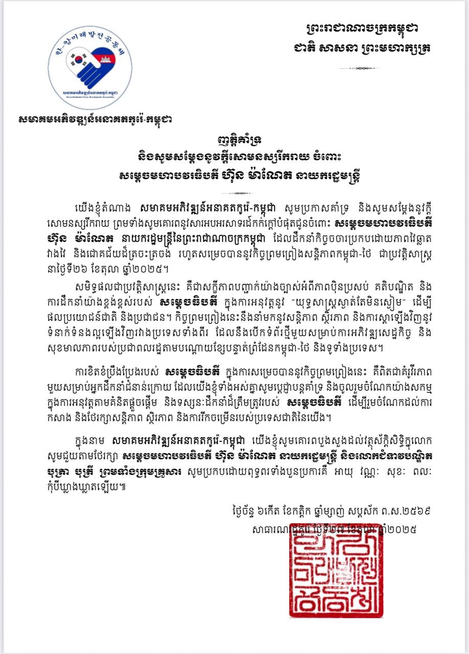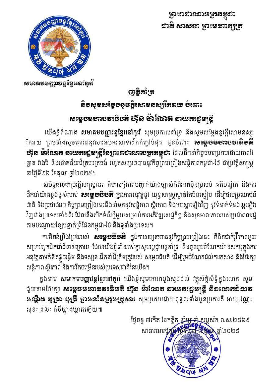 រាជធានីភ្នំពេញ ៖ សមាគមខ្មែរចំនួន ៦ ដែលមានមូលដ្ឋាននៅប្រទេសកូរ៉េខាងត្បូង នៅថ្ងៃទី២៨ ខែតុលា ឆ្នាំ ២០២៥នេះ បានចេញញត្តិគាំទ្រ និងសម្តែងក្តីសោមនស្សរីករាយ ចំពោះសម្តេចមហាបវរធិបតី ហ៊ុន ម៉ាណែត នាយករដ្ឋមន្ត្រីនៃព្រះរាជាណាចក្រកម្ពុជា ចំពោះជោគជ័យជាប្រវត្តិសាស្ត្រក្នុងការសម្រេចបាននូវកិច្ចព្រមព្រៀងសន្តិភាពកម្ពុជា-ថៃ នាថ្ងៃទី២៦ ខែតុលា ឆ្នាំ២០២៥ នៅទីក្រុងគូឡាឡាំពួរ ប្រទេសម៉ាឡេស៊ី ។