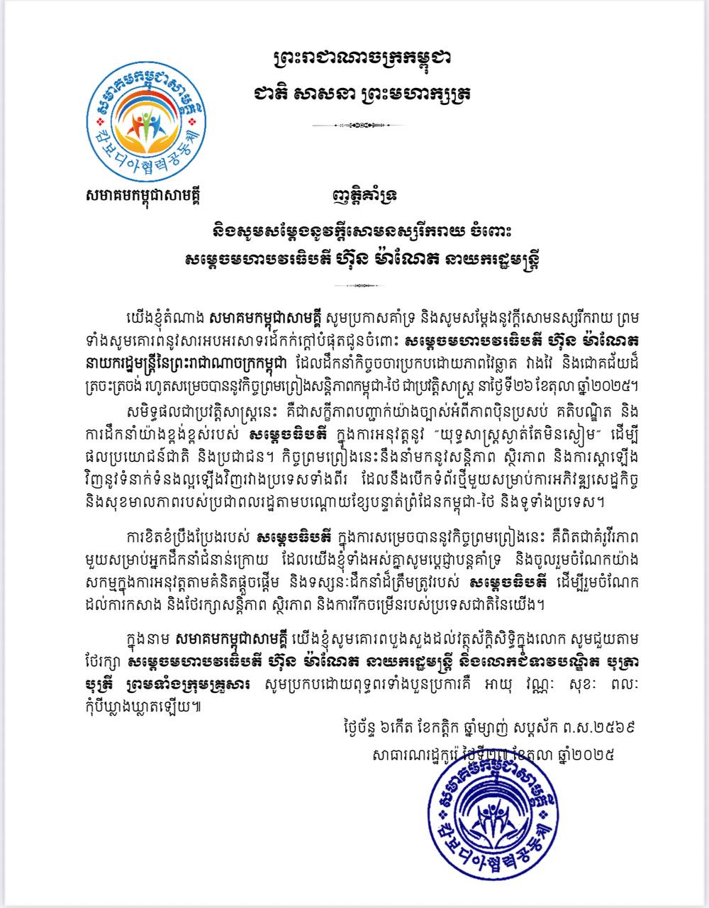 នៅក្នុងញត្តិគាំទ្រសមគមទាំង ៦បានលើកឡើងថា សមិទ្ធផលជាប្រវត្តិសាស្ត្រនេះ គឺជាសក្ខីភាពបញ្ជាក់យ៉ាងច្បាស់អំពីភាពប៉ិនប្រសប់ គតិបណ្ឌិត និង ការដឹកនាំយ៉ាងខ្ពង់ខ្ពស់របស់ សម្ដេចធិបតី ក្នុងការអនុវត្តនូវ “យុទ្ធសាស្ត្រស្ងាត់តែមិនស្ងៀម” ដើម្បីផលប្រយោជន៍ជាតិ និងប្រជាជន។ កិច្ចព្រមព្រៀងនេះនឹងនាំមកនូវសន្តិភាព ស្ថិរភាព និងការស្តាឡើងវិញនូវ ទំនាក់ទំនងល្អរវាងប្រទេសទាំងពីរ ដែលនឹងបើកទំព័រថ្មីមួយសម្រាប់ការអភិវឌ្ឍសេដ្ឋកិច្ច និង សុខមាលភាពរបស់ប្រជាពលរដ្ឋតាមបណ្ដោយខ្សែបន្ទាត់ព្រំដែនកម្ពុជា-ថៃ និងទូទាំងប្រទេស ។