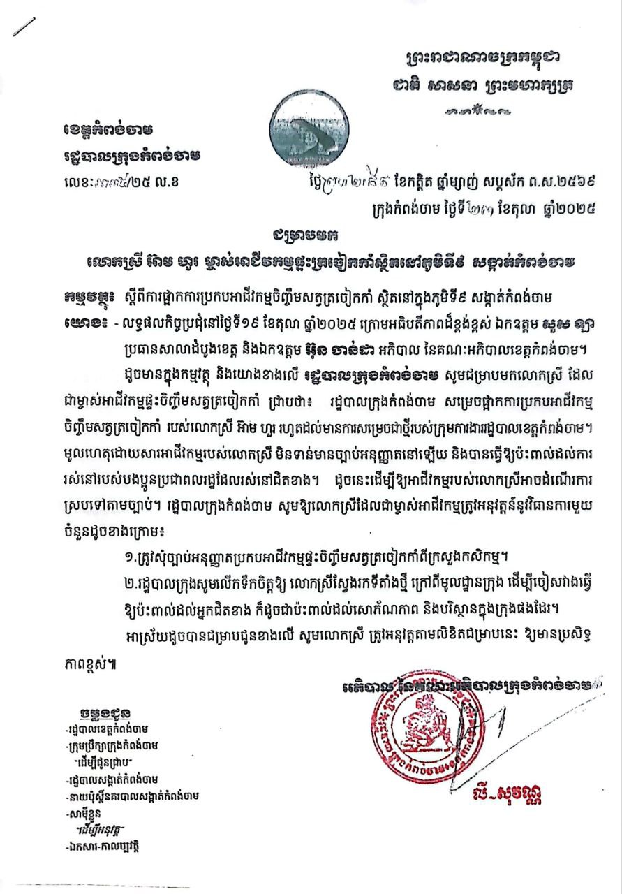 អភិបាលក្រុងកំពង់ចាមចេញលិខិតឱ្យផ្អាកផ្ទះអាជីវកម្មចិញ្ចឹមត្រចៀកកាំ