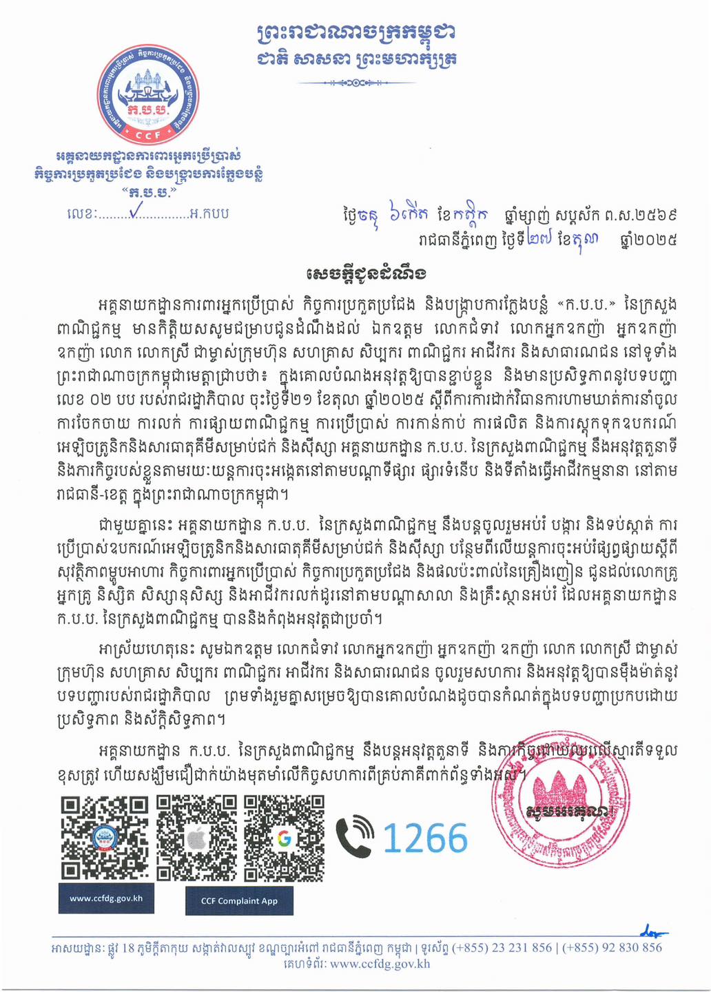 រាជធានីភ្នំពេញ ៖ សេចក្តីជូនដំណឹងស្តីពីការអនុវត្តតួនាទី និងភារកិច្ចរបស់អគ្គនាយកដ្ឋាន ក.ប.ប. នៃក្រសួងពាណិជ្ជកម្ម អនុលោមតាមបទបញ្ជាលេខ០២ បប របស់រាជរដ្ឋាភិបាល ចុះថ្ងៃទី២១ ខែតុលា ឆ្នាំ២០២៥ ស្តីពីការដាក់វិធានការហាមឃាត់ការនាំចូល ការចែកចាយ ការលក់ ការផ្សាយពាណិជ្ជកម្ម ការប្រើប្រាស់ ការកាន់កាប់ ការផលិត និងការស្តុកទុកឧបករណ៍អេឡិចត្រូនិក និងសារធាតុគីមីសម្រាប់ជក់ និងស៊ីស្សា ។ នេះបើយោងតាមអគ្គ.អ្នកការពារប្រើប្រាស់ កិច្ចការប្រកួតប្រជែង និងបង្ក្រាបការក្លែងបន្លំCCF នៅថ្ងៃទី២៧ តុលា ២០២៥ ។