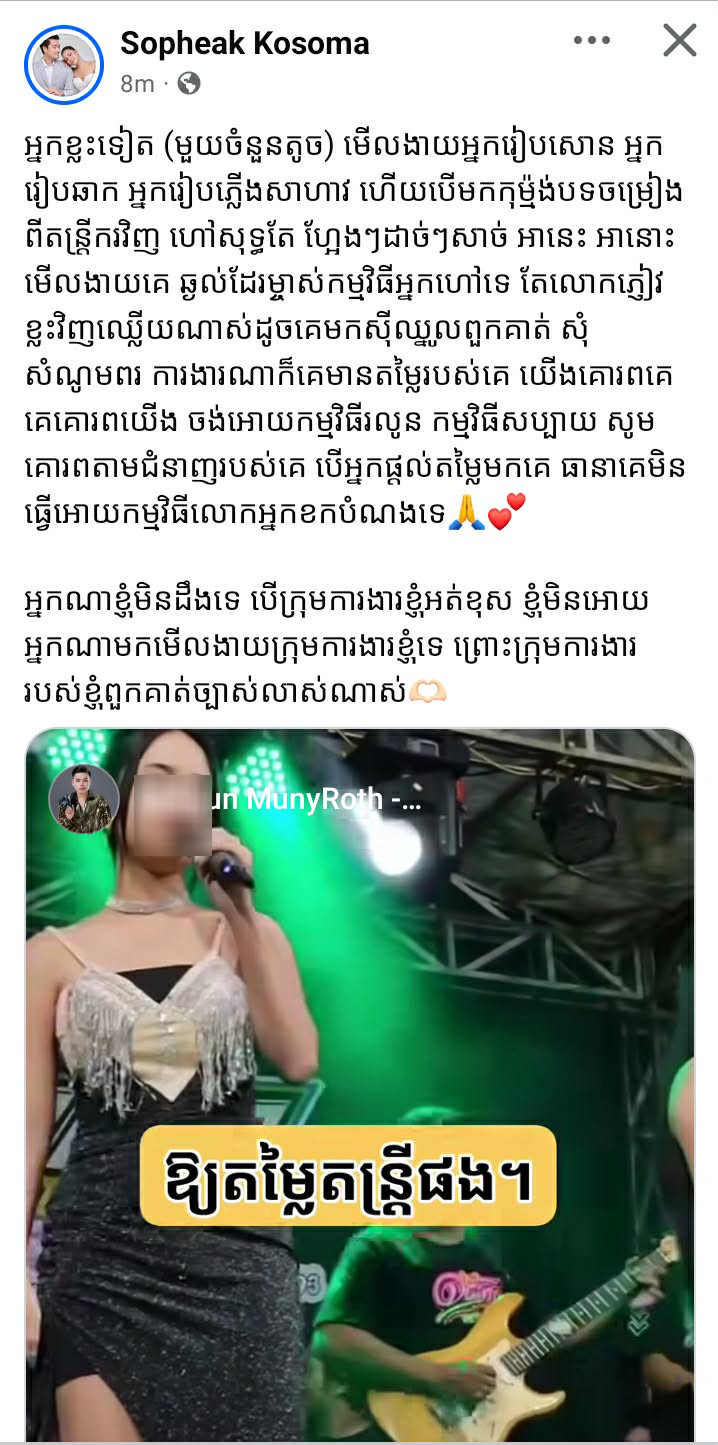ជាមួយនឹងរូបភាពវីដេអូខាងលើនេះ តារាចម្រៀងអ្នកនាង សុភ័ក្ត្រ កុសុម៉ា បានភ្ជាប់ជាមួយនឹងសំណេរថា អ្នកខ្លះទៀត (មួយចំនួនតូច) មើលងាយអ្នករៀបសោន អ្នករៀបឆាក អ្នករៀបភ្លើងសាហាវ ហើយបើមកកុម្ម៉ង់បទចម្រៀងពីតន្ត្រីករវិញ ហៅសុទ្ធតែ ហ្អែងៗដាច់ៗសាច់ អានេះ អានោះ មើលងាយគេ ។