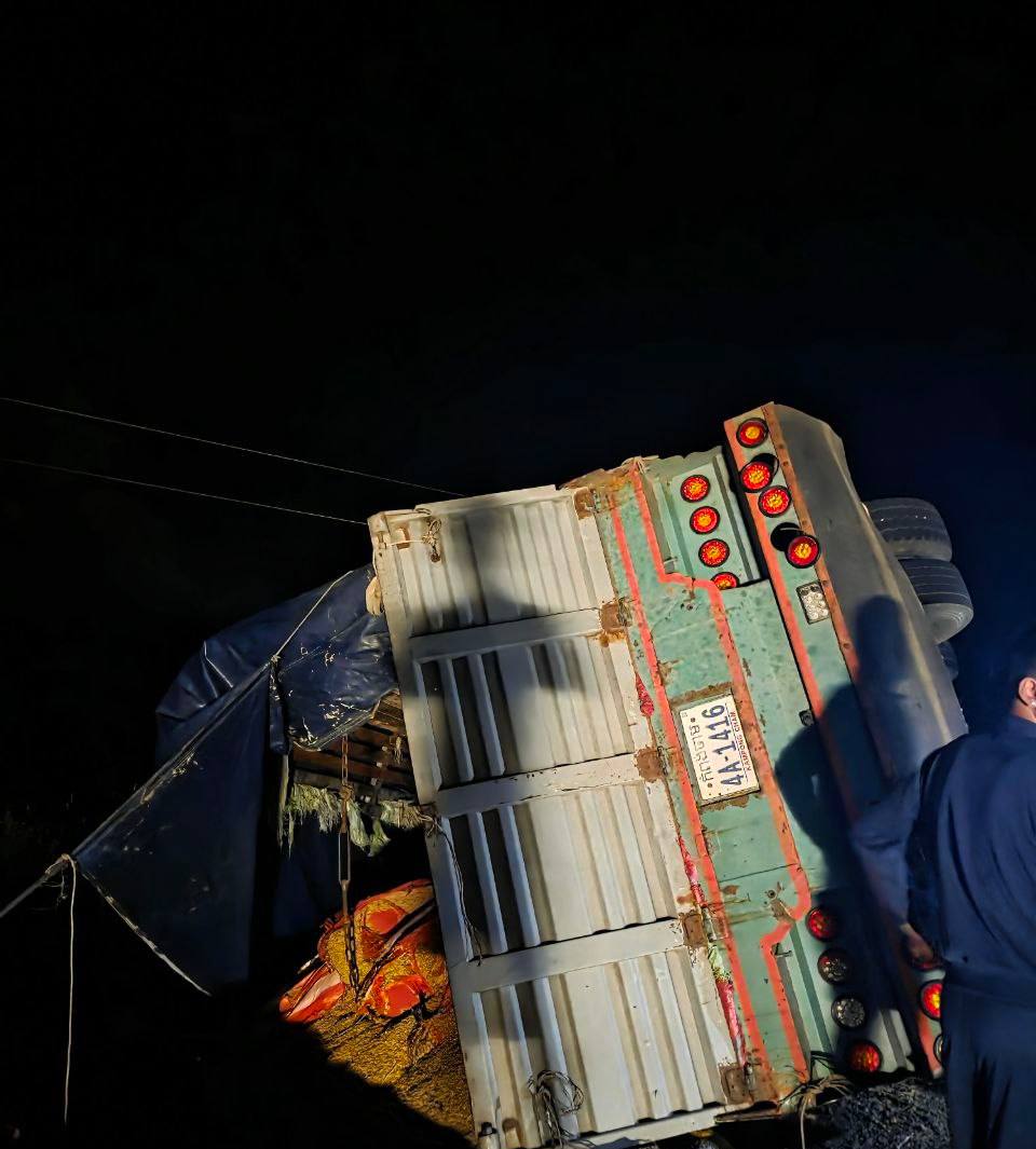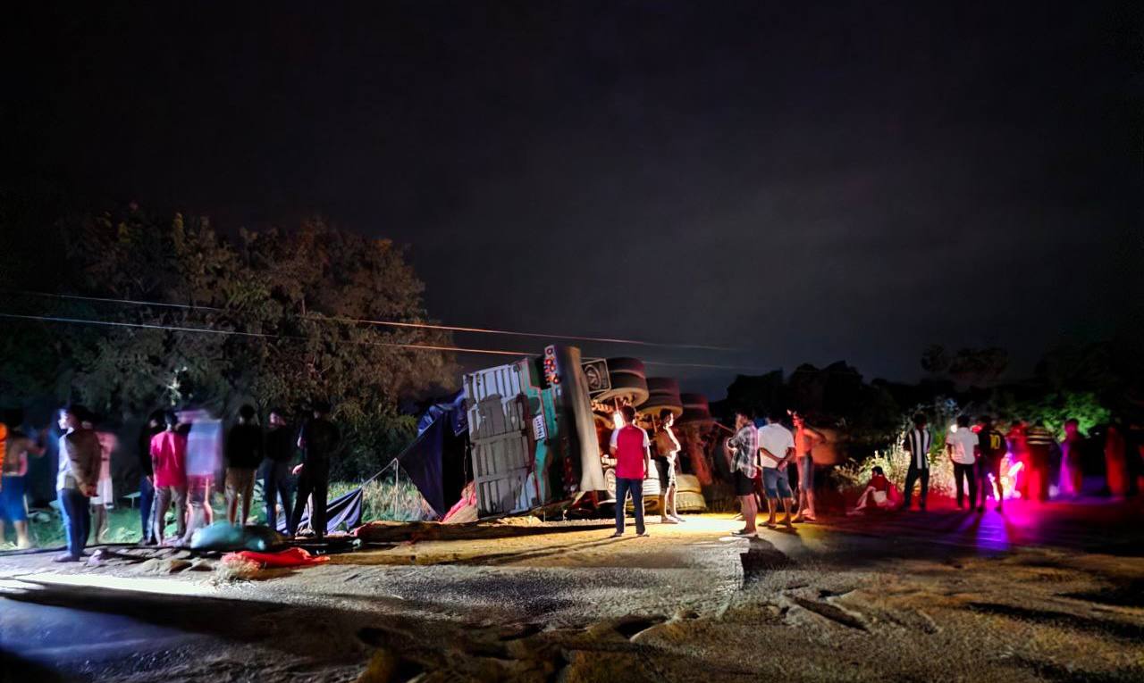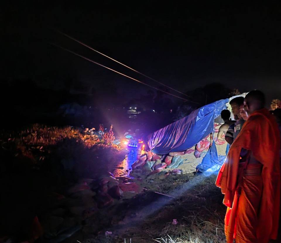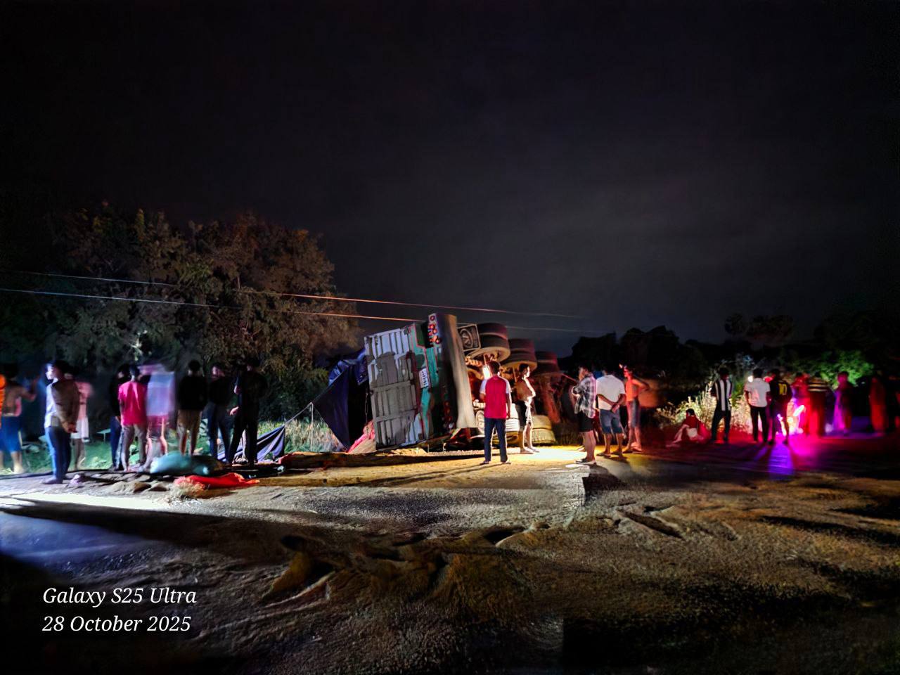 ខេត្តបន្ទាយមានជ័យ ៖ រថយន្តធុនធំសណ្តោងរ៉ឺម៉កប្រភេទB1 ដឹកស្រូវពេញក្ រឡាប់ផ្ញារជើង ដោយកាប៊ីនធ្លាក់ចូលស្រះទឹក បណ្តាលឱ្យជាប់ទាំងអ្នកបើកបរនិងព្រូក្នុងរថយន្តនោះ មិនដឹងថាស្លាប់ឬរស់នៅឡើយទេ ខណៈប្រជាពលរដ្ឋនាំគ្នាជួយសង្គ្រោះដែរ តែជួយមិនទាន់បានឡើយទេ…
