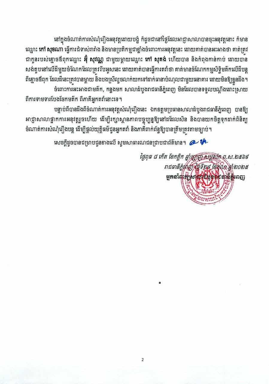 អ្នកនាំពាក្យសាលាដំបូងរាជធានីភ្នំពេញ បញ្ជាក់ថា កាលពីថ្ងៃទី២៨ ខែតុលា ឆ្នាំ២០២៥ អាជ្ញាសាលា បានចុះអនុវត្តដីកាសម្រេចបង្គាប់ឱ្យប្រគល់អចលនវត្ថុ ដែលមានទីតាំងនៅភូមិគៀនឃ្លាំង សង្កាត់ជ្រោយចង្វារ ខណ្ឌជ្រោយចង្វារ រាជធានីភ្នំពេញ ឱ្យទៅអ្នកទិញឈ្មោះ ហ៊ី សៀងលី តាមរយៈការទិញក្នុងសំណុំរឿងអនុវត្តដោយបង្ខំរបស់តុលាការ ដោយយោងតាមសាលក្រមស្ថាពរលេខ ៥៨៣«រ» ចុះថ្ងៃទី៣១ ខែឧសភា ឆ្នាំ២០២៣ របស់សាលាដំបូងរាជធានីភ្នំពេញ ដែលបានសម្រេចបង្គាប់ឱ្យឈ្មោះ កៅ សុគង់ (ម្តាយ) ឈ្មោះ កៅ ចាន់ធី (កូនបង្កើត) និងឈ្មោះ ជួរ រីន (កូនប្រសារ) សងប្រាក់ដើមចំនួន ៩៥.២៩៨,៩៤ (ប្រាំបួនម៉ឺនប្រាំពាន់ ពីររយកៅសិបប្រាំបី ក្បៀសកៅសិបបួន) ដុល្លារអាម៉េរិក រួមទាំងការប្រាក់ចំនួន១១% និងប្រាក់ពិន័យ២៤% ឱ្យទៅម្ចាស់ បំណុលជាធនាគារ ។