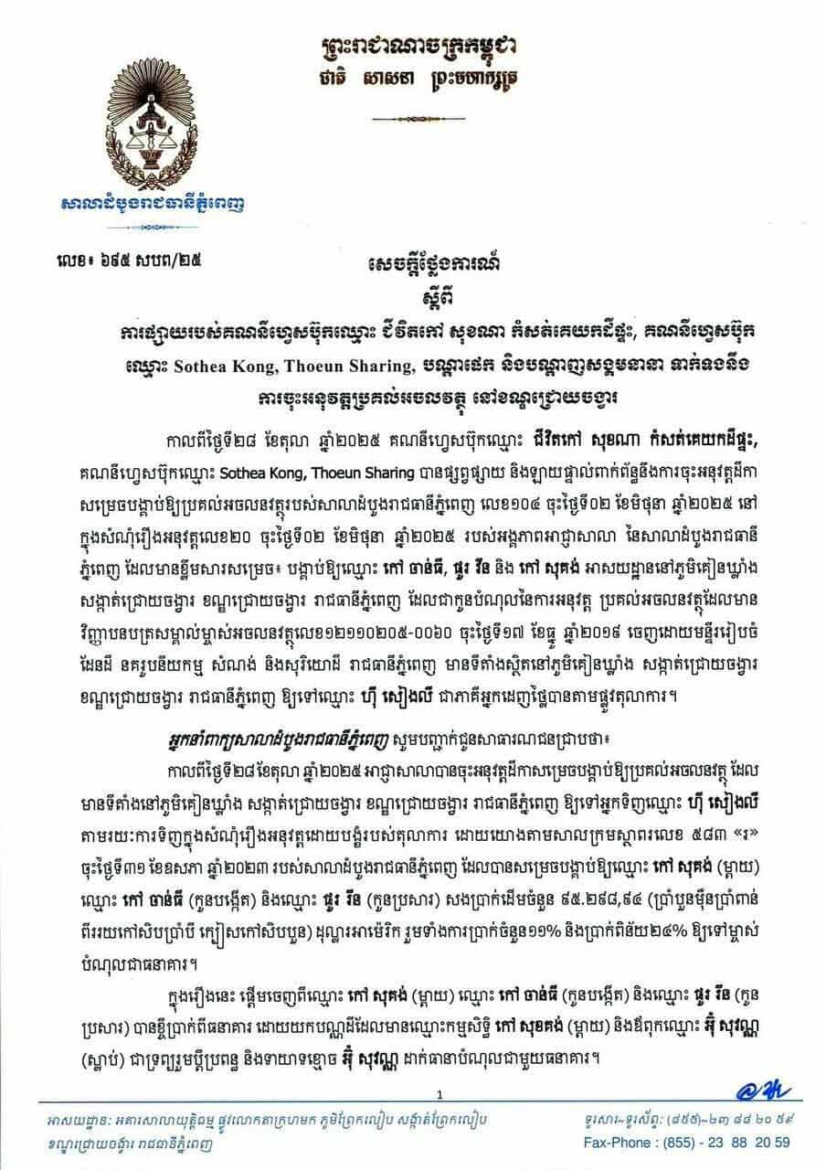 តាមសេចក្តីថ្លែងការណ៍បានអោយដឹងថា កាលពីថ្ងៃទី២៨ ខែតុលា ឆ្នាំ២០២៥ គណនីហ្វេសប៊ុកបានផ្សព្វផ្សាយ និងឡាយផ្ទាល់ពាក់ព័ន្ធនឹងការចុះអនុវត្តដីកា សម្រេចបង្គាប់ឱ្យប្រគល់អចលនវត្ថុរបស់សាលាដំបូងរាជធានីភ្នំពេញ លេខ១០៤ ចុះថ្ងៃទី០២ ខែមិថុនា ឆ្នាំ២០២៥ នៅក្នុងសំណុំរឿងអនុវត្តលេខ២០ ចុះថ្ងៃទី០២ ខែមិថុនា ឆ្នាំ២០២៥ របស់អង្គភាពអាជ្ញាសាលា នៃសាលាដំបូងរាជធានីភ្នំពេញ ដែលមានខ្លឹមសារសម្រេច បង្គាប់ឱ្យឈ្មោះ កៅ ចាន់ធី, ផូរ វីន និង កៅ សុគង់ អាសយដ្ឋាននៅភូមិគៀនឃ្លាំង សង្កាត់ជ្រោយចង្វារ ខណ្ឌជ្រោយចង្វារ រាជធានីភ្នំពេញ ដែលជាកូនបំណុល នៃការអនុវត្ត ប្រគល់អចលនវត្ថុ ដែលមាន វិញ្ញាបនបត្រសម្គាល់ម្ចាស់អចលនវត្ថុលេខ១២១១០២០៥-០០៦០ ចុះថ្ងៃទី១៧ ខែធ្នូ ឆ្នាំ២០១៩ ចេញដោយមន្ទីររៀបចំ ដែនដី នគរូបនីយកម្ម សំណង់ និងសុរិយោដី រាជធានីភ្នំពេញ មានទីតាំងស្ថិតនៅភូមិគៀនឃ្លាំង សង្កាត់ជ្រោយចង្វារ ខណ្ឌជ្រោយចង្វារ រាជធានីភ្នំពេញ ឱ្យទៅឈ្មោះ ហ៊ី សៀងលី ជាភាគីអ្នកដេញថ្លៃបានតាមផ្លូវតុលាការ ។