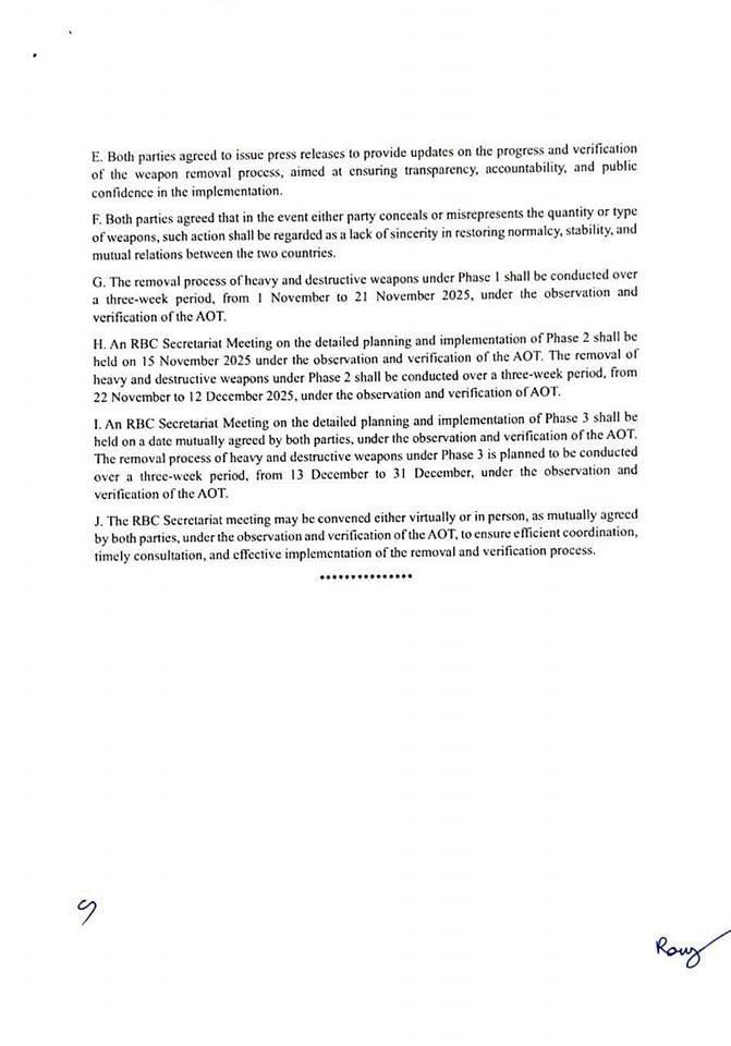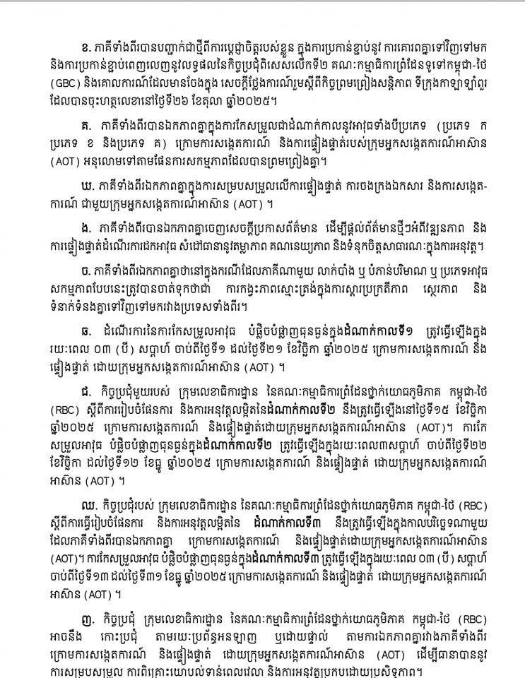 ឈ. កិច្ចប្រជុំរបស់ក្រុមលេខាធិការដ្ឋាន នៃគណៈកម្មាធិការព្រំដែនថ្នាក់យោធភូមិភាគ កម្ពុជា-ថៃ (RBC) ស្ដីពីការធ្វើរៀបចំផែនការ និងការអនុវត្តលម្អិត ដំណាក់កាលទី៣ នឹងត្រូវធ្វើឡើងក្នុងកាលបរិច្ឆេទណាមួយ ដែលភាគីទាំងពីរបានឯកភាពគ្នា ក្រោមការសង្កេតការណ៍ និងផ្ទៀងផ្ទាត់ដោយក្រុមអ្នកសង្កេតការណ៍អាស៊ាន (AOT)។ ការកែសម្រួលអាវុធ បំផ្លិចបំផ្លាញធុនធ្ងន់ ក្នុងដំណាក់កាលទី៣ ត្រូវធ្វើឡើងក្នុងរយៈពេល ០៣ (បី) សប្ដាហ៍ ចាប់ពីថ្ងៃទី១៣ ដល់ថ្ងៃទី៣១ ខែធ្នូ ឆ្នាំ២០២៥ ក្រោមការសង្កេតការណ៍ និងផ្ទៀងផ្ទាត់ ដោយក្រុមអ្នកសង្កេតការណ៍