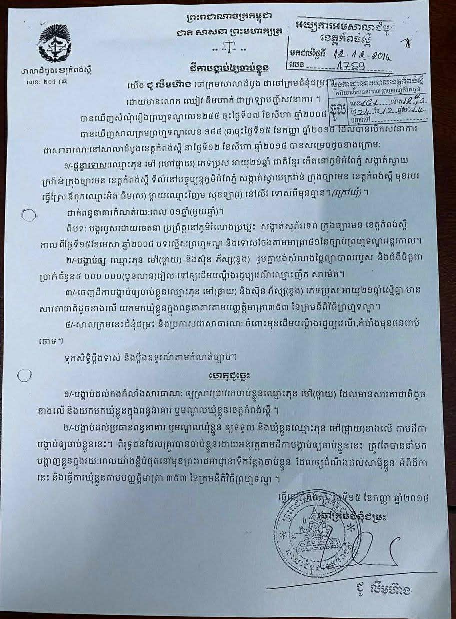 (ហៅផ្កាយ)នេះ មានដីកាបង្គាប់ឱ្យចាប់ខ្លួន ពីបទបង្ករបួសដោយចេតនា ដែលប្រព្រឹត្តនៅក្នុងភូមិរំលោងប្រឃ្លះ សង្កាត់សុព័រទេព ក្រុងច្បារមន ខេត្តកំពង់ស្ពឺថែមទៀតផង ។