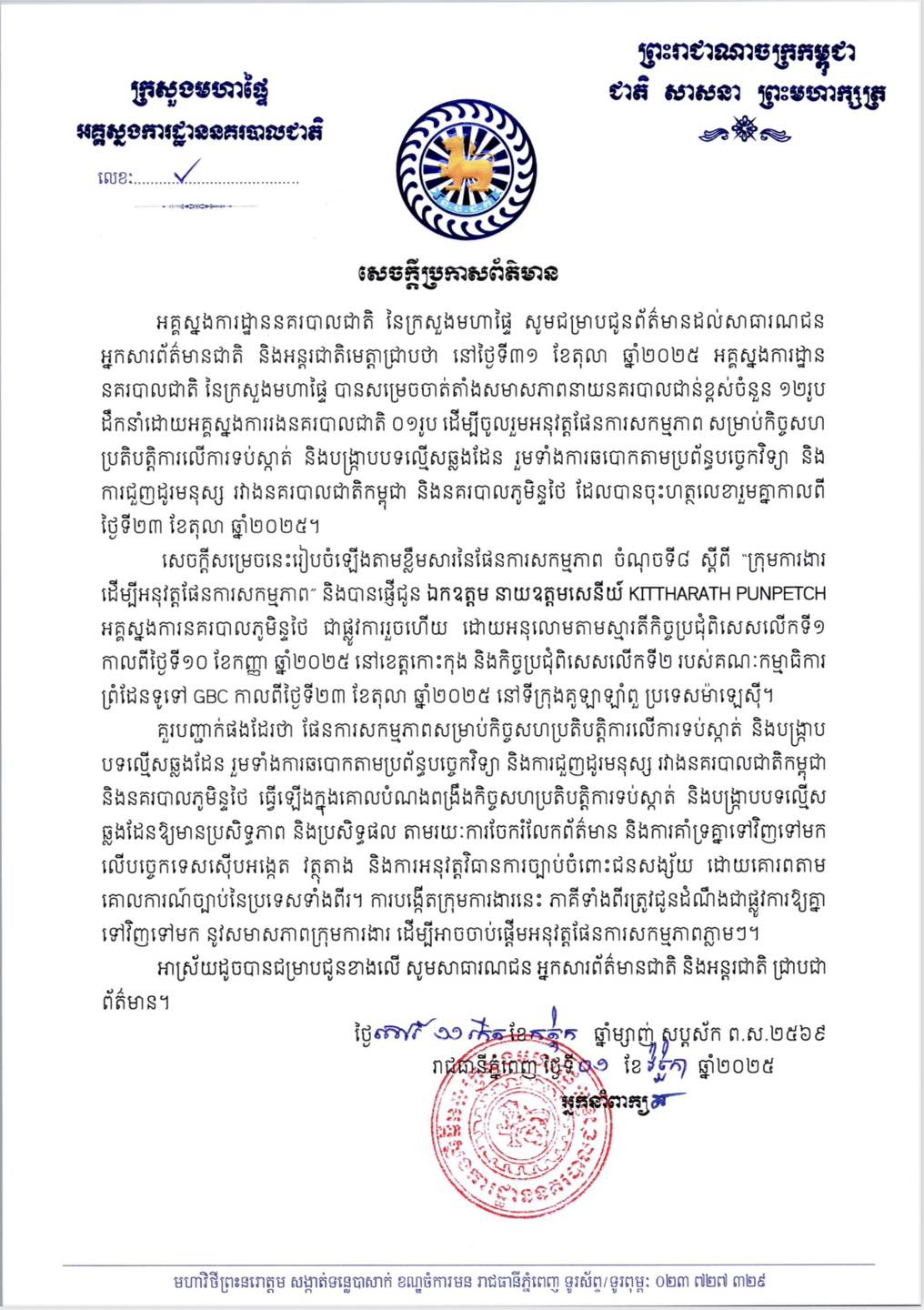 រាជធានីភ្នំពេញ ៖ អគ្គស្នងការដ្ឋាននគរបាលជាតិនៃក្រសួងមហាផ្ទៃ សូមជម្រាបជូនព័ត៌មានដល់សាធារណជនអ្នកសារព័ត៌មានជាតិ និងអន្តរជាតិជ្រាបថា នៅថ្ងៃទី៣១ ខែតុលា ឆ្នាំ២០២៥ អគ្គស្នងការដ្ឋាននគរបាលជាតិនៃក្រសួងមហាផ្ទៃ បានសម្រេចចាត់តាំងសមាសភាពនាយនគរបាលជាន់ខ្ពស់ចំនួន១២រូប ដឹកនាំដោយអគ្គស្នងការរងនគរបាលជាតិ០១រូប ដើម្បីចូលរួមអនុវត្តផែនការសកម្មភាព សម្រាប់កិច្ចសហប្រតិបត្តិការលើការទប់ស្កាត់ និងបង្ក្រាបបទល្មើសឆ្លងដែន រួមទាំងការឆបោកតាមប្រព័ន្ធបច្ចេកវិទ្យា និងការជួញដូរមនុស្សរវាងនគរបាលជាតិកម្ពុជា និង