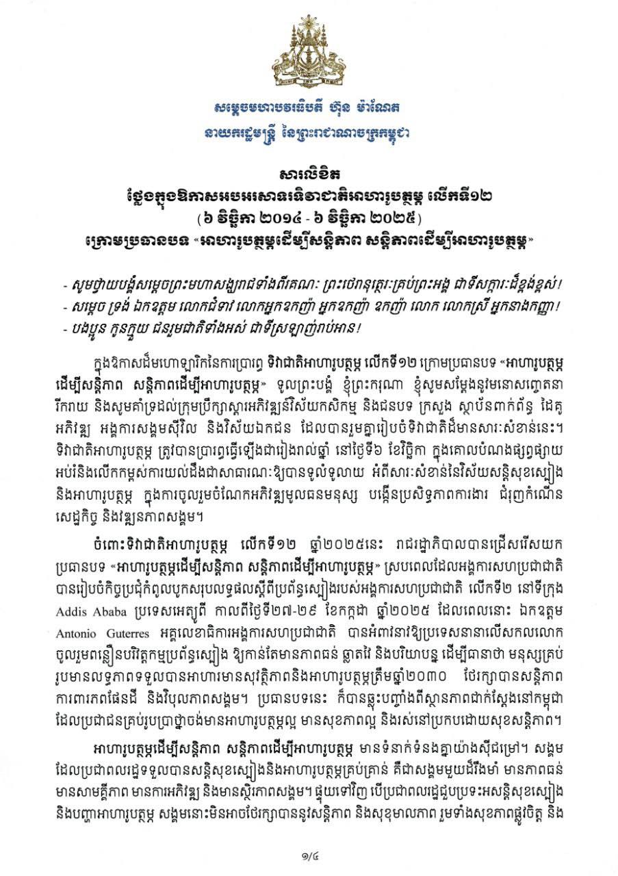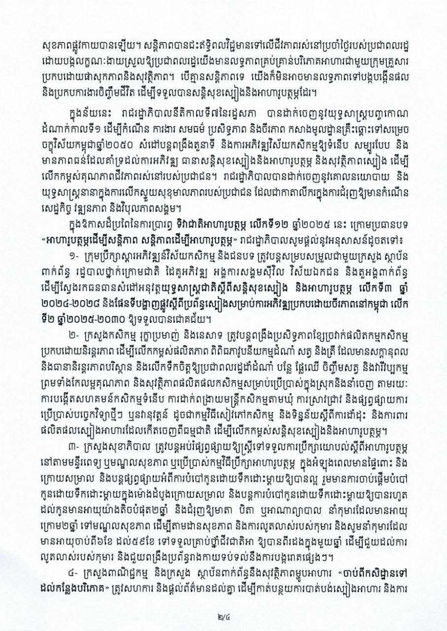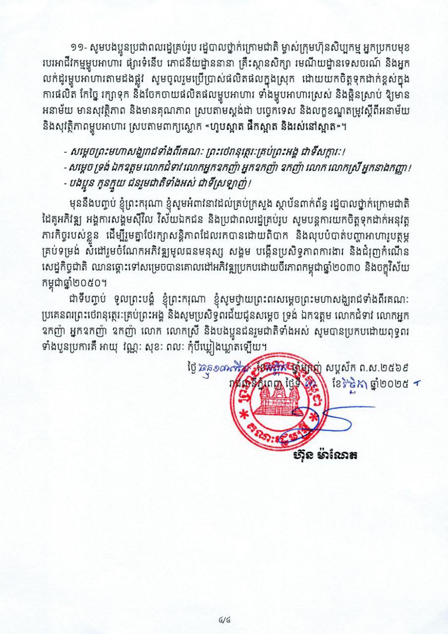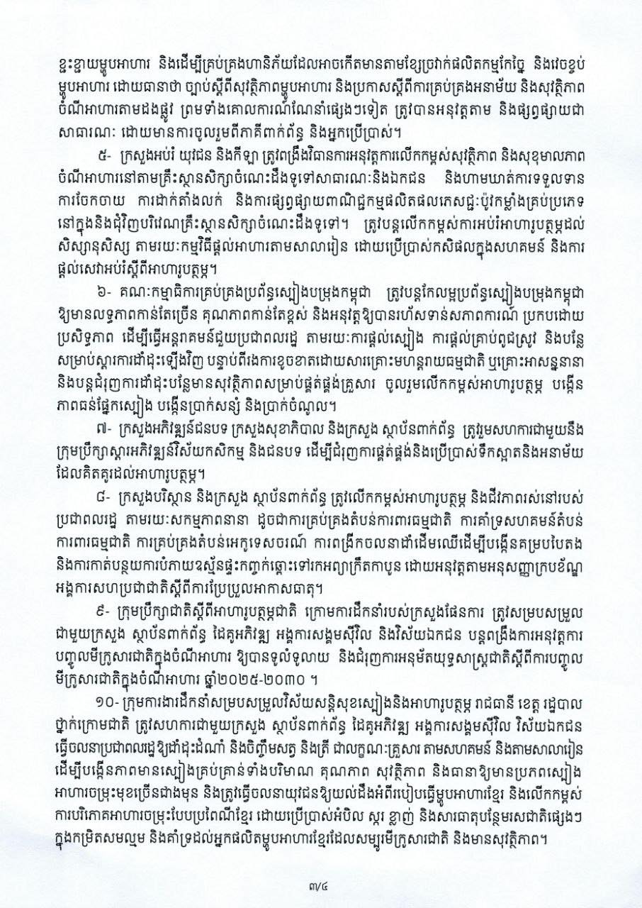 រូបតំណាងដោយ AIក្នុងនោះដែរ ប្រមុខរដ្ឋាភិបាល បានសំណូមពរដល់បងប្អូនប្រជាពលរដ្ឋគ្រប់រូប រដ្ឋបាលថ្នាក់ក្រោមជាតិ ម្ចាស់ក្រុមហ៊ុនសិប្បកម្ម អ្នកប្រកបមុខ របរអាជីវកម្មម្ហូបអាហារ ផ្សារទំនើប ភោជនីយដ្ឋាននានា គ្រឹះស្ថានសិក្សា រមណីយដ្ឋានទេសចរណ៍ និងអ្នកលក់ដូរម្ហូបអាហារតាមដងផ្លូវ សូមចូលរួមប្រើប្រាស់ផលិតផលក្នុងស្រុក ដោយយកចិត្តទុកដាក់ខ្ពស់ក្នុងការផលិត កែច្នៃ រក្សាទុក និងចែកចាយផលិតផលម្ហូបអាហារ ទាំងម្ហូបអាហារស្រស់ និងឆ្អិនស្រាប់ ឱ្យមានអនាម័យ មានសុវត្ថិភាព និងមានគុណភាព ស្របតាមស្តង់ដា បច្ចេកទេស និងលក្ខខណ្ឌតម្រូវស្តីពីអនាម័យ និងសុវត្ថិភាពម្ហូបអាហារ ស្របតាមពាក្យស្លោក «ហូបស្អាត ផឹកស្អាត និងរស់នៅស្អាត» ៕