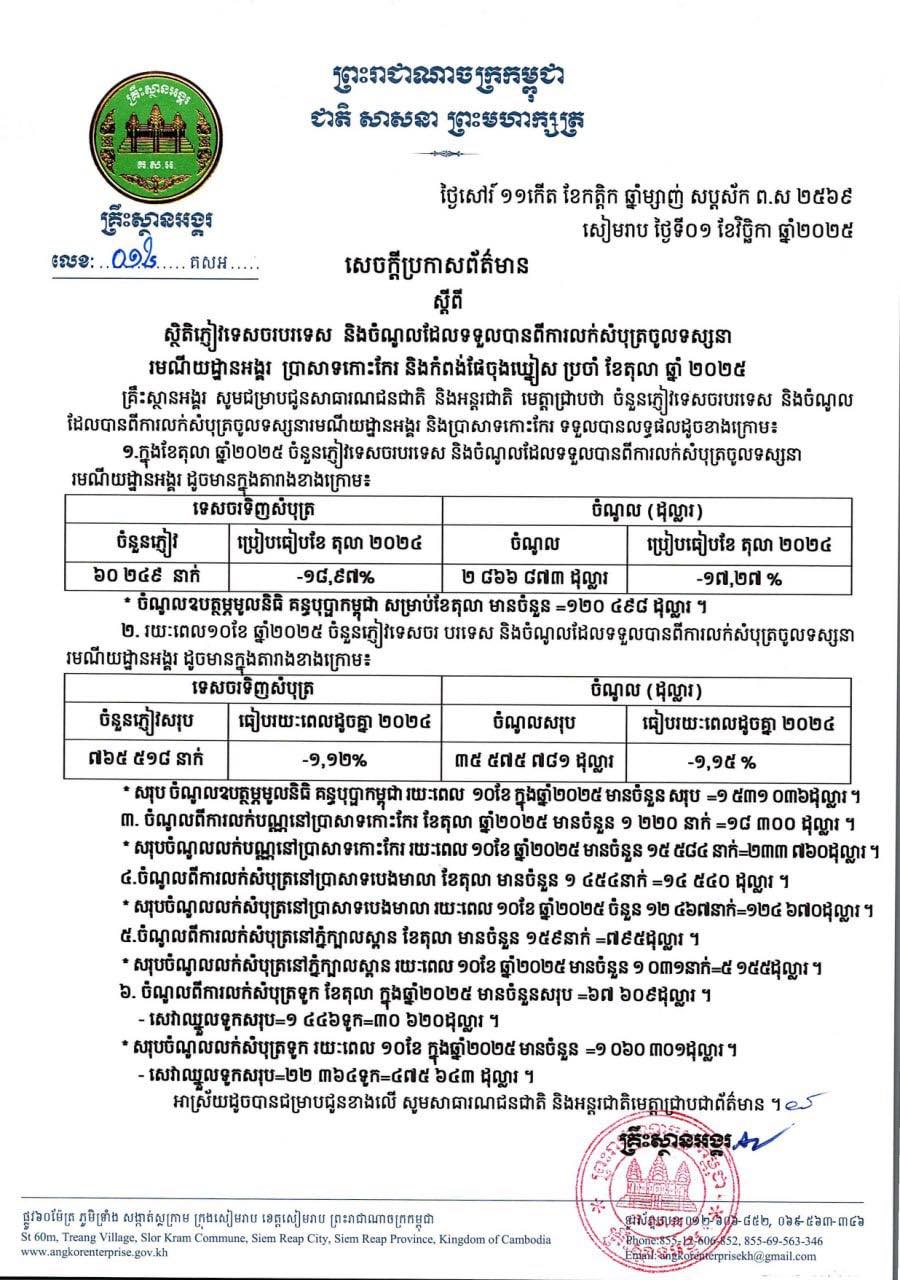 ចំពោះស្ថិតិភ្ញៀវទេសចរបរទេសដែលបានទិញសំបុត្រចូលទស្សនា រមណីយដ្ឋានអង្គរ ក្នុងខែតុលា មានត្រឹមតែជាង៦ម៉ឺននាក់ប៉ុណ្ណោះ បើធៀបនឹងរយៈពេលដូចគ្នាក្នុងឆ្នាំ២០២៤ មានការថយចុះប្រមាណជាង១៨ភាគរយ។