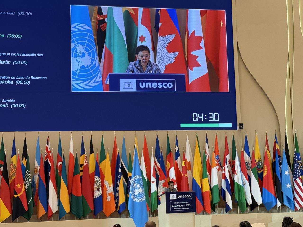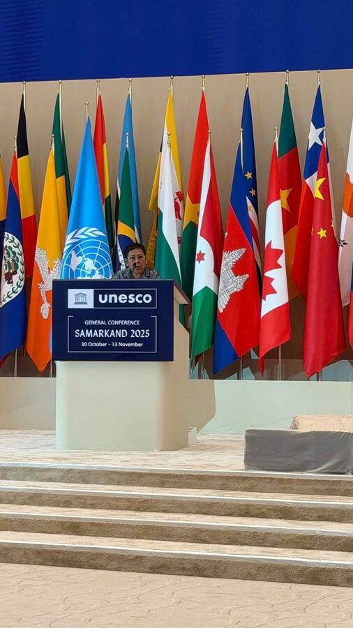 ទីក្រុងសាម៉ាកាន់ ៖ នៅទីក្រុងសាម៉ាកាន់ ប្រទេសអ៊ូសបេគីស្តង់ នារសៀលថ្ងៃទី០៣ ខែវិច្ឆិកា ឆ្នាំ២០២៥ លោកជំទាវបណ្ឌិតសភាចារ្យ ភឿង សកុណា រដ្ឋមន្ត្រីក្រសួងវប្បធម៌ និងវិចិត្រសិល្បៈ អញ្ជើញថ្លែងសន្ទរកថា អំពីគោលនយោបាយរបស់រាជរដ្ឋាភិបាលកម្ពុជា ក្នុងអង្គមហាសន្និបាតលើកទី៤៣នៃអង្គការយូណេស្កូ ដោយបានបញ្ជាក់ជាថ្មី នូវការប្តេជ្ញាចិត្តរបស់រាជរដ្ឋាភិបាលកម្ពុជា ក្នុងការគាំទ្របេសកកម្មរបស់អង្គការយូណេស្កូ ក្នុងការស្ថាបនាសន្តិភាព តាមរយៈការអប់រំ វប្បធម៌ វិទ្យាសាស្ត្រ និងទំនាក់ទំនង ស្របតាមយុទ្ធសាស្ត្របញ្ចកោណ ដំណាក់កាលទី១។ ដោយធ្លាប់រងគ្រោះនូវអំពើប្រល័យពូជសាសន៍ និងសង្គ្រាមនាពេលកន្លងមក កម្ពុជាបានដឹងច្បាស់ពីផលវិបាក នៃការបំផ្លិចបំផ្លាញរបស់សង្គ្រាម និងតម្លៃមិនអាចកាត់ថ្លៃបានរបស់សន្តិភាព ដែលជាមូលដ្ឋានសម្រាប់ការរីកចម្រើន និងការអភិវឌ្ឍប្រទេសជាតិ ប្រកបដោយចីរភាព។ នៅក្នុងវិស័យអប់រំ កម្ពុជាផ្តោតសំខាន់លើបំណិនមូលដ្ឋានសម្រាប់ការសិក្សា ការថែទាំកុមារតូច ការបណ្តុះបណ្តាលបច្ចេកទេស និងវិជ្ជាជីវៈ ការសិក្សាពេញមួយជីវិត និងសមត្ថភាពឌីជីថល ដើម្បីរៀបចំយុវជនឲ្យក្លាយជាសសរទ្រូងដ៏រឹងមាំ និងជាទំពាំងស្នងឬស្សី ដែលមានគុណភាព ដើម្បីប្រឈមជាមួយនឹងបញ្ហាអាកាសធាតុ និងកសាងសេដ្ឋកិច្ចជាតិនាពេលអនាគត ។
