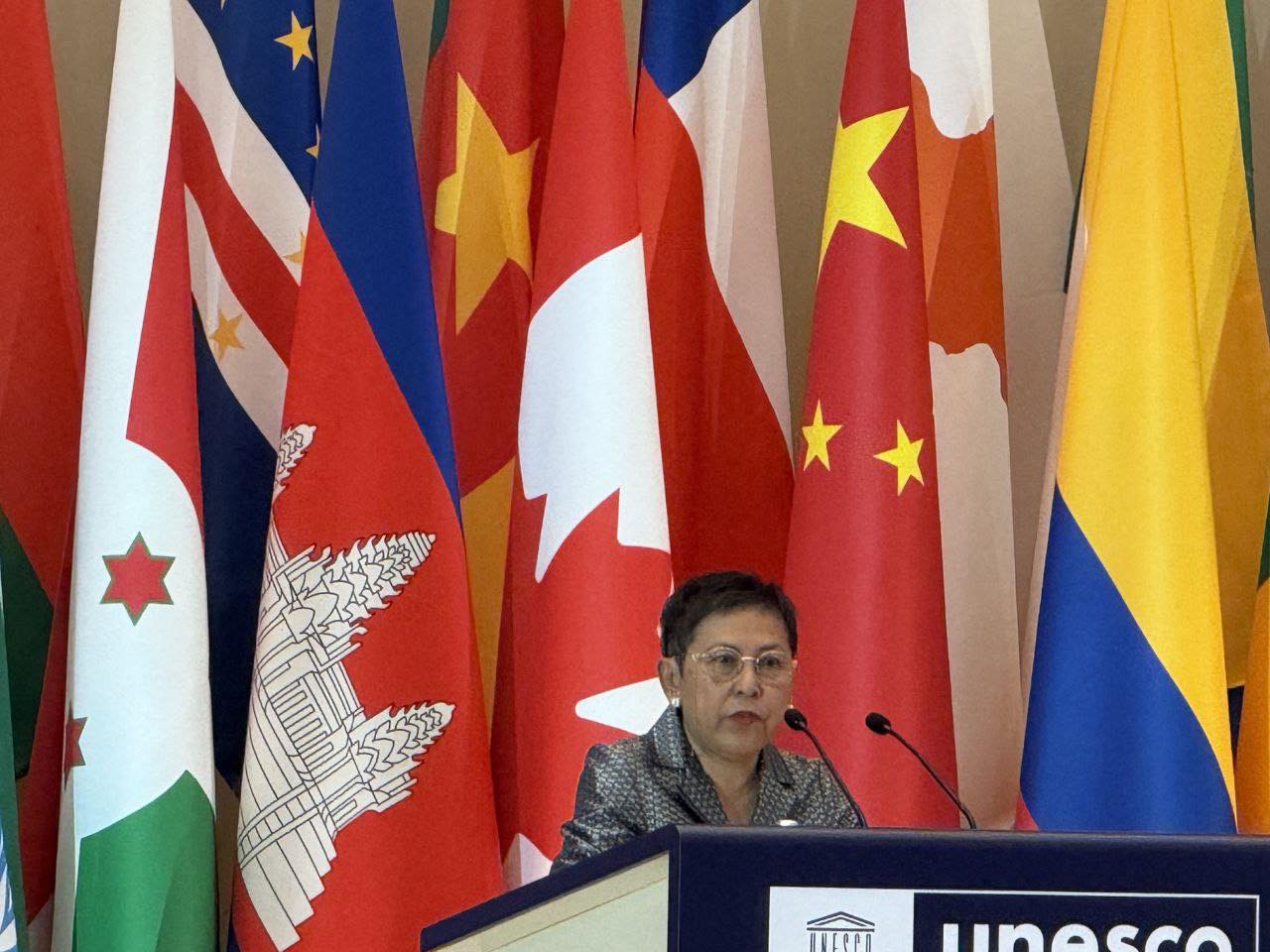 លោកជំទាវបណ្ឌិតសភាចារ្យរដ្ឋមន្ត្រី បានលើកឡើងអំពីការប៉ះទង្គិចនៅតាមព្រំដែនកម្ពុជា-ថៃកន្លងទៅ ដែលបានបង្កឲ្យមានការខូចខាតយ៉ាងធ្ងន់ធ្ងរដល់ បេតិកភណ្ឌវប្បធម៌ពិភពលោក “ប្រាសាទព្រះវិហារ” ។ កម្ពុជាបង្ហាញនូវការសោកស្ដាយយ៉ាងខ្លាំង ចំពោះការខូចខាត ដែលមិនអាចស្ដារឡើងបាន នូវស្នាដៃវប្បធម៌ដ៏មានគុណតម្លៃ និងកម្រមួយនេះ។ ទន្ទឹមគ្នានឹងនេះដែរ កម្ពុជាក៏សូមស្វាគមន៍យ៉ាងកក់ក្តៅចំពោះពិធីចុះហត្ថលេខាលើសេចក្តីថ្លែងការណ៍រួមស្ដីពីកិច្ចព្រមព្រៀងសន្តិភាពគូឡាឡាំពួរវាងកម្ពុជា និងថៃ កាលពីថ្ងៃទី២៦ ខែតុលា ឆ្នាំ២០២៥ កន្លងមកថ្មីៗនេះ ដែលមានការគាំទ្រ និងសាក្សីដោយផ្ទាល់ពីប្រធានាធិបតីសហរដ្ឋអាមេរិក ឯកឧត្តម ដូណាល់ ត្រាំ និងនាយករដ្ឋមន្ត្រីម៉ាឡេស៊ី ឯកឧត្តម អាន់វ៉ា អ៊ីប្រាហ៊ីម។ កម្ពុជាសង្ឃឹមយ៉ាងជ្រាលជ្រៅថា បណ្ដាប្រទេសជាសមាជិកអង្គការយូណេស្កូទាំងអស់ នឹងបន្តប្តេជ្ញារួមគ្នាក្នុងការការពារ និងថែរក្សាសម្បត្តិបេតិកភណ្ឌវប្បធម៌របស់ពិភពលោក ៕