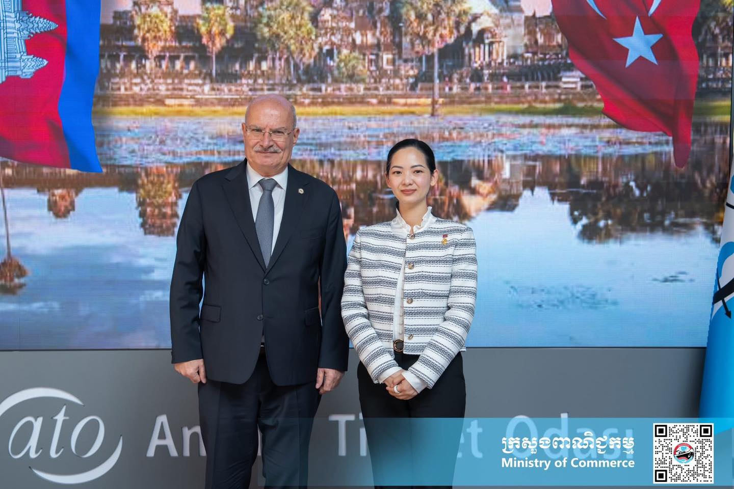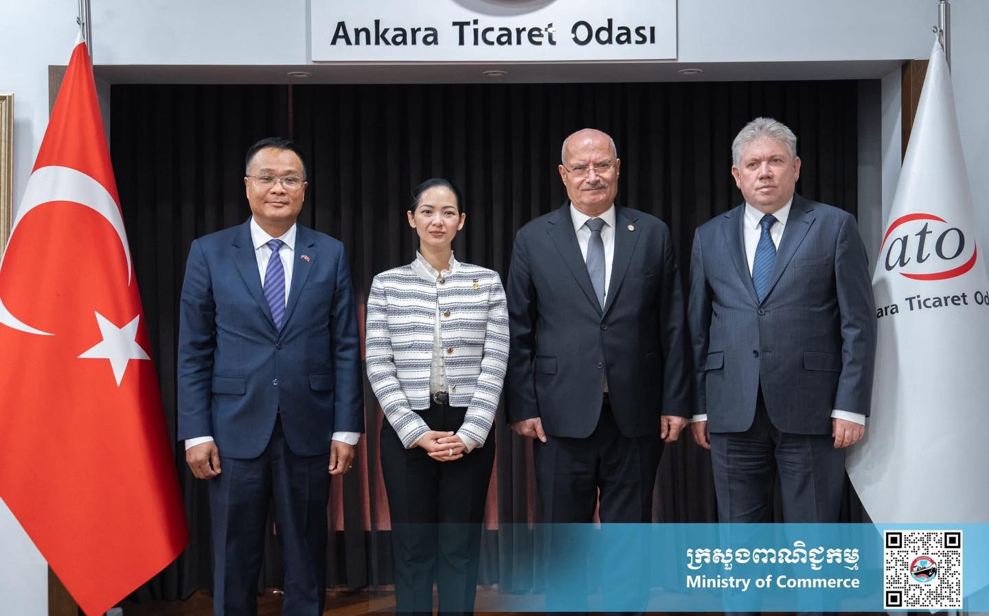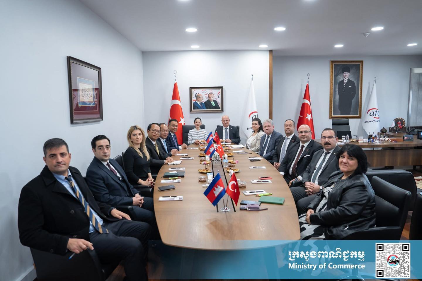 រាជធានីភ្នំពេញ ៖ កម្ពុជា-តួកគីយ៉េ បានផ្លាស់ប្តូរយោបល់គ្នាលើយន្តការនៃការជំរុញពាណិជ្ជកម្មទេ្វភាគីឱ្យឈានដល់កម្រិត ១ពាន់លានដុល្លារក្នុងពេលអនាគត ។ យោងតាមប្រភពក្រសួងពាណិជ្ជកម្ម បានឱ្យដឹងថា ថ្ងៃទី ៣ ខែវិចិ្ឆកា ឆ្នាំ ២០២៥ នៅទីក្រុងអង់ការ៉ា ប្រទេសតួកគីយ៉េ លោកជំទាវ ចម និម្មល រដ្ឋមន្ត្រីក្រសួងពាណិជ្ជកម្ម បានជួបពិភាក្សាការងារជាមួយលោក Gürsel BARAN ប្រធានសភាពាណិជ្ជកម្មអង់ការ៉ា ។