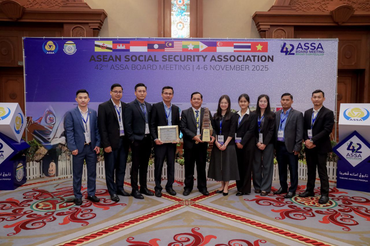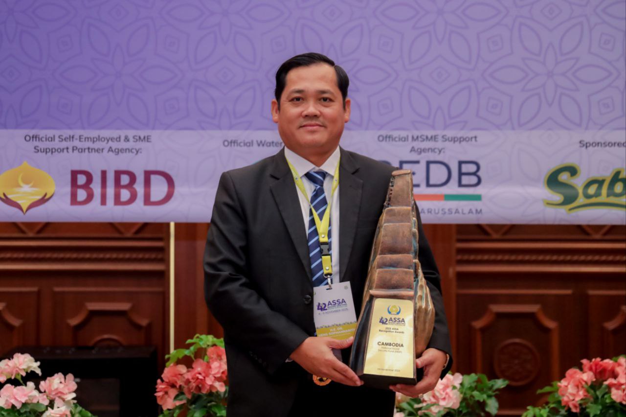 ព្រុយណេ ៖ បេឡាជាតិសន្តិសុខសង្គម (ប.ស.ស.) នៃក្រសួងការងារ និងបណ្តុះបណ្តាលវិជ្ជាជីវៈរបស់ប្រទេសកម្ពុជានៅថ្ងៃទី៥ ខែវិច្ឆិកា ឆ្នាំ២០២១៥នេះ ទទួលបានពានរង្វាន់អង្គភាពឆ្នើមផ្នែកនវានុវត្តន៍ស្ដីពី “ការដាក់ឯកសារទាមទារតាវកាលិកតាមរយៈកម្មវិធីទូរស័ព្ទ (Online Benefit Claim through NSSF Member App)” ក្នុងកិច្ចប្រជុំក្រុមប្រឹក្សាភិបាលសមាគមសន្តិសុខសង្គមអាស៊ាន (ASSA) លើកទី៤២ នៅប្រទេសព្រុយណេ។