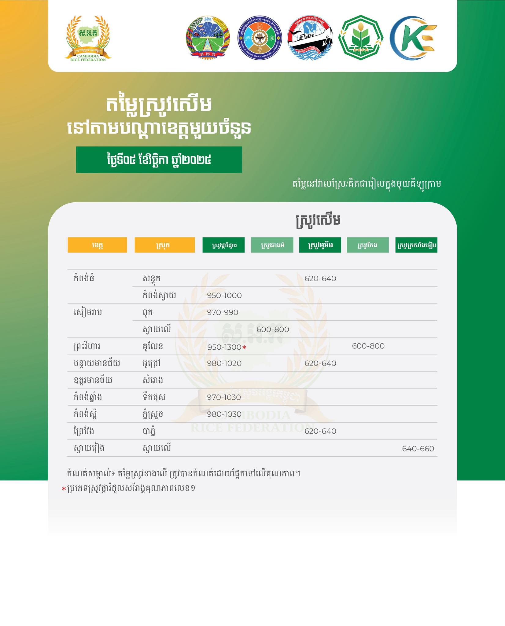 ប្រភពដដែលបានឲ្យដឹងថា សម្រាប់ស្រូវផ្ការំដូលធម្មតា គឺមួយគីឡូក្រាមពី៩៥០រៀល ដល់១.០៣០រៀល ។ ដោយឡែក ស្រូវនាងអំ និងស្រូវកែង គឺមួយគីឡូក្រាមមានតម្លៃពី៦០០ ទៅ៨០០ រៀល ហើយស្រូវអូអឹម គឺមានតម្លៃពី៦២០ ទៅ ៦៤០ រៀលនៅក្នុងមួយគីឡូក្រាម ។ ក្រៅពីនោះស្រូវក្រសាំងទៀប មួយគីឡូក្រាមមានតម្លៃពី៦៤០ រៀលទៅ ៦៦០រៀល ៕