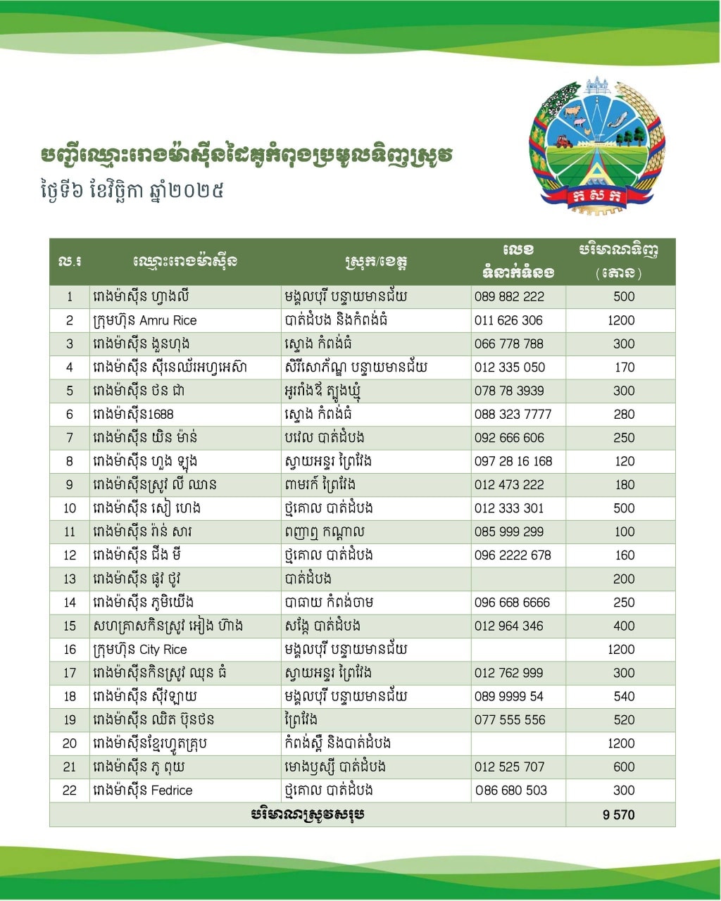 រាជធានីភ្នំពេញ ៖ បរិមាណស្រូវសើមជិត ១មុឺនតោន ត្រូវបានរោងម៉ាសុីន ដៃគូក្រសួងកសិកម្ម សម្រុកប្រមូលទិញពីកសិករនៅទូទាំងប្រទេសក្នុងថ្ងៃនេះ ។ ប្រភពក្រសួងកសិកម្ម នៅថ្ងៃទី ៦ ខែវិច្ឆិកា ឆ្នាំ ២០២៥ នេះបានឱ្យដឹថា បរិមាណស្រូវសើមជិត ១មុឺនតោន ត្រូវបានរោងម៉ាសុីន ដៃគូជាមួយក្រសួងកសិកម្ម សម្រុកប្រមូលទិញពីបងប្អូនកសិករនៅទូទាំងប្រទេសក្នុងថ្ងៃនេះ ។ ចំនួននេះត្រូវបានរំពឹងទុកថា នឹងហក់ឡើងខ្ពស់ខ្លាំងនៅក្នុងខែវិច្ឆិកានេះ ដែលជាខែប្រមូលផលធំក្នុងរដូវកាលនេះលើផ្ទៃដីដាំដុះប្រហែល ១,៥លានហិកតា ជាមួយនឹងបរិមាណផលចន្លោះពី ៤-៥លានតោនស្រូវសើម ។