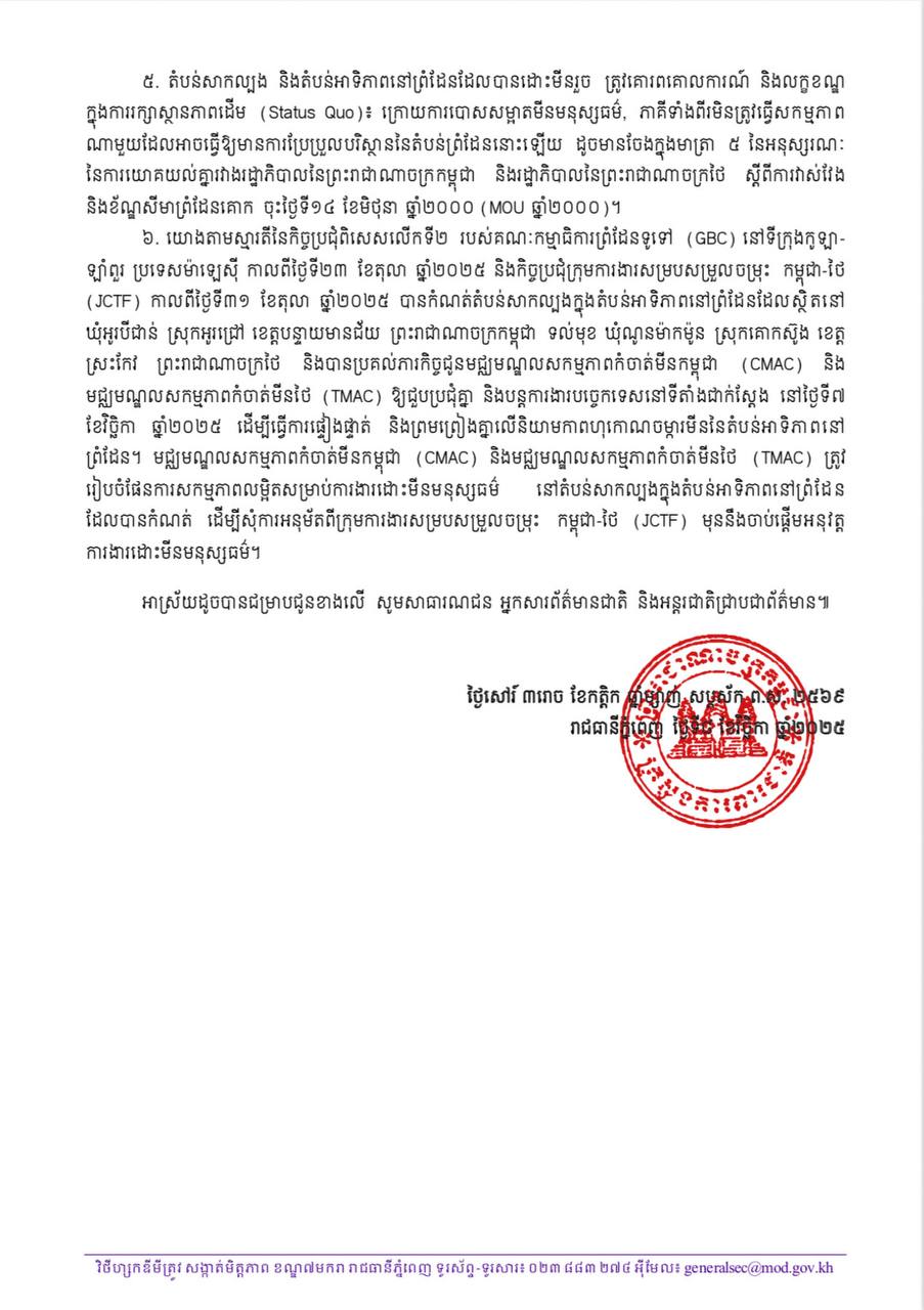 ៦. យោងតាមស្មារតីនៃកិច្ចប្រជុំពិសេសលើកទី២ របស់គណៈកម្មាធិការព្រំដែនទូទៅ (GBC) នៅទីក្រុងកូឡា- ឡាំពួរ ប្រទេសម៉ាឡេស៊ី កាលពីថ្ងៃទី២៣ ខែតុលា ឆ្នាំ២០២៥ និងកិច្ចប្រជុំក្រុមការងារសម្របសម្រួលចម្រុះ កម្ពុជា-ថៃ (JCTF) កាលពីថ្ងៃទី៣១ ខែតុលា ឆ្នាំ២០២៥ បានកំណត់តំបន់សាកល្បងក្នុងតំបន់អាទិភាពនៅព្រំដែនដែលស្ថិតនៅ ឃុំអូរបីជាន់ ស្រុកអូរជ្រៅ ខេត្តបន្ទាយមានជ័យ ព្រះរាជាណាចក្រកម្ពុជា ទល់មុខ ឃុំណូនម៉ាកម៉ូន ស្រុកគោកស៊ូ ខេត្ត ស្រះកែវ ព្រះរាជាណាចក្រថៃ និងបានប្រគល់ភារកិច្ចជូនមជ្ឈមណ្ឌលសកម្មភាពកំចាត់មីនកម្ពុជា (CMAC) និង មជ្ឈមណ្ឌលសកម្មភាពកំចាត់មីនថៃ (TMAC) ឱ្យជួបប្រជុំគ្នា និងបន្តការងារបច្ចេកទេសនៅទីតាំងជាក់ស្ដែង នៅថ្ងៃទី៧ ខែវិច្ឆិកា ឆ្នាំ២០២៥ ដើម្បីធ្វើការផ្ទៀងផ្ទាត់ និងព្រមព្រៀងគ្នាលើនិយាមកាពហុកោណចម្ការមីននៃតំបន់អាទិភាពនៅ ព្រំដែន។ មជ្ឈមណ្ឌលសកម្មភាពកំចាត់មីនកម្ពុជា (CMAC) និងមជ្ឈមណ្ឌលសកម្មភាពកំចាត់មីន (TMAC) ត្រូវ រៀបចំផែនការសកម្មភាពលម្អិតសម្រាប់ការងារដោះមីនមនុស្សធម៌នៅតំបន់សាកល្បងក្នុងតំបន់អាទិភាពនៅព្រំដែន ដែលបានកំណត់ ដើម្បីសុំការអនុម័តពីក្រុមការងារសម្របសម្រួលចម្រុះ កម្ពុជា-ថៃ (JCTF) មុននឹងចាប់ផ្តើមអនុវត្ត ការងារដោះមីនមនុស្សធម៌ ៕