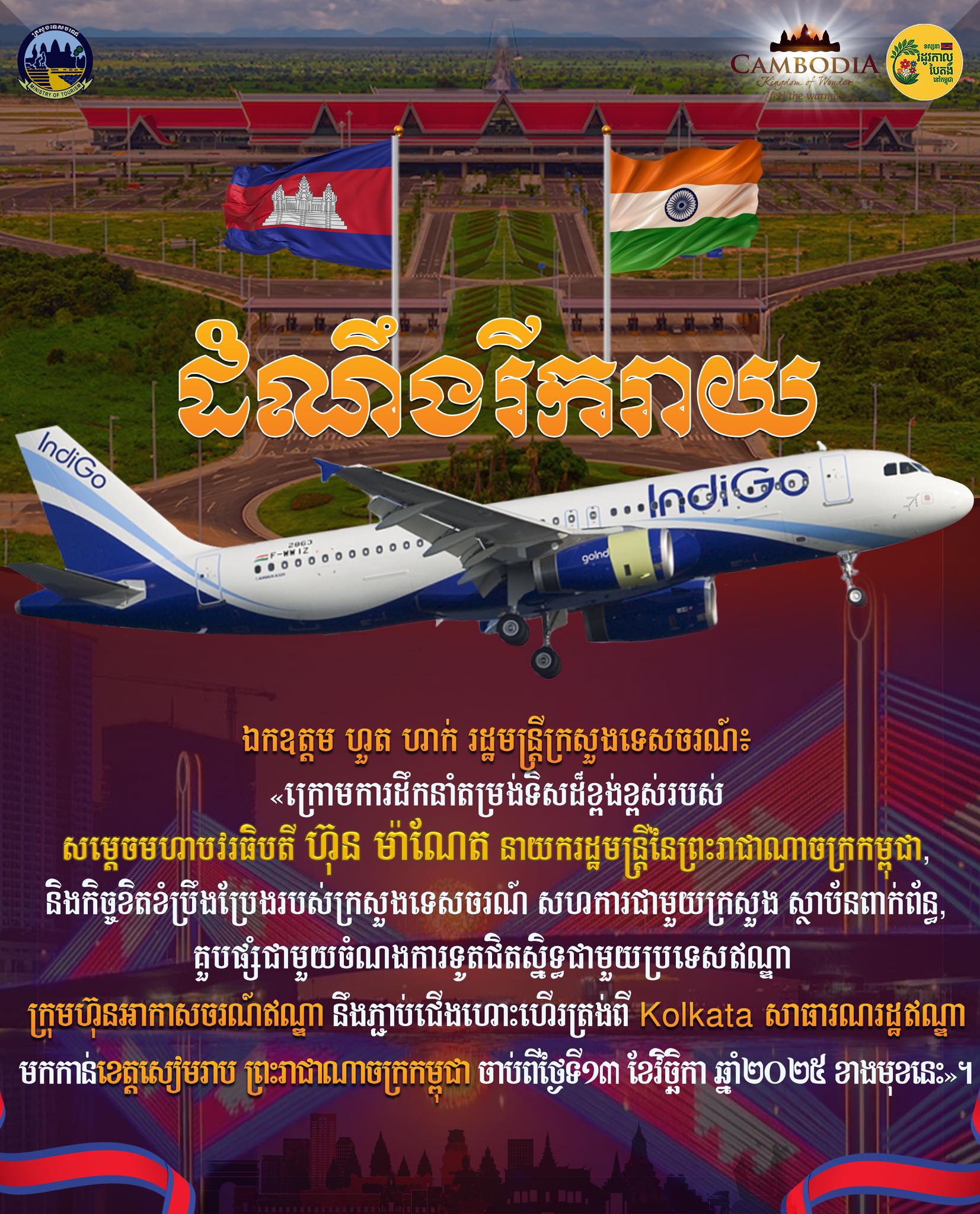 ជាក់ស្តែងនាថ្ងៃទី១២ ខែវិច្ឆិកានេះ ក្រសួងទេសចរណ៍បានប្រកាសថា ៖ លោក ហួត ហាក់ រដ្ឋមន្ត្រីក្រសួងទេសចរណ៍ ៖ «ក្រោមការដឹកនាំតម្រង់ទិសដ៏ខ្ពង់ខ្ពស់របស់សម្តេចមហាបវរធិបតី ហ៊ុន ម៉ាណែត នាយករដ្ឋមន្ត្រីនៃព្រះរាជាណាចក្រកម្ពុជា និងកិច្ចខិតខំប្រឹងប្រែងរបស់ក្រសួងទេសចរណ៍ សហការជាមួយក្រសួង ស្ថាប័នពាក់ព័ន្ធ គួបផ្សំជាមួយចំណងការទូតជិតស្និទ្ធជាមួយប្រទេសឥណ្ឌា ក្រុមហ៊ុនអាកាសចរណ៍ឥណ្ឌា នឹងភ្ជាប់ជើងហោះហើរត្រង់ពី Kolkata សាធារណរដ្ឋឥណ្ឌា មកកាន់ខេត្តសៀមរាប ព្រះរាជាណាចក្រកម្ពុជា ចាប់ពីថ្ងៃទី១៣ ខែវិច្ឆិកា ឆ្នាំ២០២៥ ខាងមុខនេះ» ។