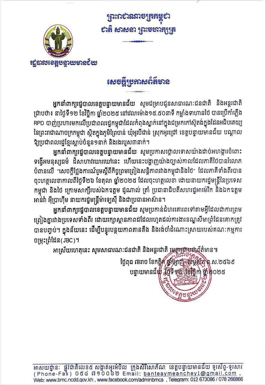 ខេត្តបន្ទាយមានជ័យ ៖ អ្នកនាំពាក្យរដ្ឋបាលខេត្តបន្ទាយមានជ័យ បានចេញសេចក្តីប្រកាសព័ត៌មានថា នៅវេលាម៉ោង១៥.៥០នាទី ថ្ងៃទី១២ ខែវិច្ឆិកា ឆ្នាំ២០២៥ កម្លាំងទាហានថៃ បានប្រើកាំភ្លើង…