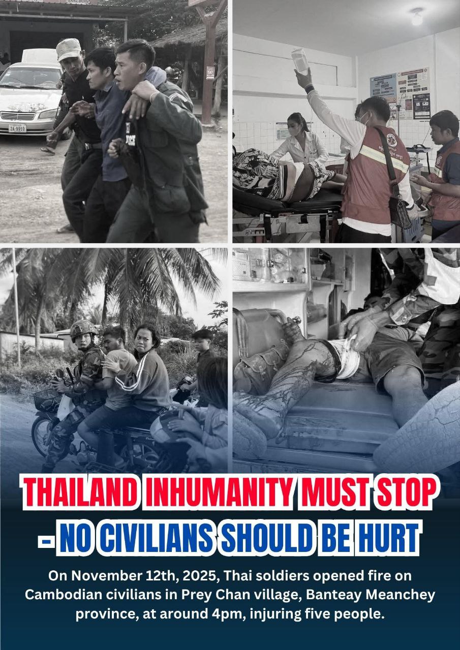 ថ្លែងការណ៍បានលើកឡើងថា រាជរដ្ឋាភិបាលកម្ពុជា ថ្កោលទោសយ៉ាងខ្លាំងបំផុត ចំពោះការបាញ់ប្រហារដោយគ្មានហេតុផលរបស់ កងកម្លាំងថៃ មកលើជនស៊ីវិលខ្មែរនៅភូមិព្រៃចាន់ ខេត្តបន្ទាយមានជ័យ កាលពីរសៀលថ្ងៃទី១២ ខែវិច្ឆិកា ឆ្នាំ២០២៥ ដែលបណ្តាលឱ្យជនស៊ីវិលម្នាក់ស្លាប់ និង ៣នាក់រងរបួស ។