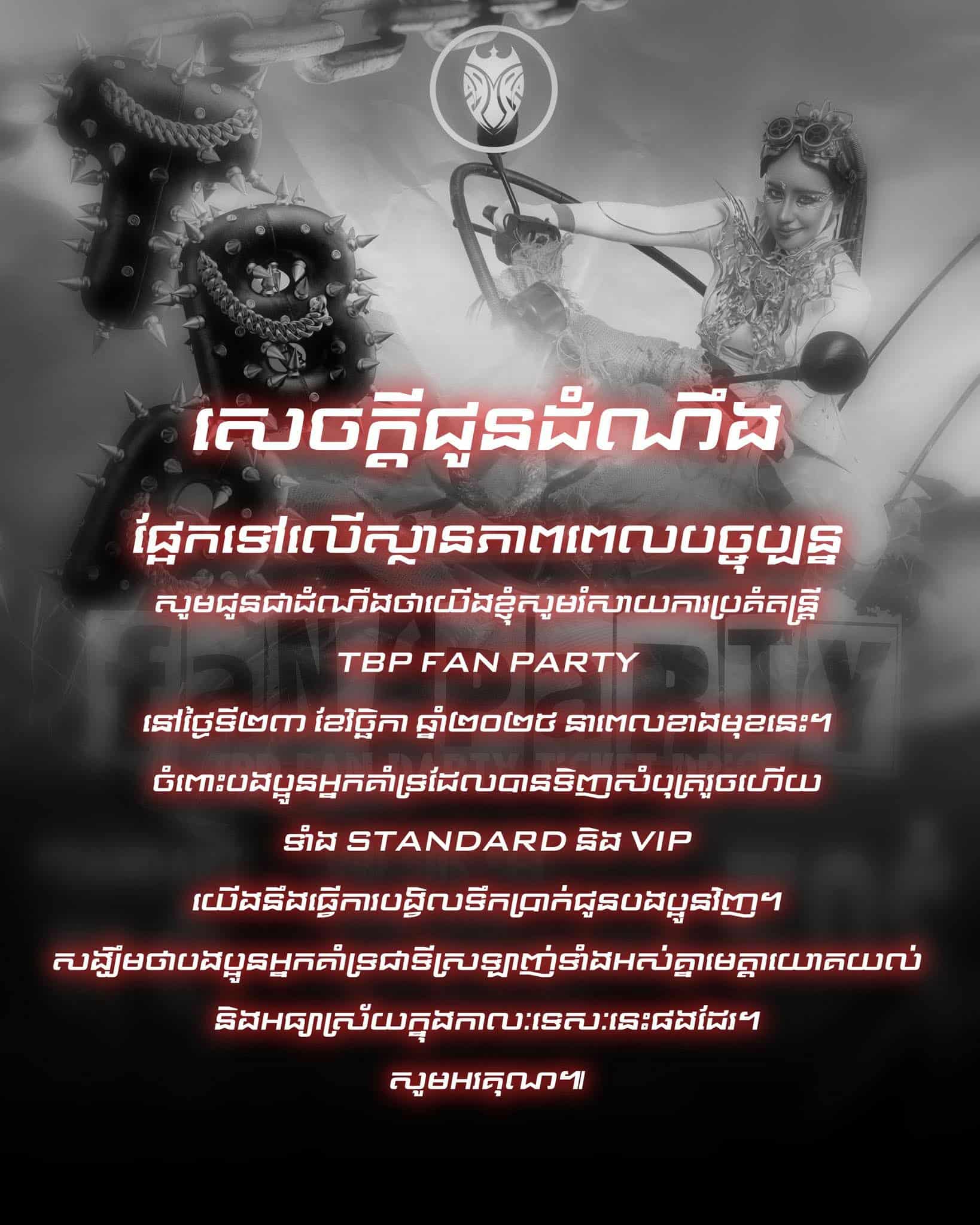 យោងតាមសេចក្តីជូនដំណឹងបានអោយដឹងថា ផ្អែកទៅលើស្ថានភាពបច្ចុប្បន្ន សូមជូនជាដំណឹងថា យើងខ្ញុំសូមរំសាយការប្រគំតន្ត្រី TBP Fan Party នៅថ្ងៃទី២៣ ខែវិច្ឆិកា ឆ្នាំ២០២៥ នាពេលមុខនេះ ។