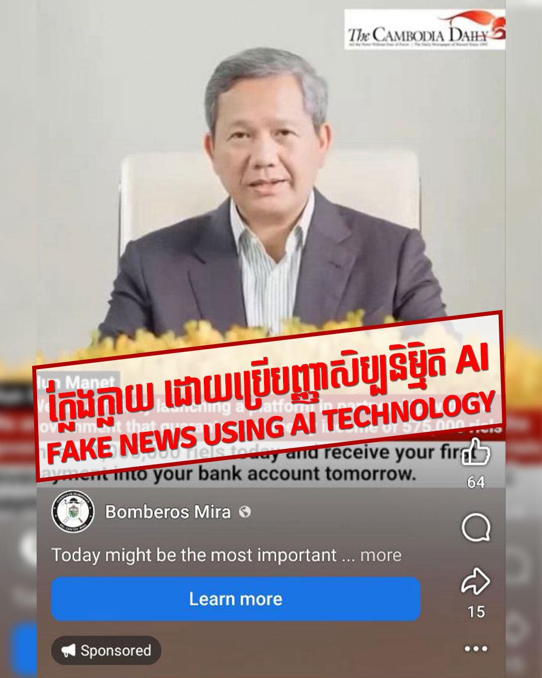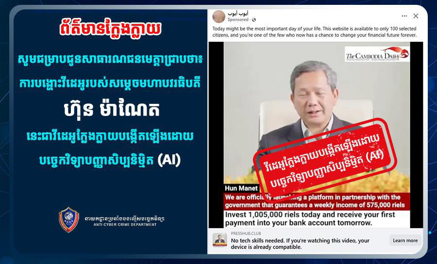 រាជធានីភ្នំពេញ ៖ ថ្មីៗនេះ នាយកដ្ឋានប្រឆាំងបទល្មើសបច្ចេកវិទ្យា បានសង្កេតឃើញថា មានជនអនាមិកប្រើប្រាស់ទំព័រហ្វេសប៊ុកមួយបានបង្ហោះវីដេអូក្លែងក្លាយ ដែលបង្កើតដោយបច្ចេកវិទ្យាបញ្ញាសប្បនិមិត្ត (AI) ដោយក្លែងបន្លំជាសម្ដេចមហាបវរធិបតី ហ៊ុន ម៉ាណែត នាយករដ្ឋមន្ដ្រី នៃព្រះរាជាណាចក្រកម្ពុជា ដែលក្នុងខ្លឹមសារវីដេអូនោះនិយាយអូសទាញអ្នកចូលមើល