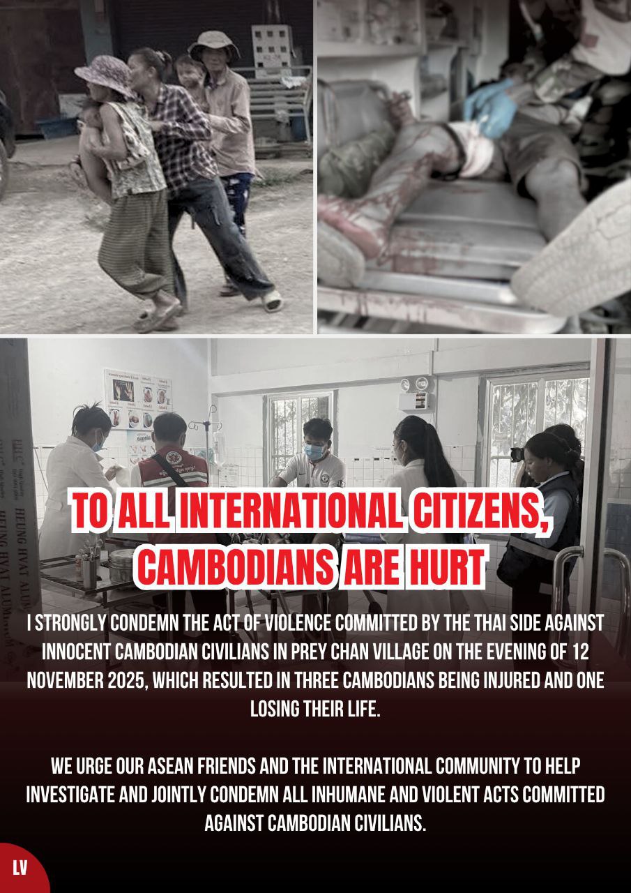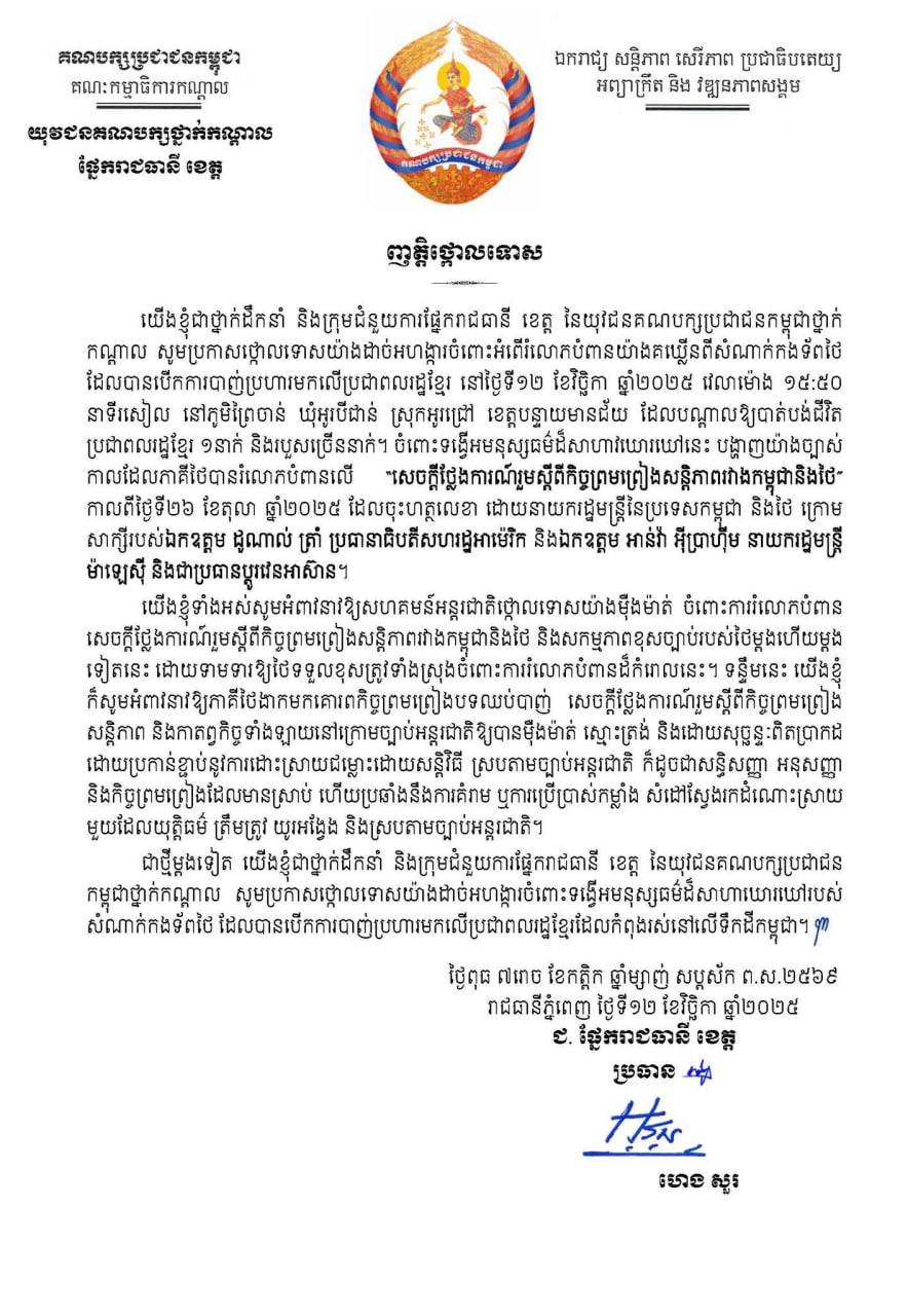 រាជធានីភ្នំពេញ ៖ ផ្នែករាជធានី ខេត្ត នៃយុវជនគណបក្សប្រជាជនកម្ពុជាថ្នាក់កណ្តាល បានចេញញត្តិថ្កោលទោសយ៉ាងដាច់អហង្ការចំពោះអំពើរំលោភបំពានយ៉ាងគឃ្លើនពីសំណាក់កងទ័ពថៃ ដែលបានបើកការបាញ់ប្រហារពីសំណាក់យោធាថៃមកលើ ប្រជាពលរដ្ឋខ្មែរ បណ្តាលឱ្យជនស៊ីវិល ១រូបបាត់បង់ជីវិត និង ៣រូបផ្សេងទៀតរងរបួស នៅក្នុងភូមិព្រៃចាន់ ឃុំអូរបីជាន់ ស្រុកអូរជ្រៅ ខេត្តបន្ទាយមានជ័យ នៅវេលាម៉ោងប្រមាណ ១៥:៥០នាទី ថ្ងៃពុធ ទី១២ ខែវិច្ឆិកា ឆ្នាំ២០២៥ ។