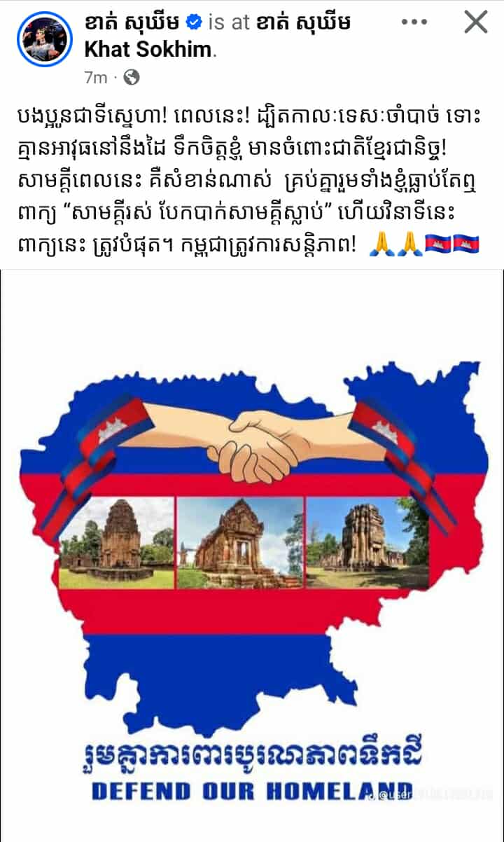 តាមរយៈបណ្តាញសង្គម អ្នកនាង ខាត់ សុឃីម បានបង្ហោះសំណេរថា បងប្អូនជាទីស្នេហា! ពេលនេះ! ដ្បិតកាលៈទេសៈចាំបាច់ ទោះគ្មានអាវុធនៅនឹងដៃ ទឹកចិត្តខ្ញុំ មានចំពោះជាតិខ្មែរជានិច្ច! សាមគ្ដីពេលនេះ គឺសំខាន់ណាស់ គ្រប់គ្នារួមទាំងខ្ញុំធ្លាប់តែឮពាក្យ «សាមគ្ដីរស់ បែកបាក់សាមគ្ដីស្លាប់» ហើយវិនាទីនេះ ពាក្យនេះ ត្រូវបំផុត ។ កម្ពុជាត្រូវការសន្តិភាព! ។