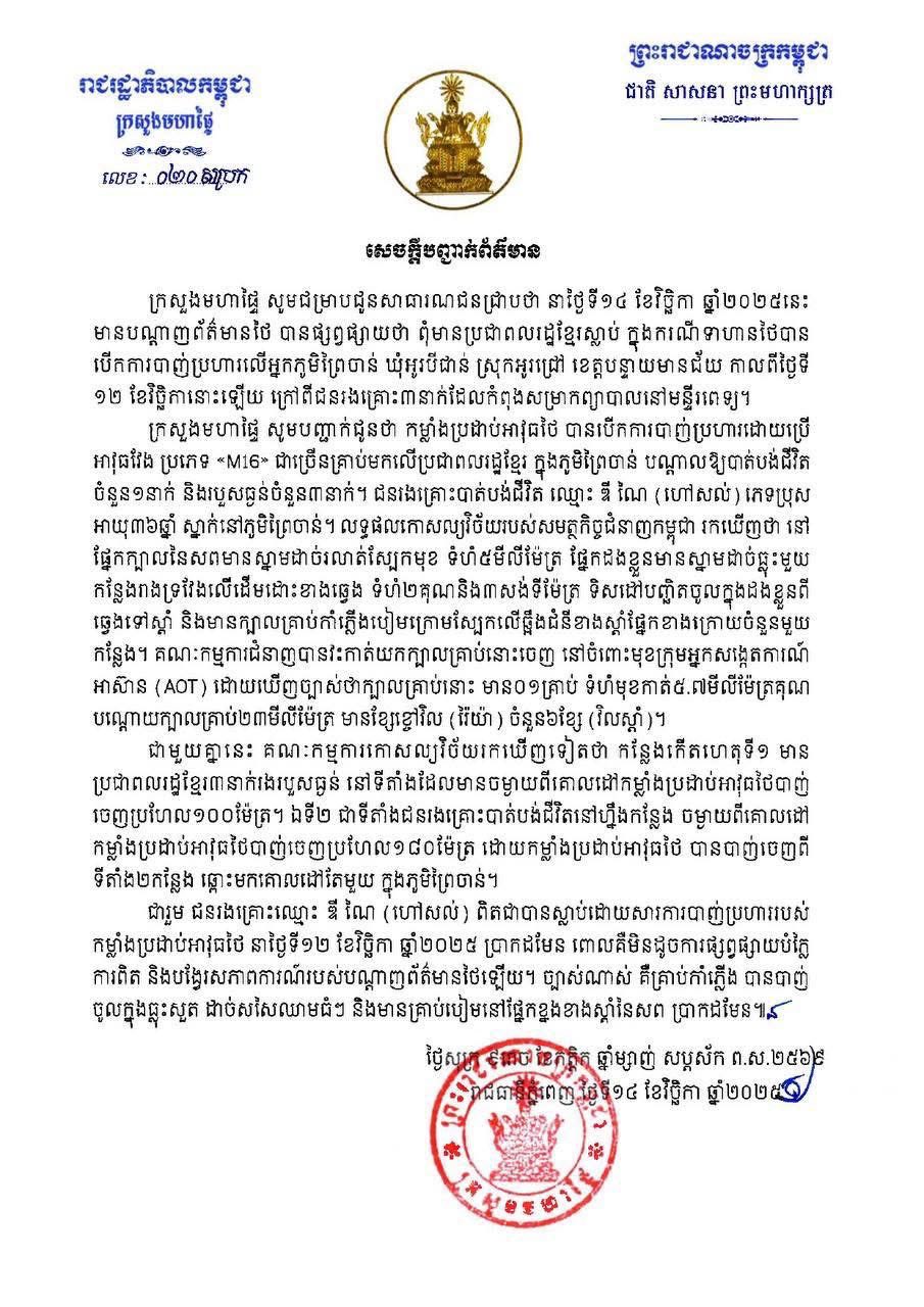 រាជធានីភ្នំពេញ ៖ ក្រសួងមហាផ្ទៃ សូមជម្រាបជូនសាធារណជនជ្រាបថា នាថ្ងៃទី១៤ ខែវិច្ឆិកា ឆ្នាំ២០២៥នេះ មានបណ្តាញព័ត៌មានថៃ បានផ្សព្វផ្សាយថា ពុំមានប្រជាពលរដ្ឋខ្មែរស្លាប់ ក្នុងករណីទាហានថៃបានបើកការបាញ់ប្រហារលើអ្នកភូមិព្រៃចាន់ ឃុំអូរបីជាន់ ស្រុកអូរជ្រៅ ខេត្តបន្ទាយមានជ័យ កាលពីថ្ងៃទី ១២ ខែវិច្ឆិកា នោះឡើយ ក្រៅពីជនរងគ្រោះ ៣នាក់ ដែលកំពុងសម្រាកព្យាបាលនៅមន្ទីរពេទ្យ ។