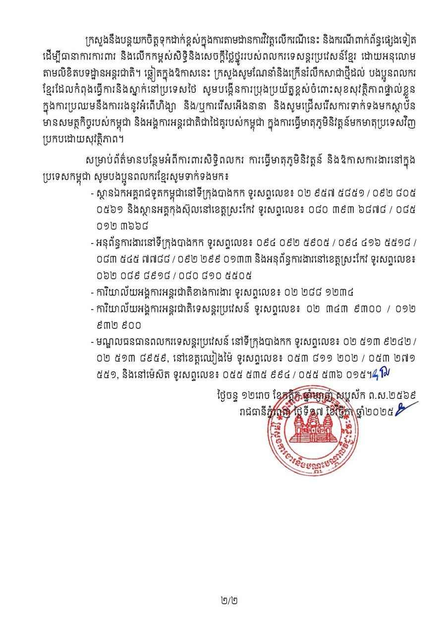 ក្រសួងនឹងបន្តយកចិត្តទុកដាក់ខ្ពស់ ក្នុងការតាមដានការវិវត្តលើករណីនេះ និងករណីពាក់ព័ន្ធផ្សេងទៀត ដើម្បីធានាការការពារ និងលើកកម្ពស់សិទ្ធិនិងសេចក្ដីថ្លៃថ្នូររបស់ពលករទេសន្តរប្រវេសន៍ខ្មែរ ដោយអនុលោមតាមលិខិតបទដ្ឋានអន្តរជាតិ ។ ឆ្លៀតក្នុងឱកាសនេះ ក្រសួងសូមណែនាំនិងក្រើនរំលឹកសាជាថ្មីដល់ បងប្អូនពលករខ្មែរដែលកំពុងធ្វើការ និងស្នាក់នៅប្រទេសថៃ សូមបង្កើនការប្រុងប្រយ័ត្នខ្ពស់ចំពោះសុខសុវត្ថិភាពផ្ទាល់ខ្លួនក្នុងការប្រឈមនឹងការរងនូវអំពើហិង្សា និង/ឬការរើសអើងនានា និងសូមជ្រើសរើសការទាក់ទងមកស្ថាប័នមានសមត្ថកិច្ចរបស់កម្ពុជា និងអង្គការអន្តរជាតិជាដៃគូរបស់កម្ពុជា ក្នុងការធ្វើមាតុភូមិនិវត្តន៍មកមាតុប្រទេសវិញប្រកបដោយសុវត្ថិភាព។ នេះបើយោងតាមសេចក្តីថ្លែងការណ៍ដដែល ៕ អត្ថបទសហការ