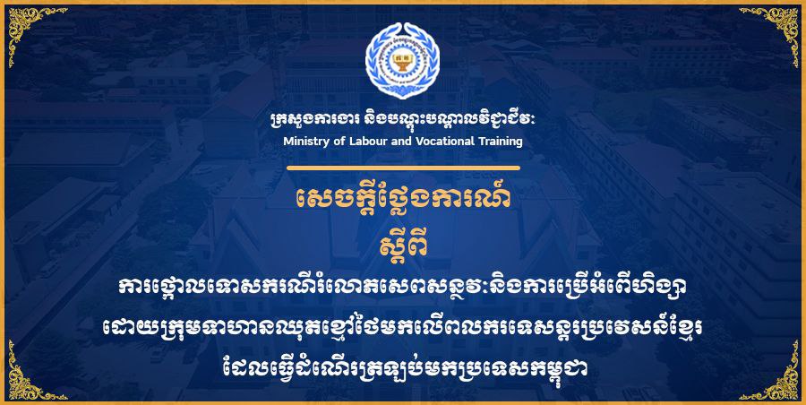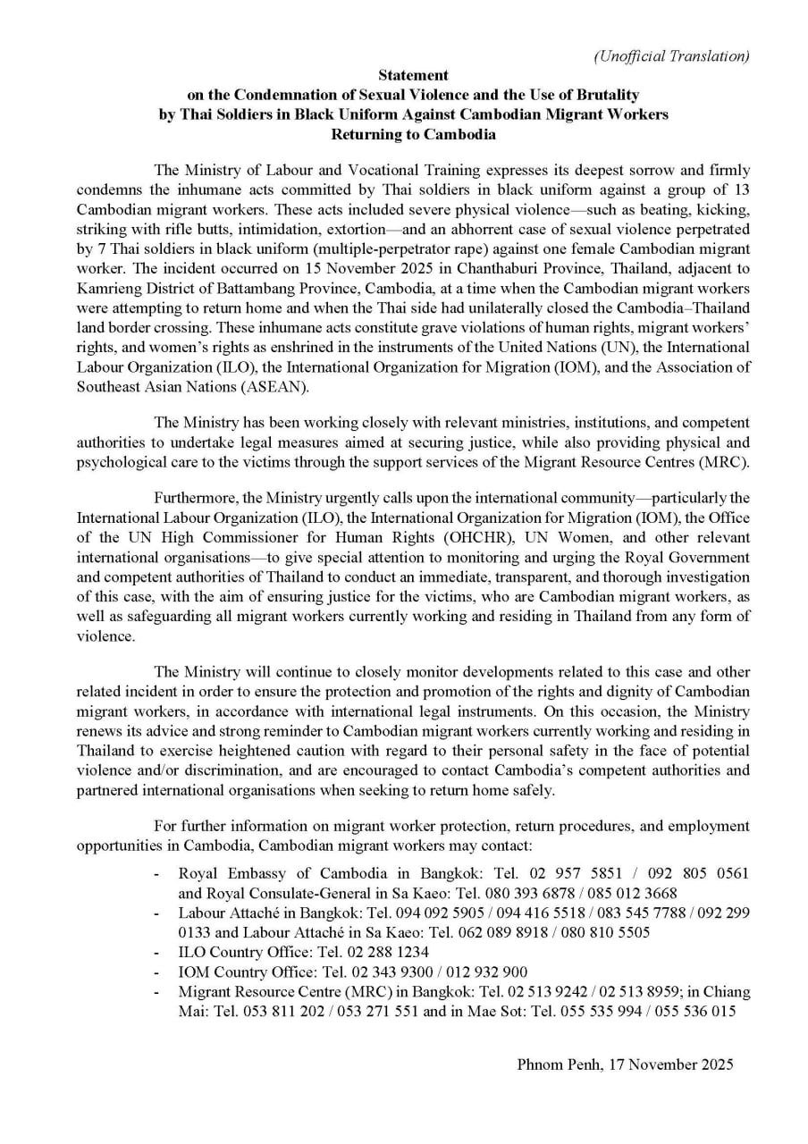 រាជធានីភ្នំពេញ៖ ក្រសួងការងារ និងបណ្តុះបណ្តាលវិជ្ជាជីវៈ សូមសម្តែងការសោកស្តាយយ៉ាងខ្លាំងបំផុត និងសូមប្រកាសថ្កោលទោសយ៉ាងដាច់អហង្ការចំពោះទង្វើអមនុស្សធម៌ ដែលក្រុមទាហានឈុតខ្មៅថៃបានធ្វើមកលើក្រុមពលករទេសន្តរប្រវេសន៍ខ្មែរចំនួន ១៣នាក់ ដោយបានប្រើអំពើហិង្សាយ៉ាងសាហាវយង់ឃ្នងក្នុងរូបភាពជាការវាយដំ ទាត់ធាក់ អុកស្វាយកាំភ្លើង ជំរិតទារប្រាក់ និងអំពើថោកទាបជាករណីរំលោភសេពសន្ថវៈ (រំលោភបូក) ដោយទាហានឈុតខ្មៅថៃចំនួន ៧នាក់ ទៅលើពលករខ្មែរជាស្ត្រី ១នាក់ ដែលករណីនេះបានកើតឡើងនៅក្នុងខេត្តចាន់បុរី នៃប្រទេសថៃ ជាប់ព្រំប្រទល់ស្រុកកំរៀង ខេត្តបាត់ដំបង នៃប្រទេសកម្ពុជានៅពេលដែលពលករខ្មែរបានធ្វើដំណើរចេញពីប្រទេសថៃត្រឡប់មកប្រទេសកម្ពុជា កាលពីថ្ងៃទី១៥ ខែវិច្ឆិកា ឆ្នាំ២០២៥កន្លងទៅ ខណៈពេលដែលច្រកព្រំដែនគោកកម្ពុជា-ថៃត្រូវបានបិទដោយឯកតោភាគីពីភាគីថៃ។ នេះបើយោងតាមសេចក្តីថ្លែងការណ៍ដែលបានចេញនៅថ្ងៃទី១៨ ខែវិច្ឆិកា ឆ្នាំ២០២៥នេះ ។