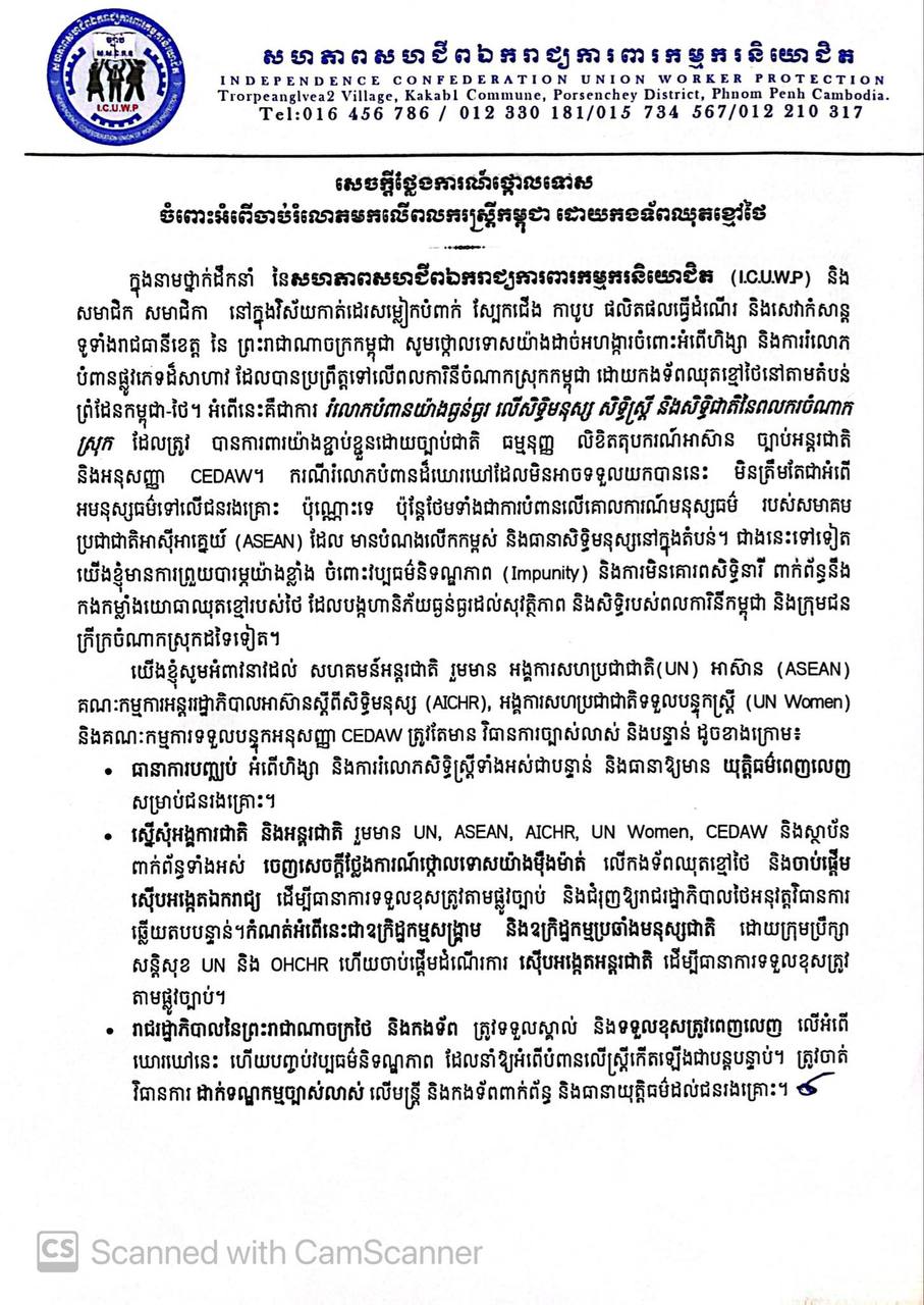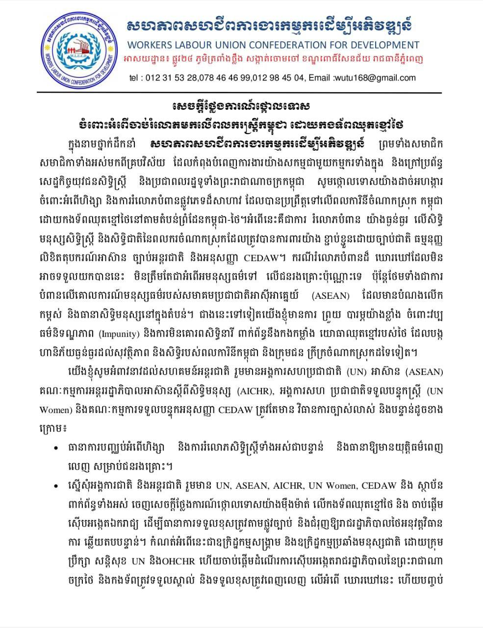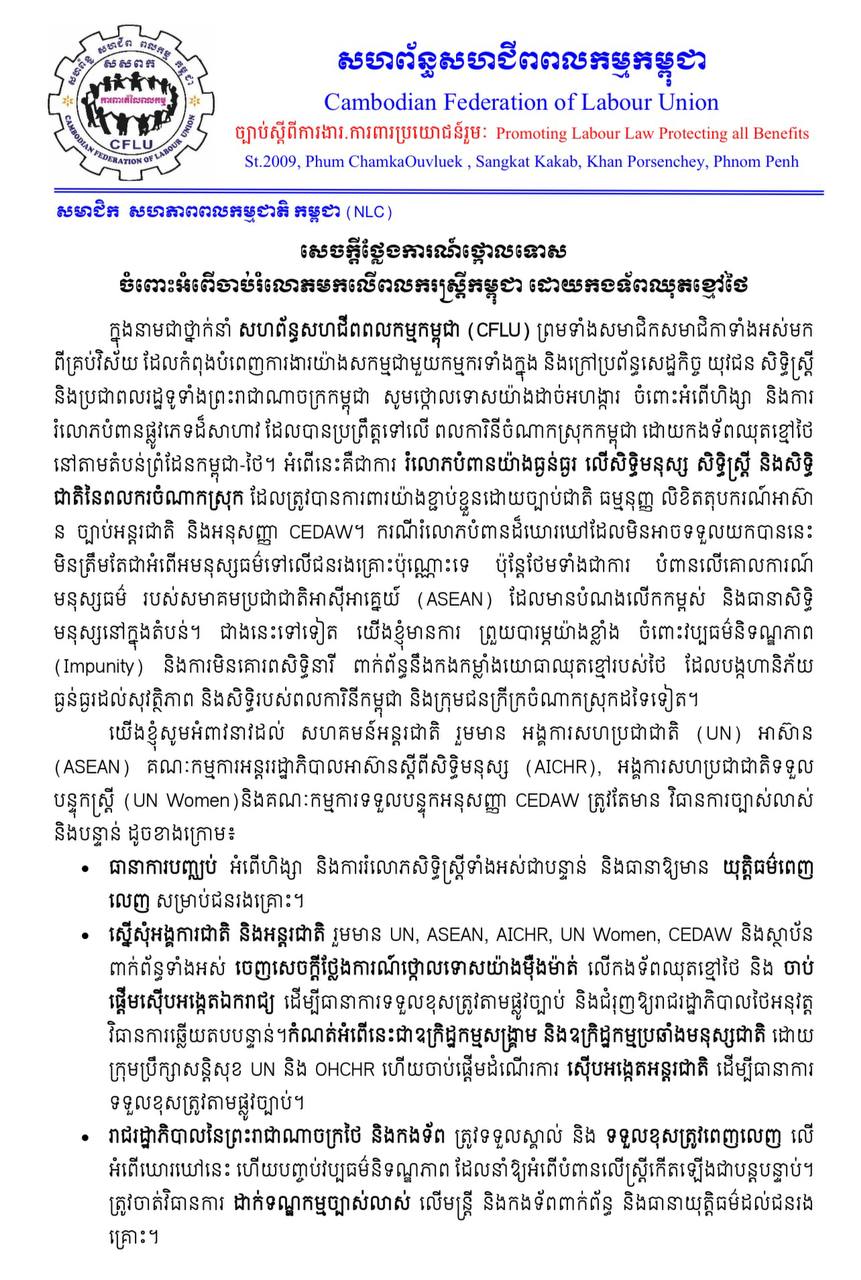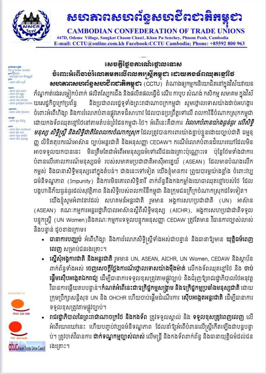 សហជីពនៅកម្ពុជា ថ្កោលទោសយ៉ាងដាច់អហង្ការ ចំពោះអំពើចាប់រំ.លោ.ភបូកលើពលករស្ត្រីកម្ពុជាដោយកងទ័ពឈុតខ្មៅថៃ