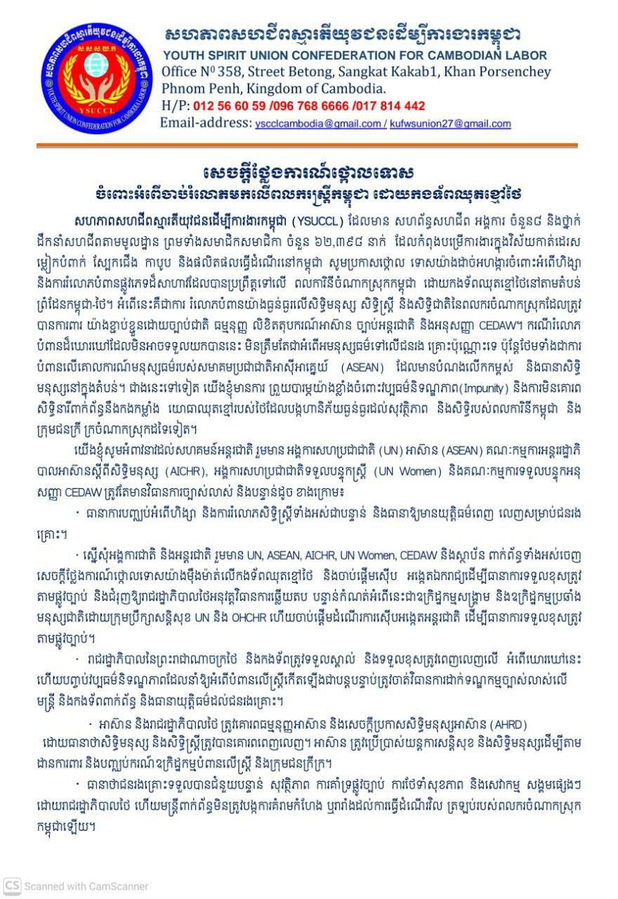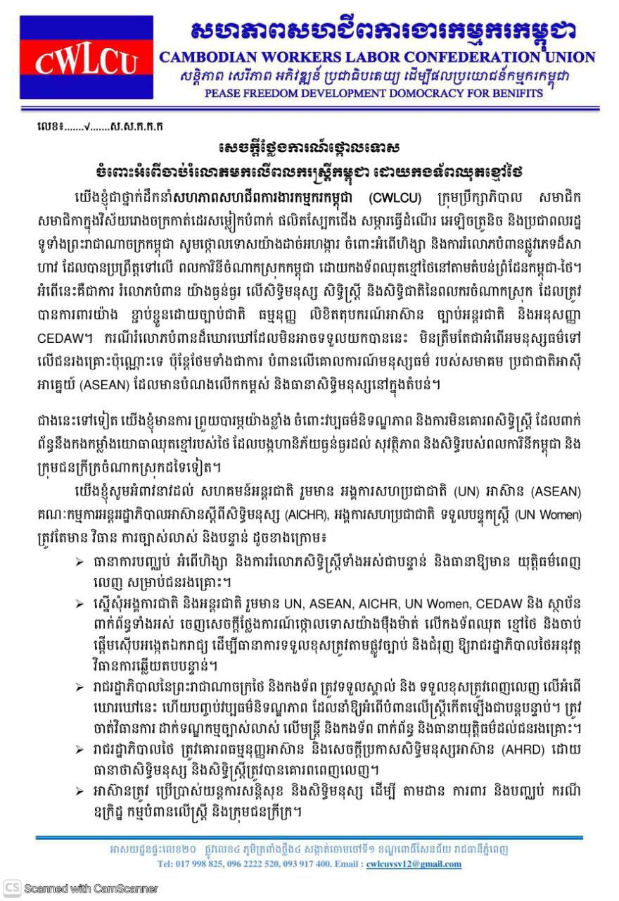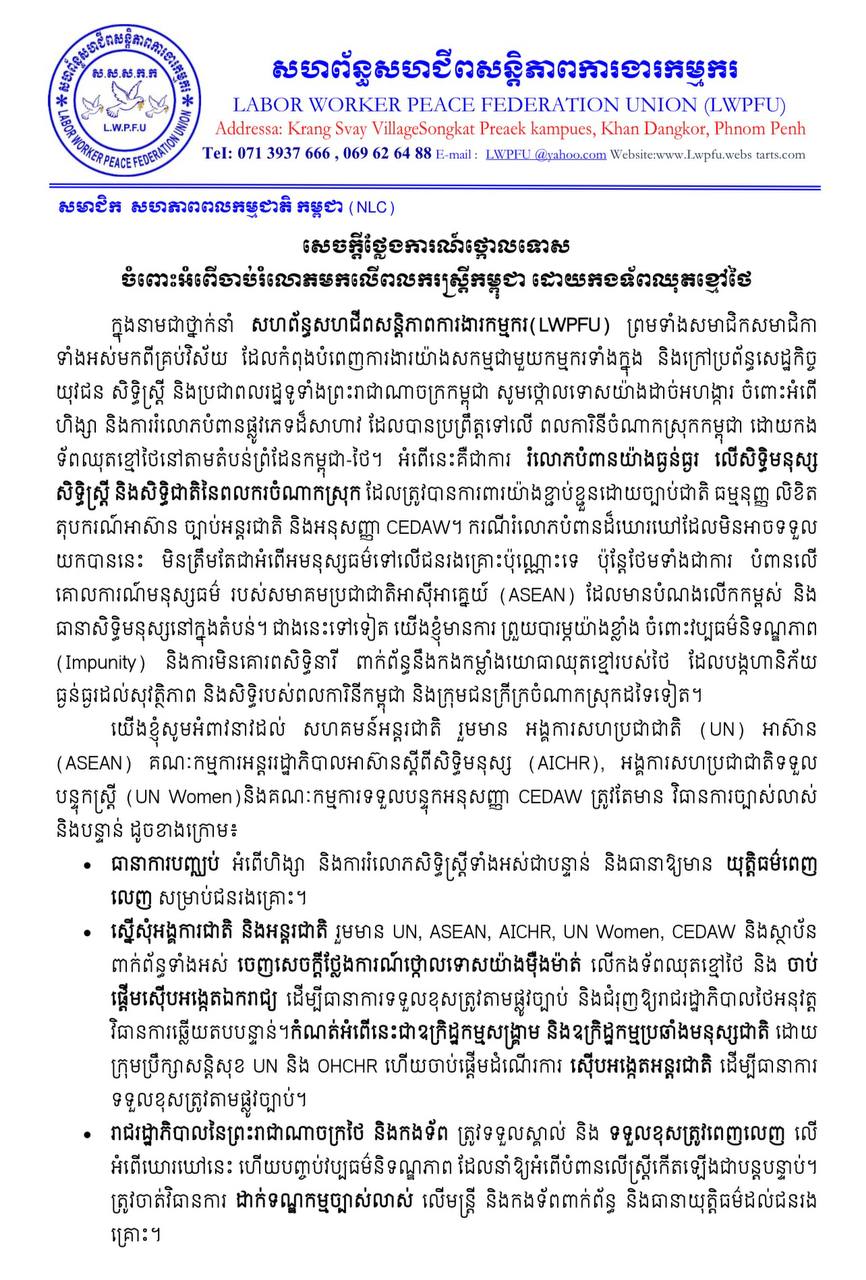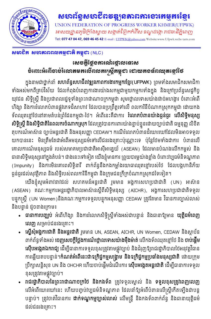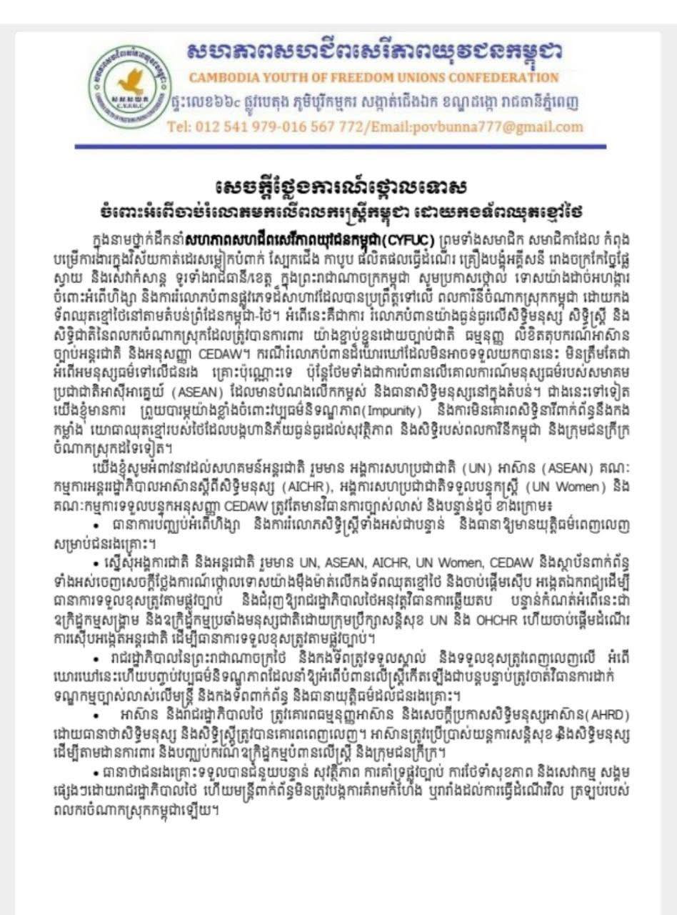 សហជីពនៅកម្ពុជា ថ្កោលទោសយ៉ាងដាច់អហង្ការ ចំពោះអំពើចាប់រំ.លោ.ភបូកលើពលករស្ត្រីកម្ពុជាដោយកងទ័ពឈុតខ្មៅថៃ