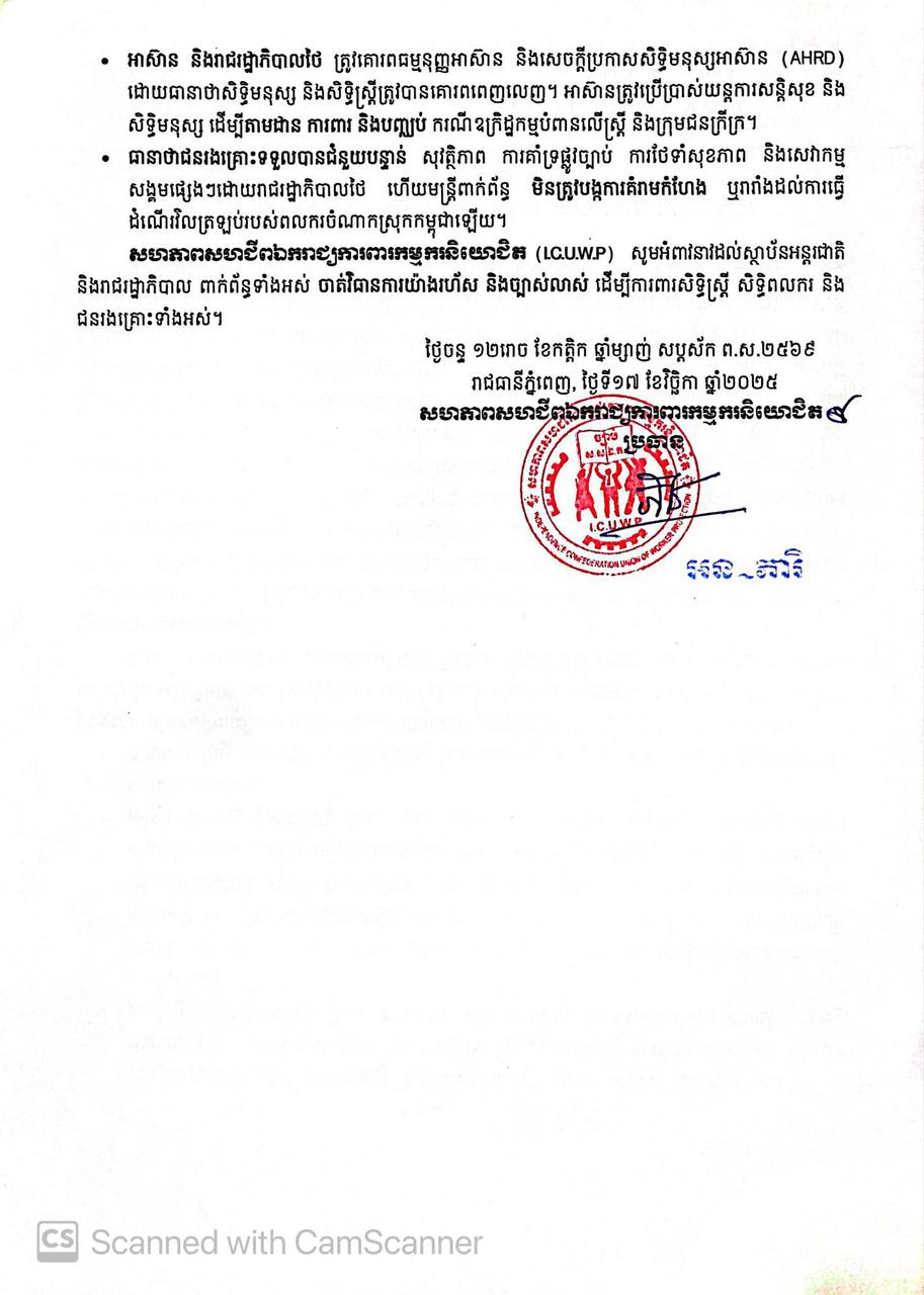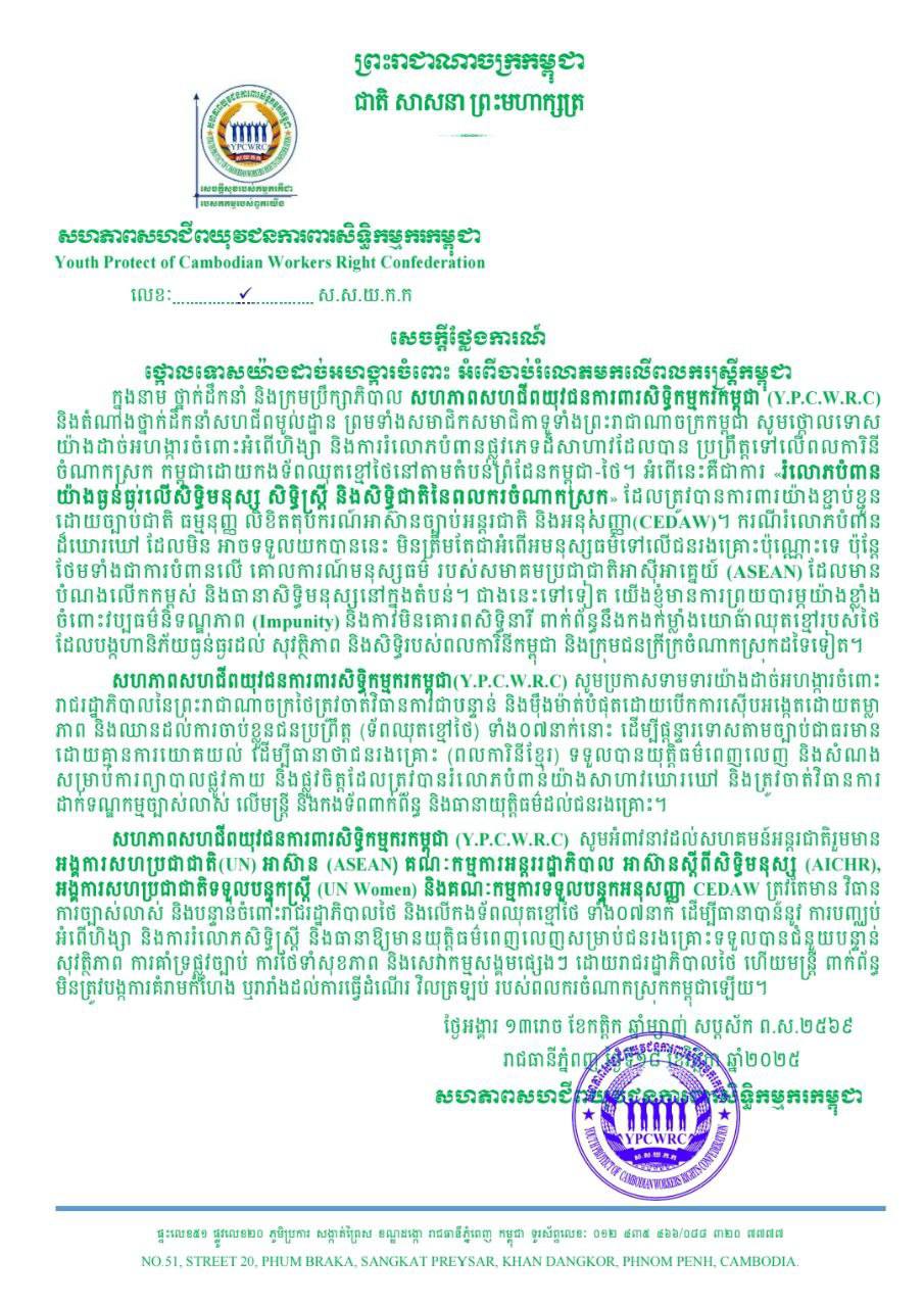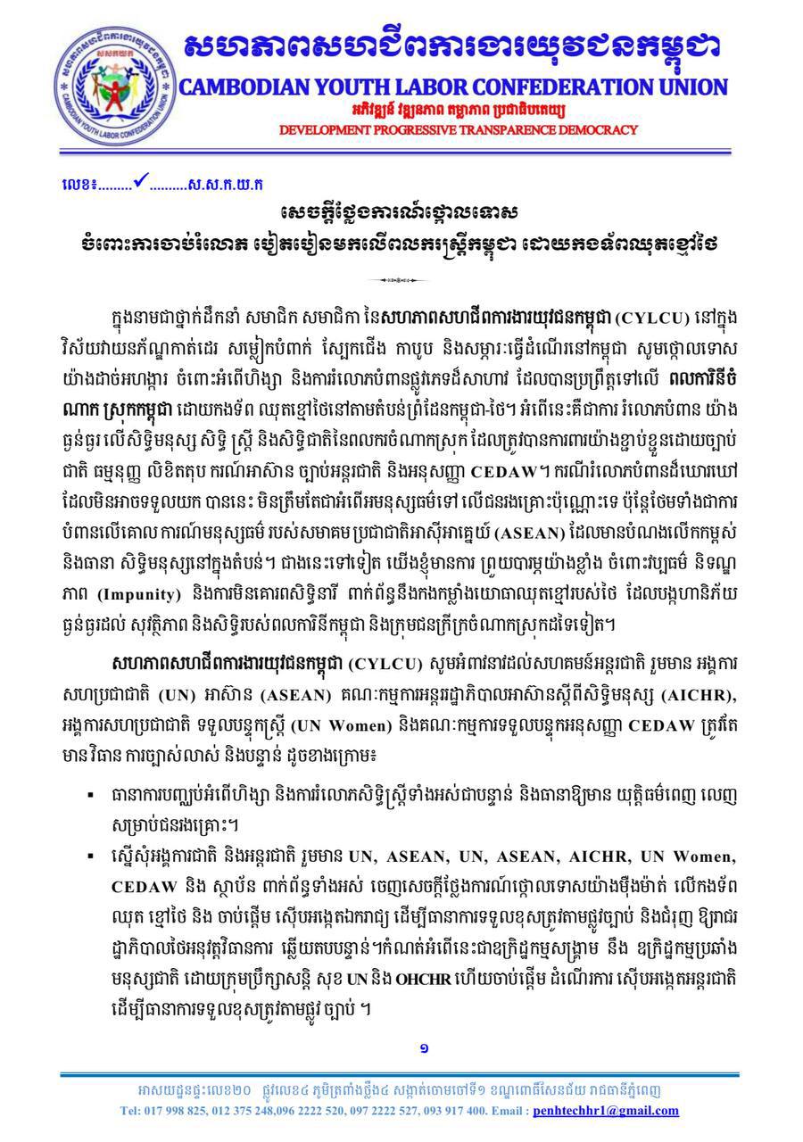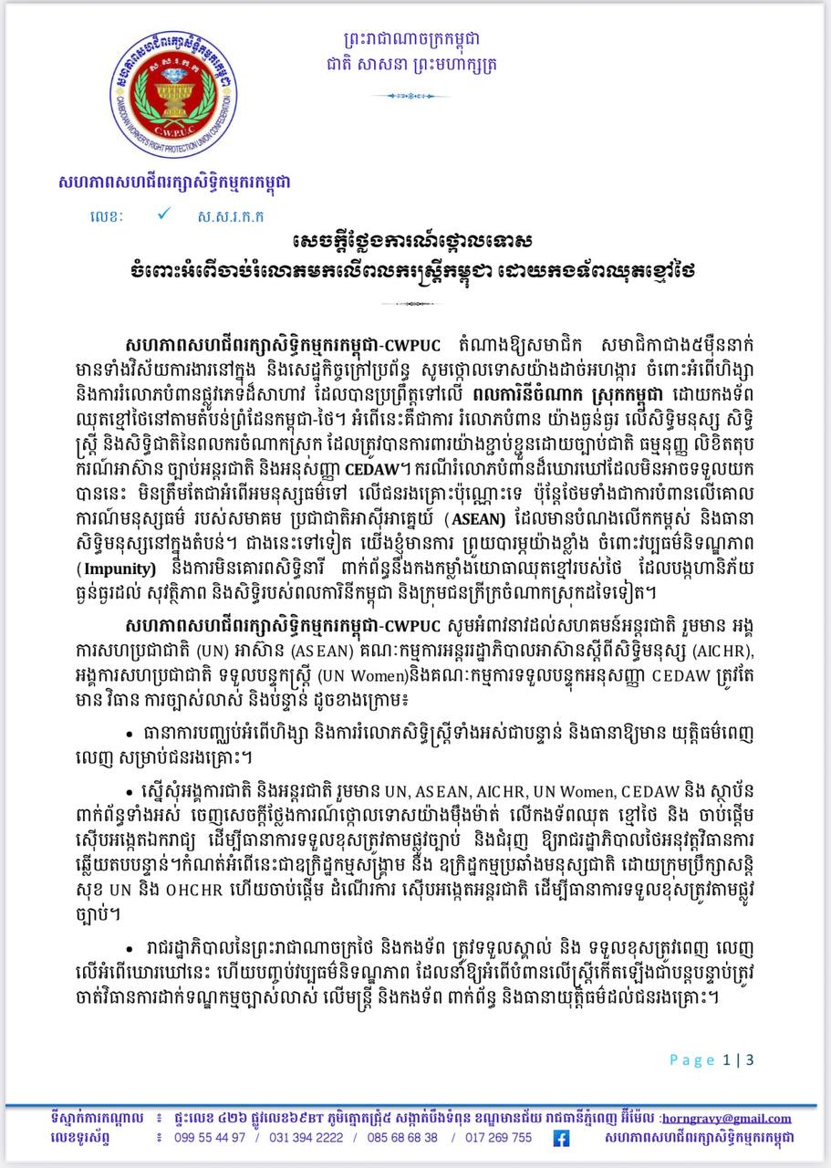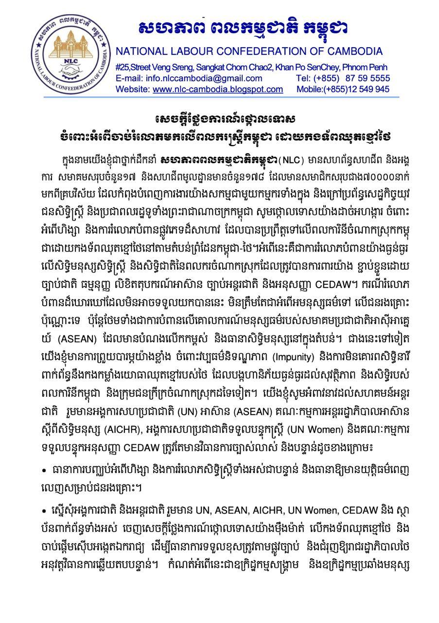 សហជីពនៅកម្ពុជា ថ្កោលទោសយ៉ាងដាច់អហង្ការ ចំពោះអំពើចាប់រំ.លោ.ភបូកលើពលករស្ត្រីកម្ពុជាដោយកងទ័ពឈុតខ្មៅថៃ