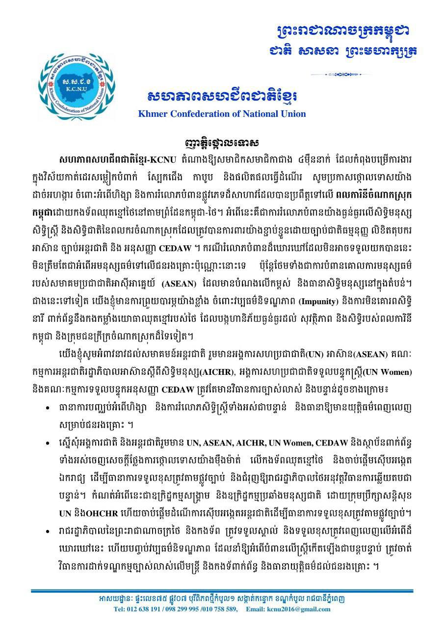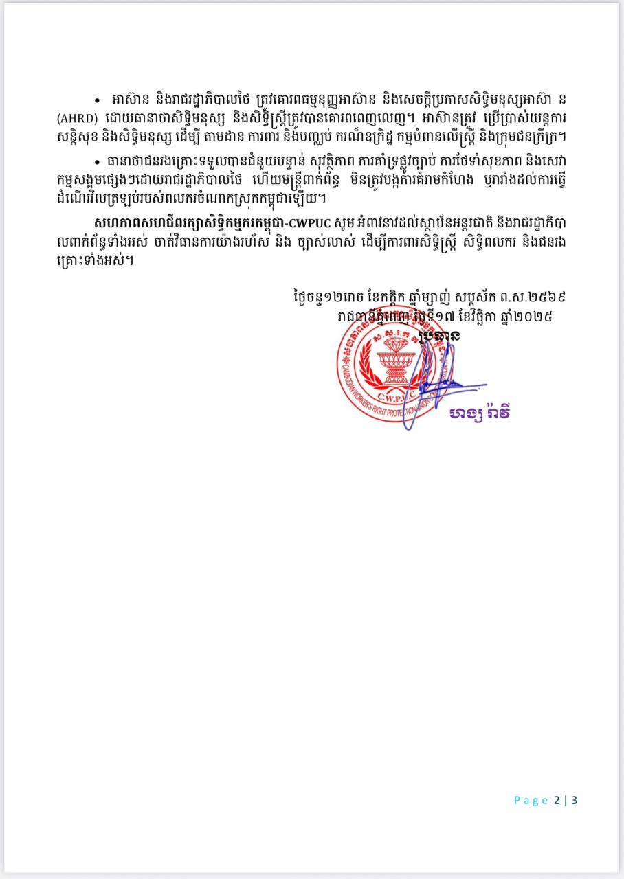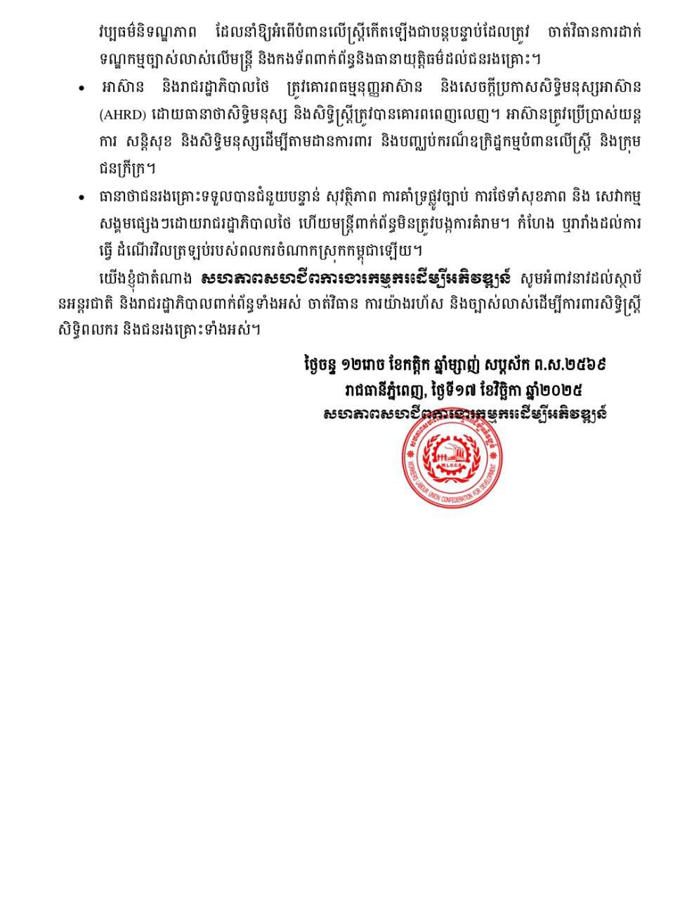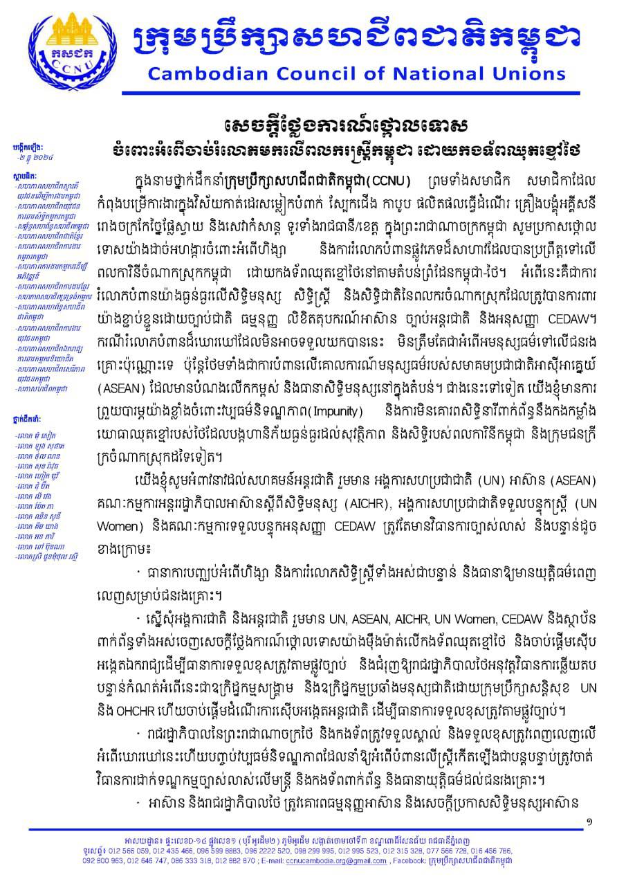 សហជីពនៅកម្ពុជា ថ្កោលទោសយ៉ាងដាច់អហង្ការ ចំពោះអំពើចាប់រំ.លោ.ភបូកលើពលករស្ត្រីកម្ពុជាដោយកងទ័ពឈុតខ្មៅថៃ